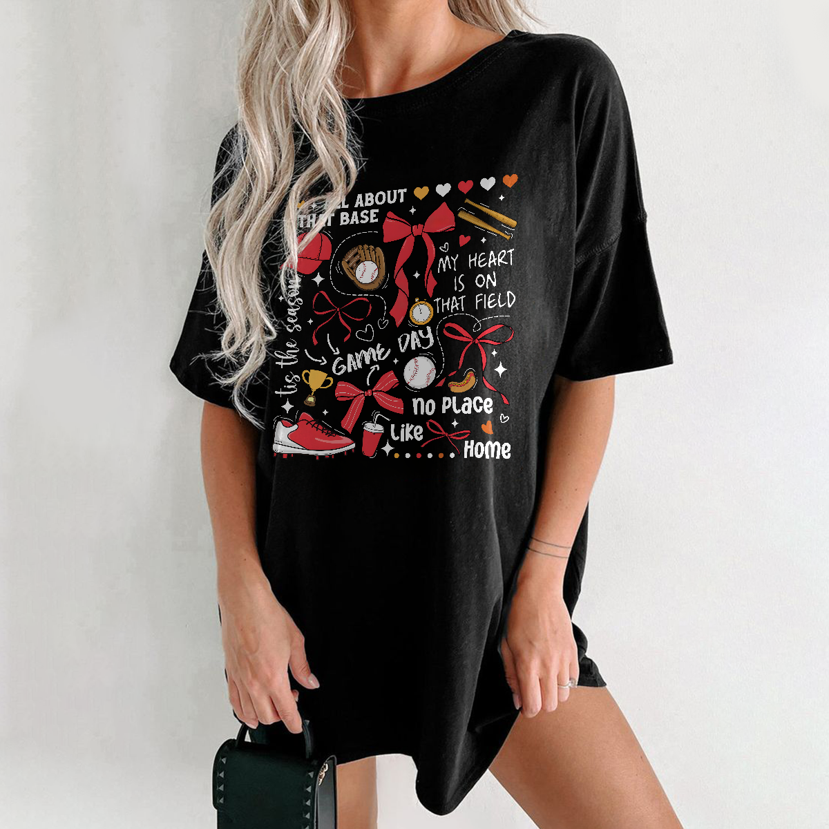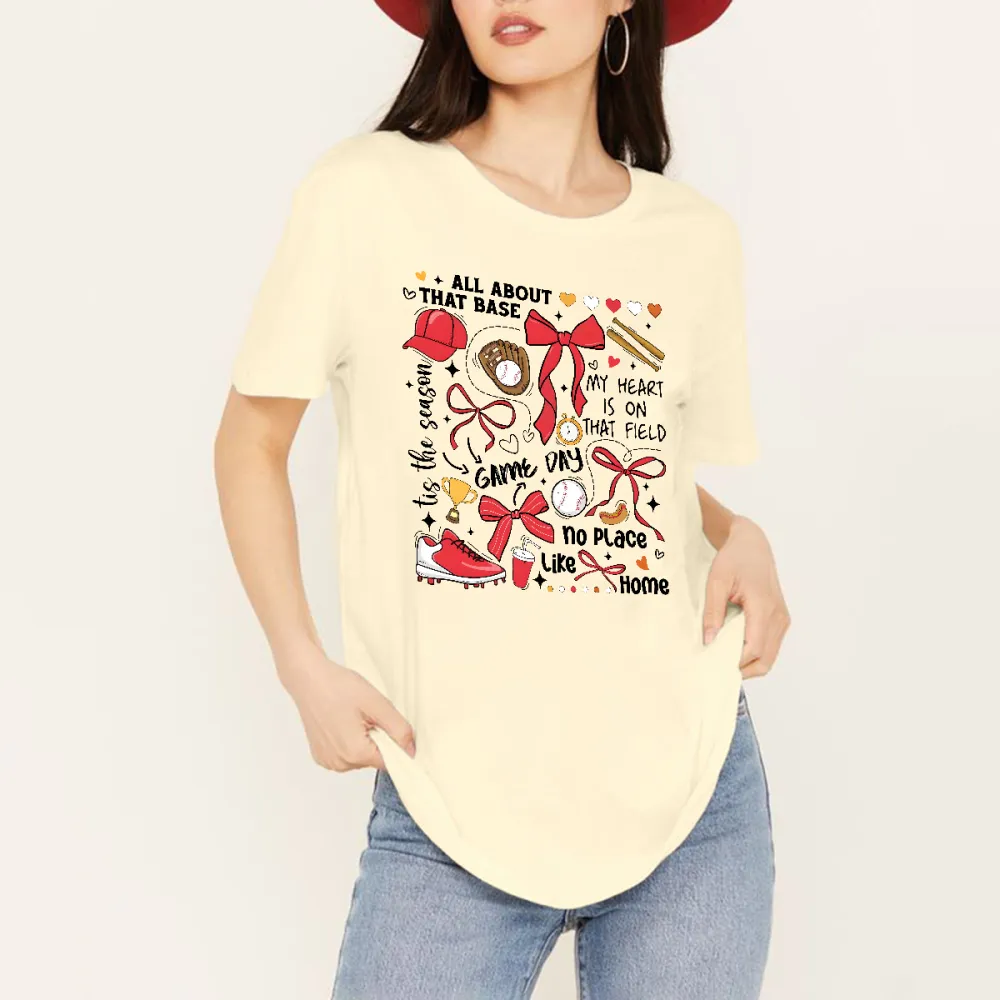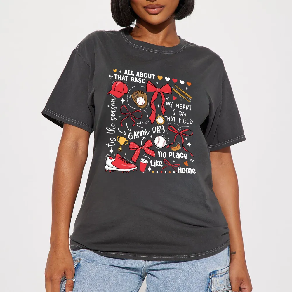 "All About That Base", "The Coach", "Chic Vip", "My Heart Is On That Field", "No Place Like Home", Baseball, Baseball Glove, Baseball Bat, And Red Bow Combination Pattern, Casual T-Shirt.