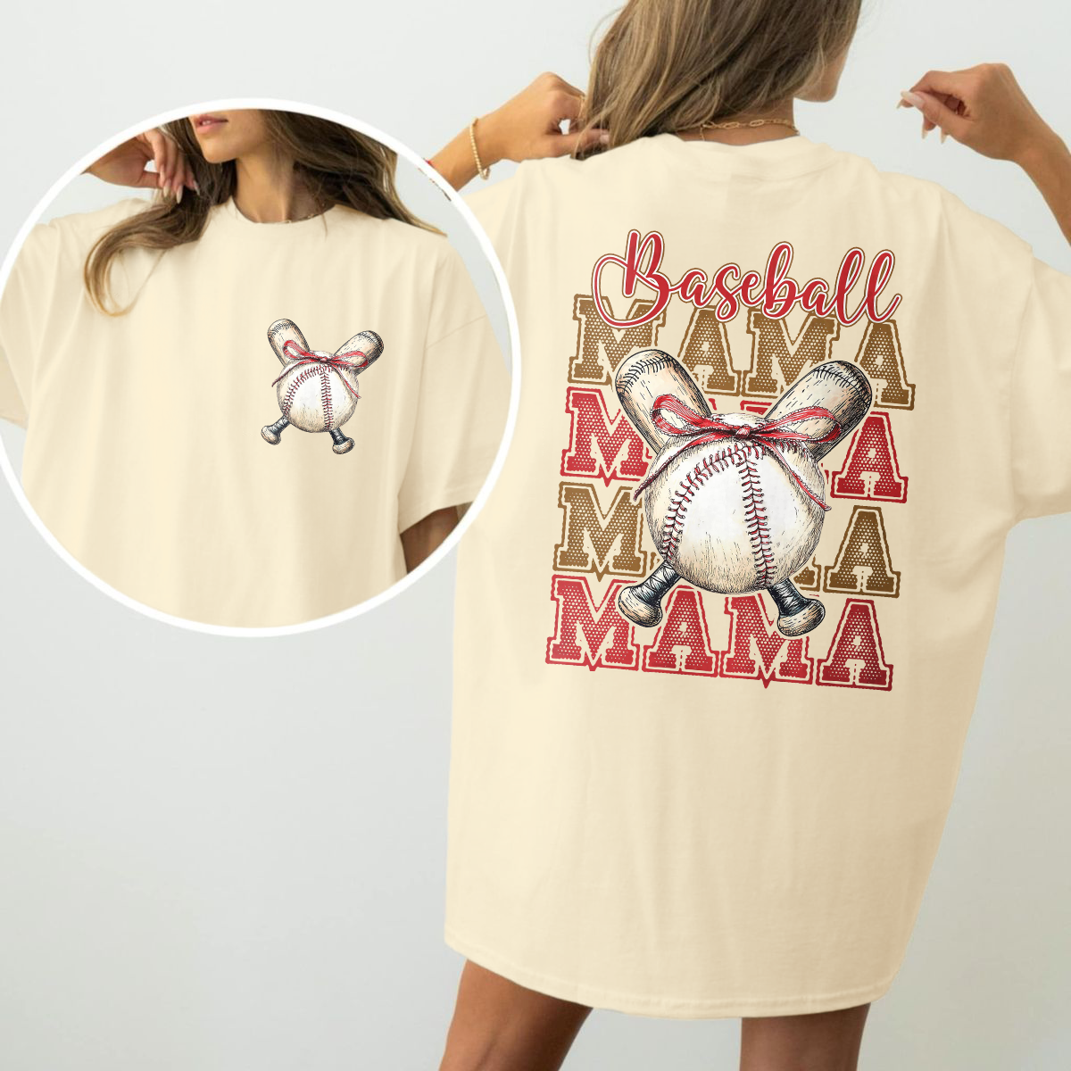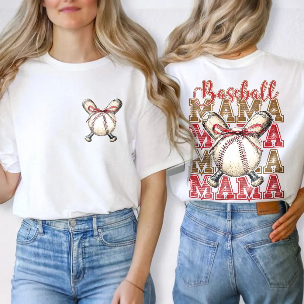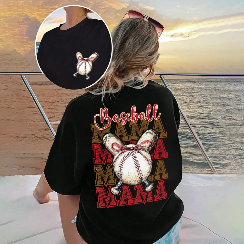 "Baseball", "Mama", Slogans And Two Baseball Gloves Crossed With A Baseball In The Middle, Gloves And Baseball Tied With A Red Bow Combination Pattern, Casual T-Shirt.