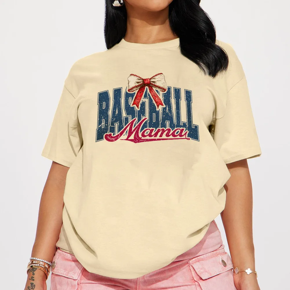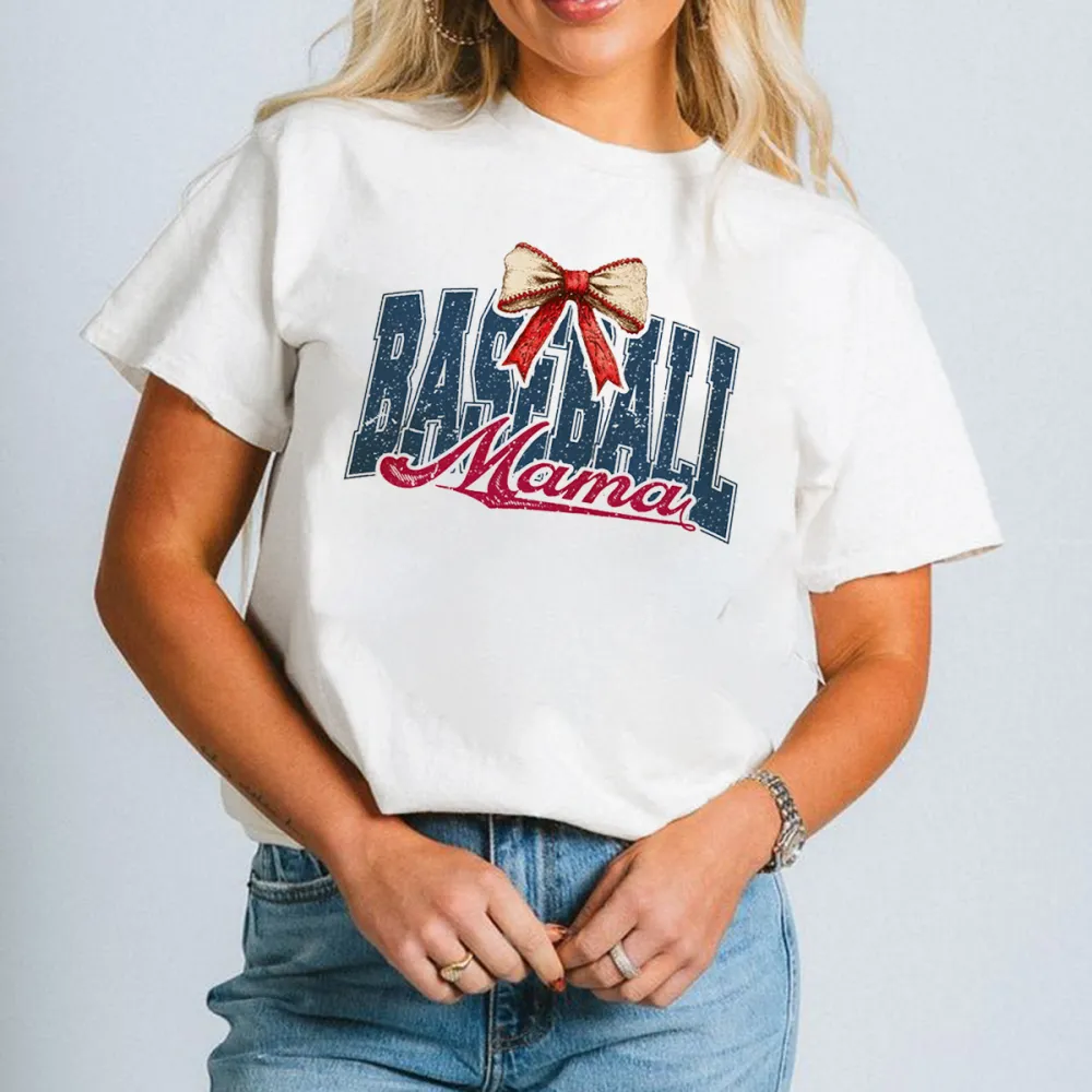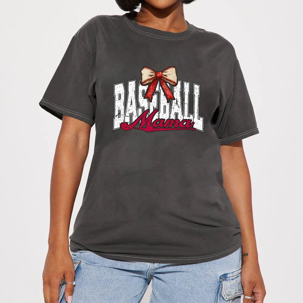 "Baseball Mama", Slogan And A Bow Pattern With Red Stitching, Casual T-Shirt.