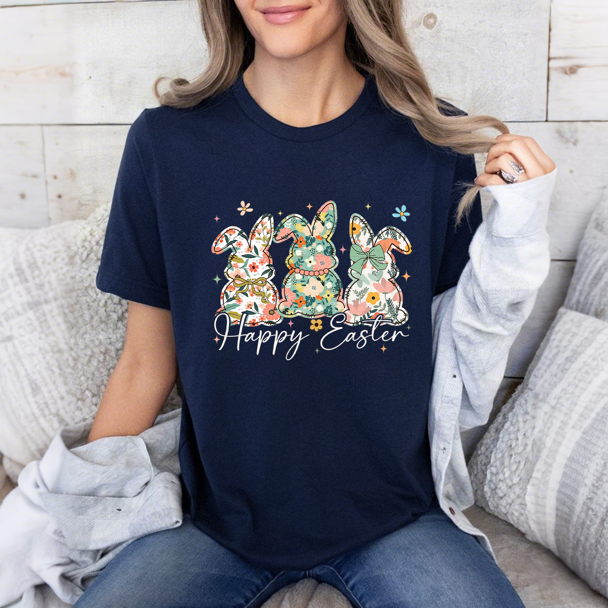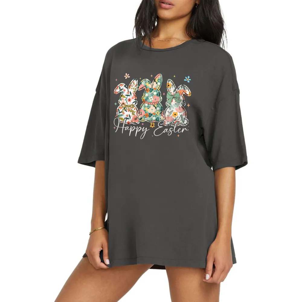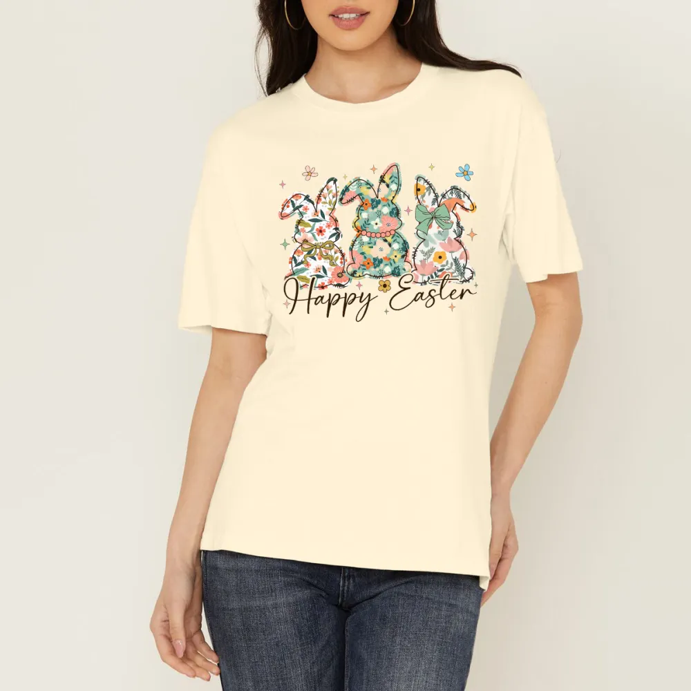 "Happy Easter", Slogan And Three Rabbits Decorated With Floral Pattern, Casual T-Shirt.