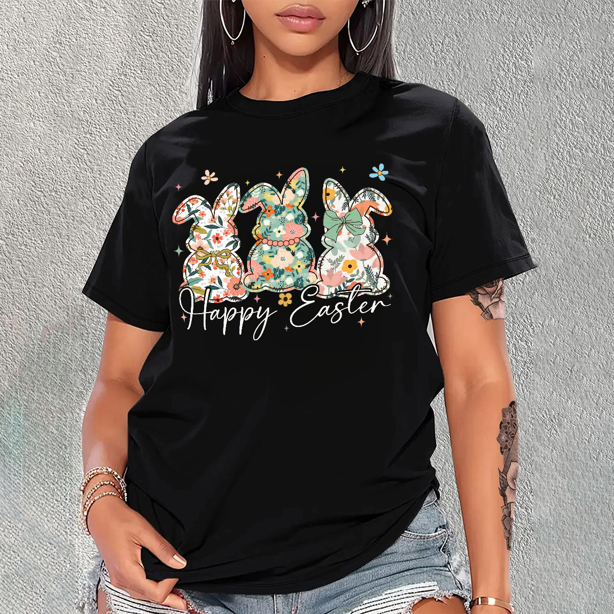 "Happy Easter", Slogan And Three Rabbits Decorated With Floral Pattern, Casual T-Shirt. 9515228