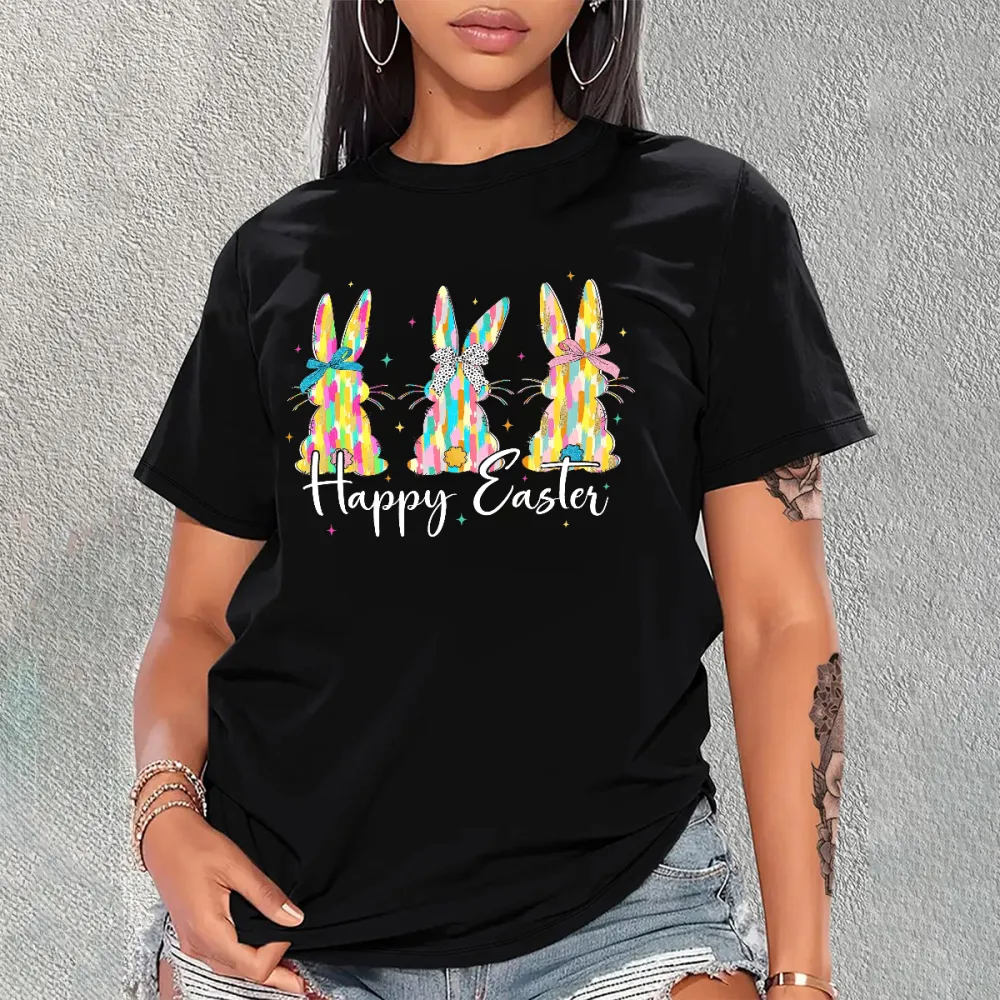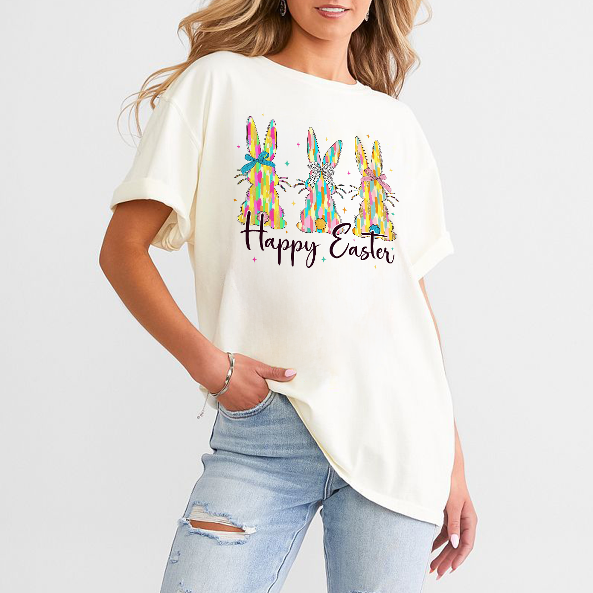 "Happy Easter" Slogan And Three Colorful Bunnies Graphic On Casual T-Shirt. 9515198