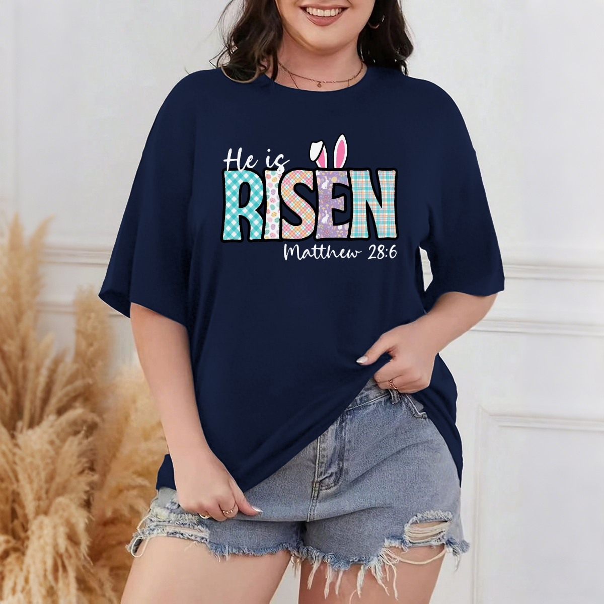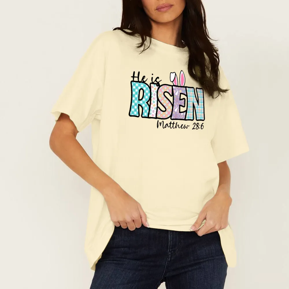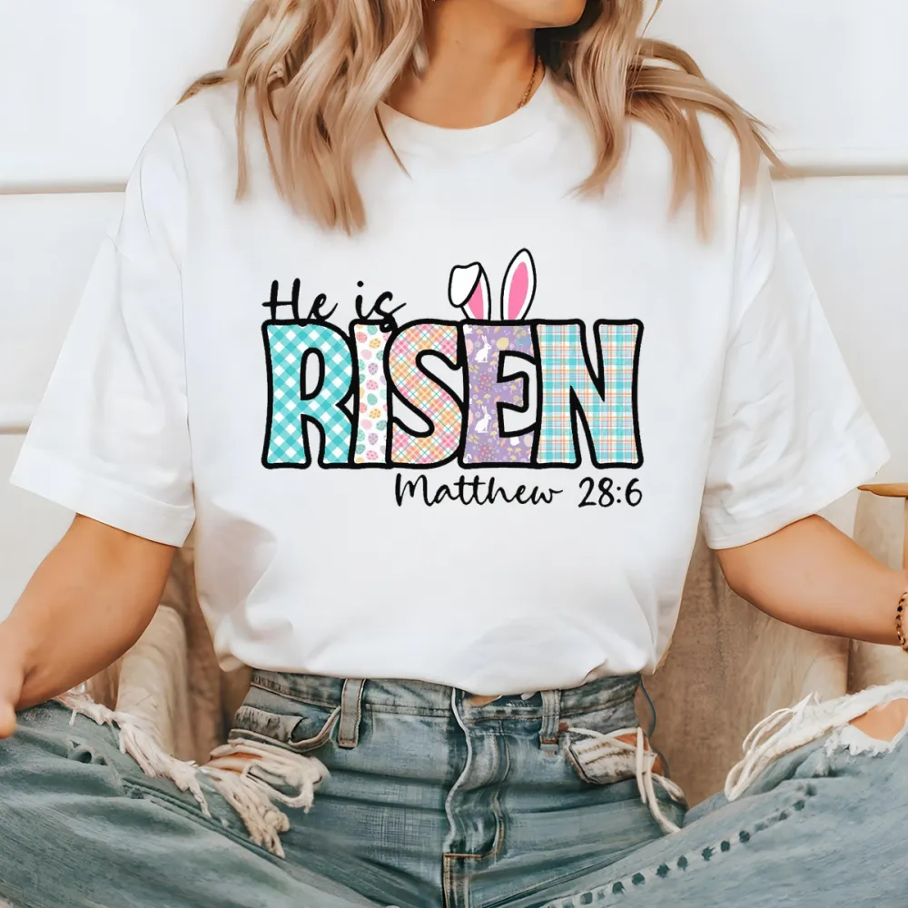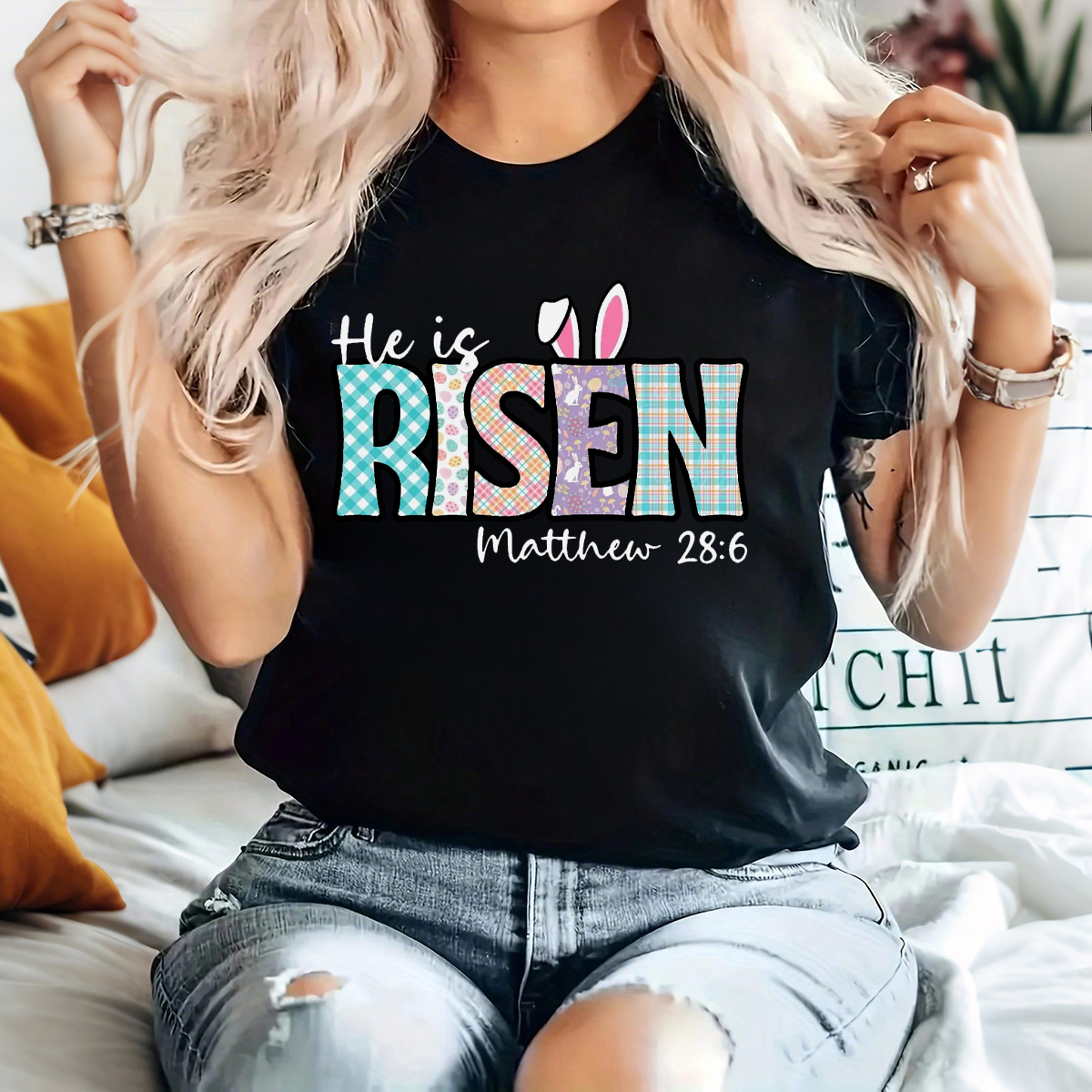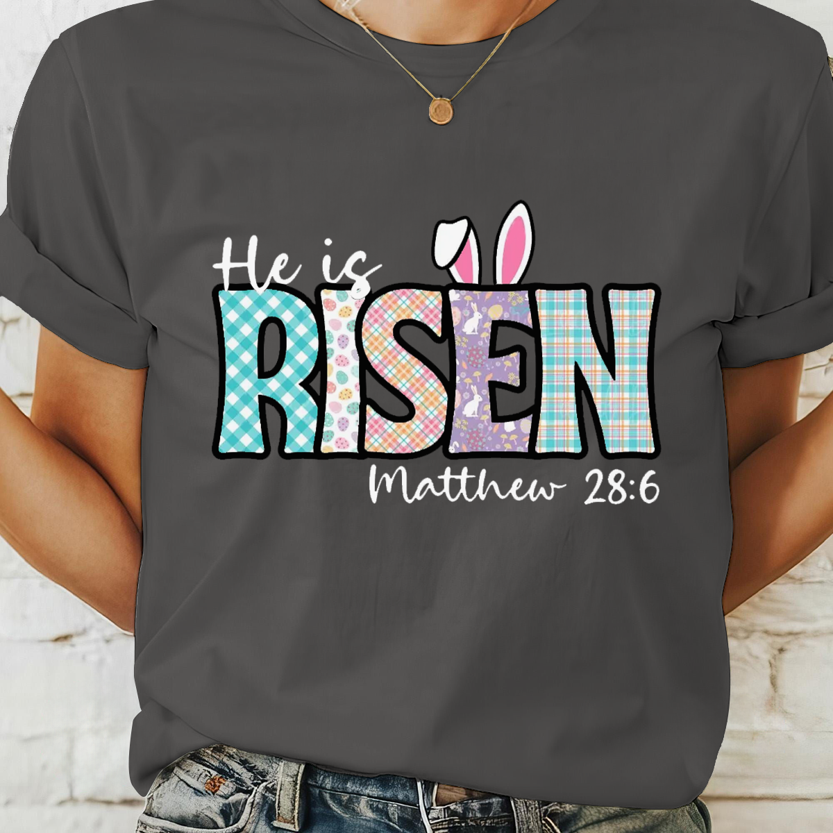 "He Is Risen", "Matthew 28:6", The Letters In The Pattern Use A Variety Of Plaid Patterns And Rabbit Ears Elements, Casual T-Shirt.