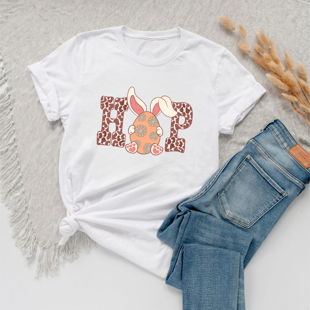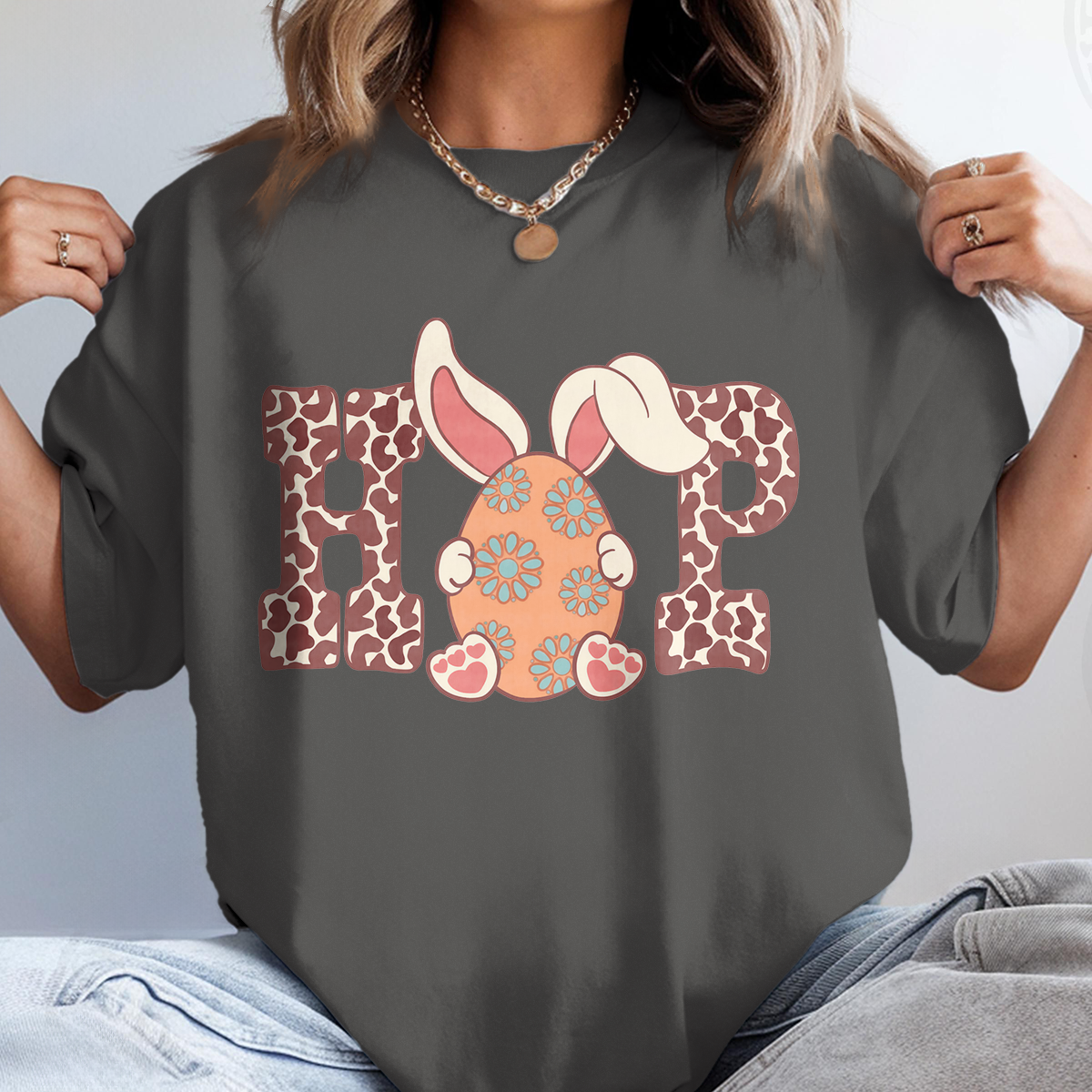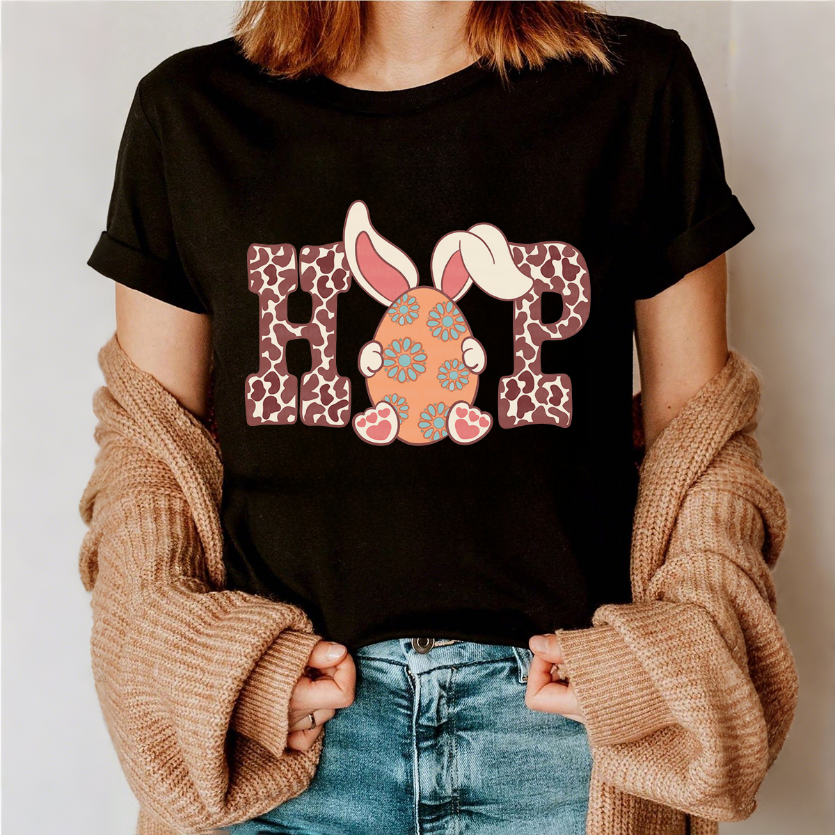 "Hop", The Slogan Is Designed With Leopard And Cow Prints, A Combination Of Rabbit Ears And Flower-Decorated Easter Eggs, And A Casual T-Shirt.