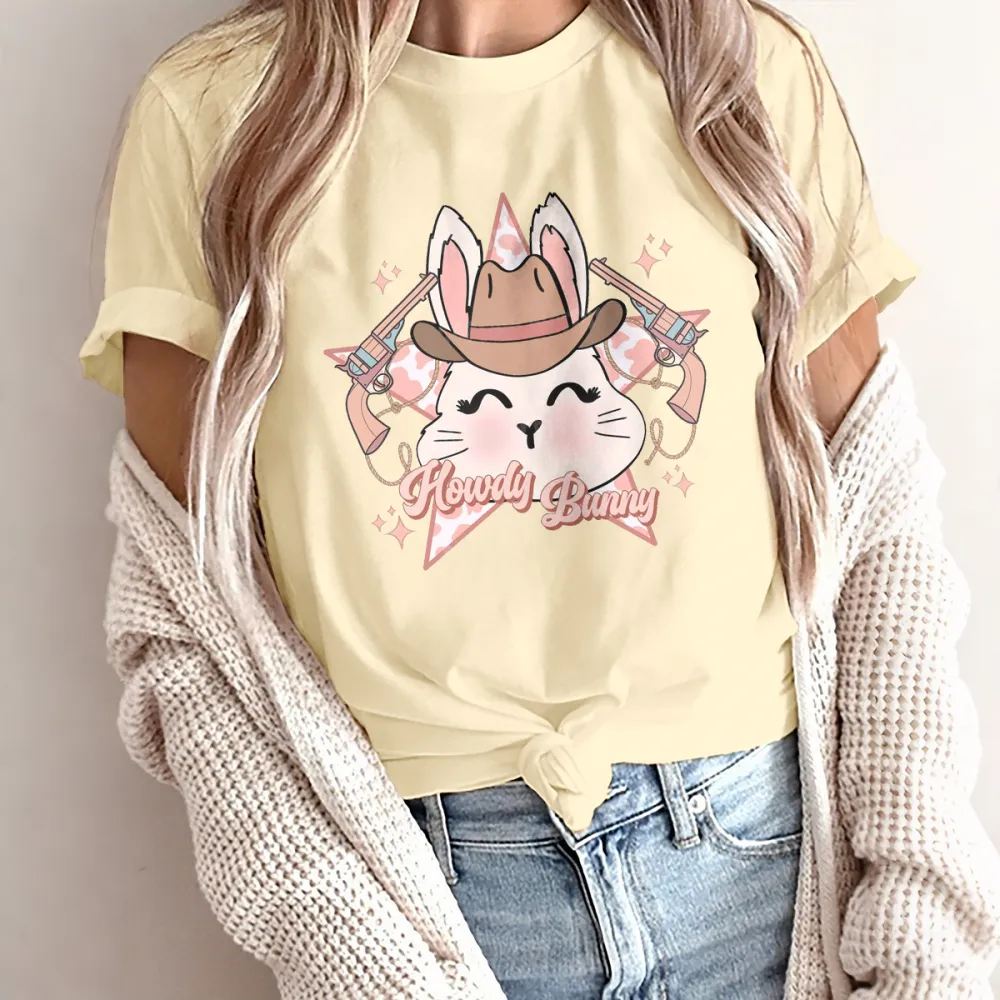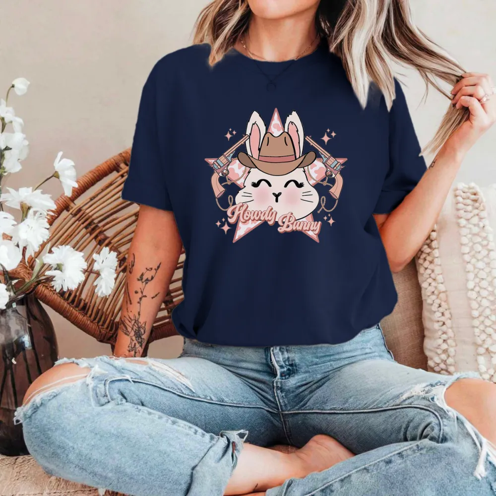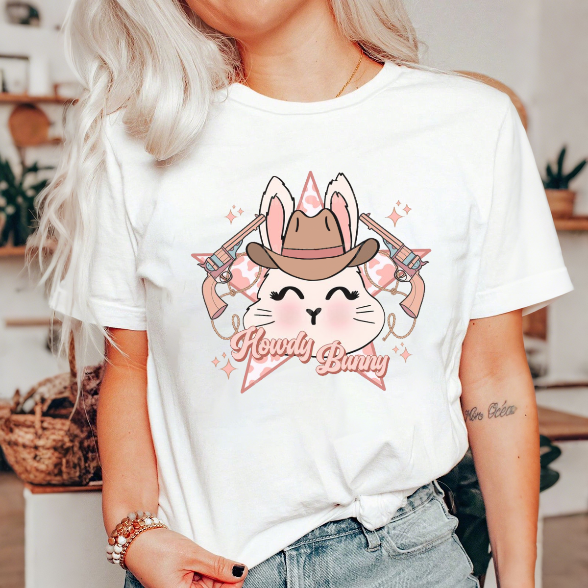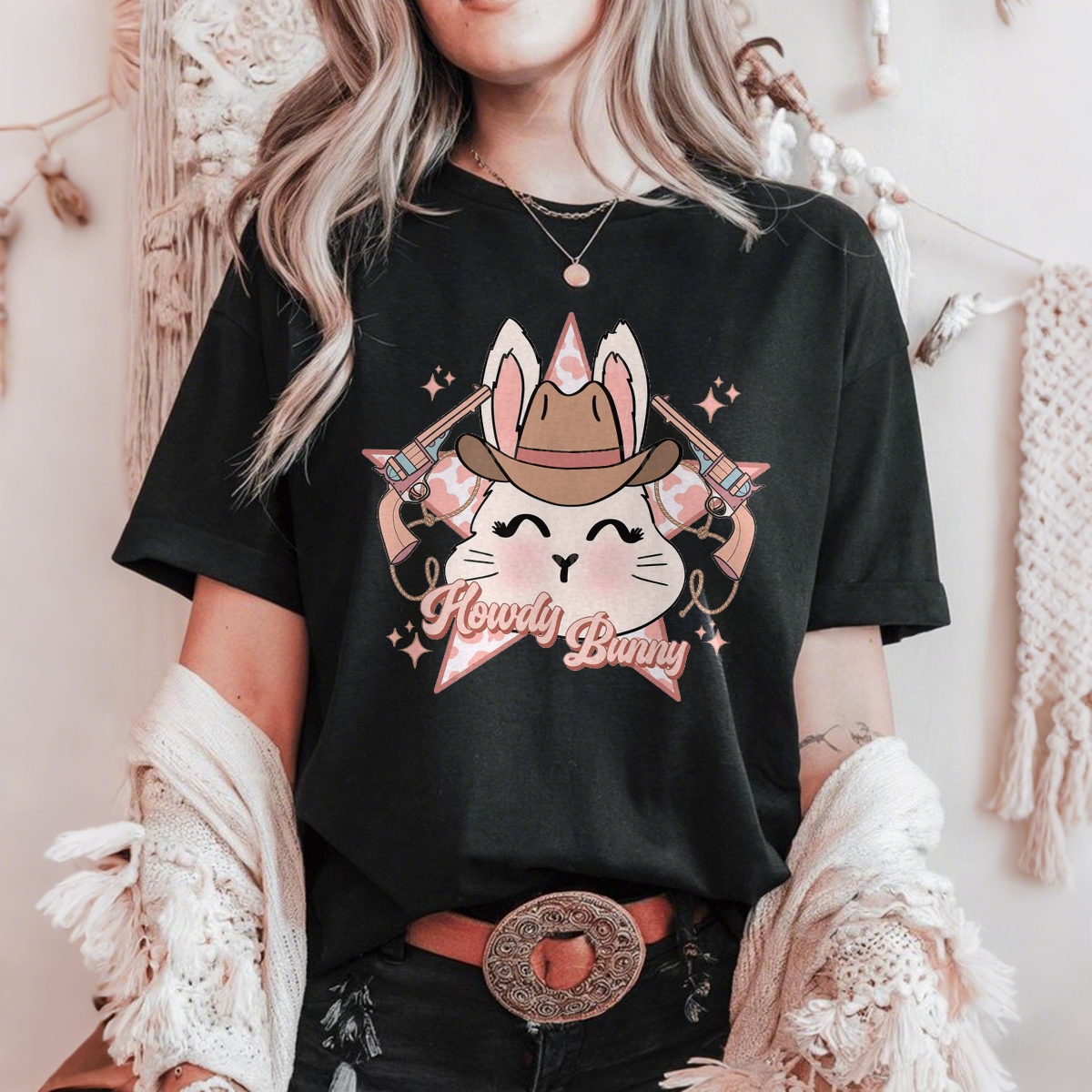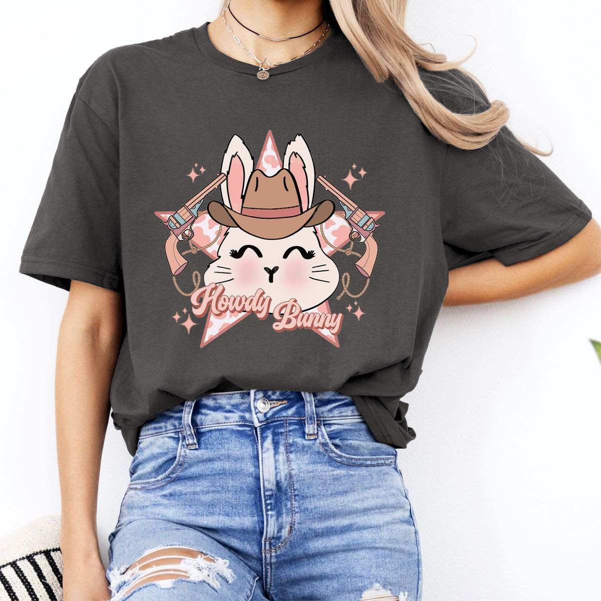"Howdy Bunny", Bunny Pattern In Cowboy Hat With Pistol Cartoon And Stars On Both Sides, Western Cowboy, Casual T-Shirt.