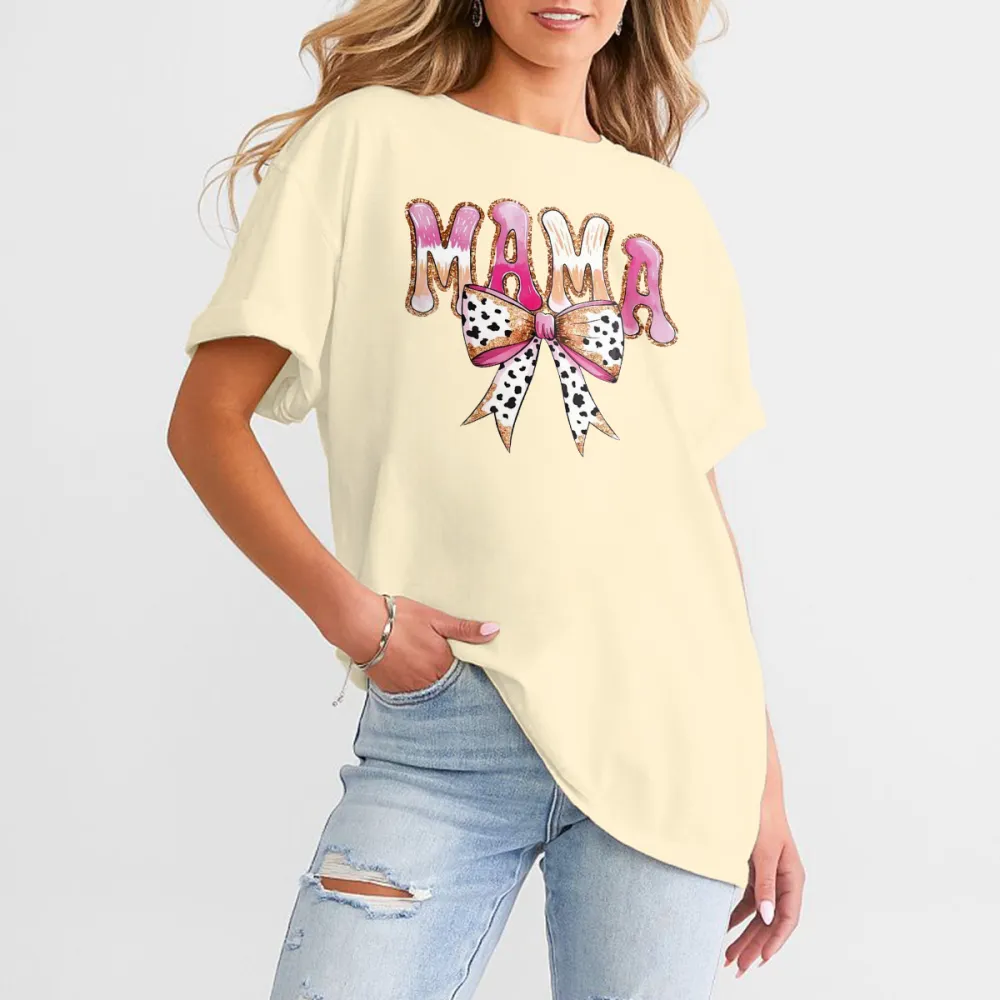 "Mama", Colorful Letters, Pink, Gold Gradient Effect And Leopard Print, Pink Bow Pattern, Casual T-Shirt