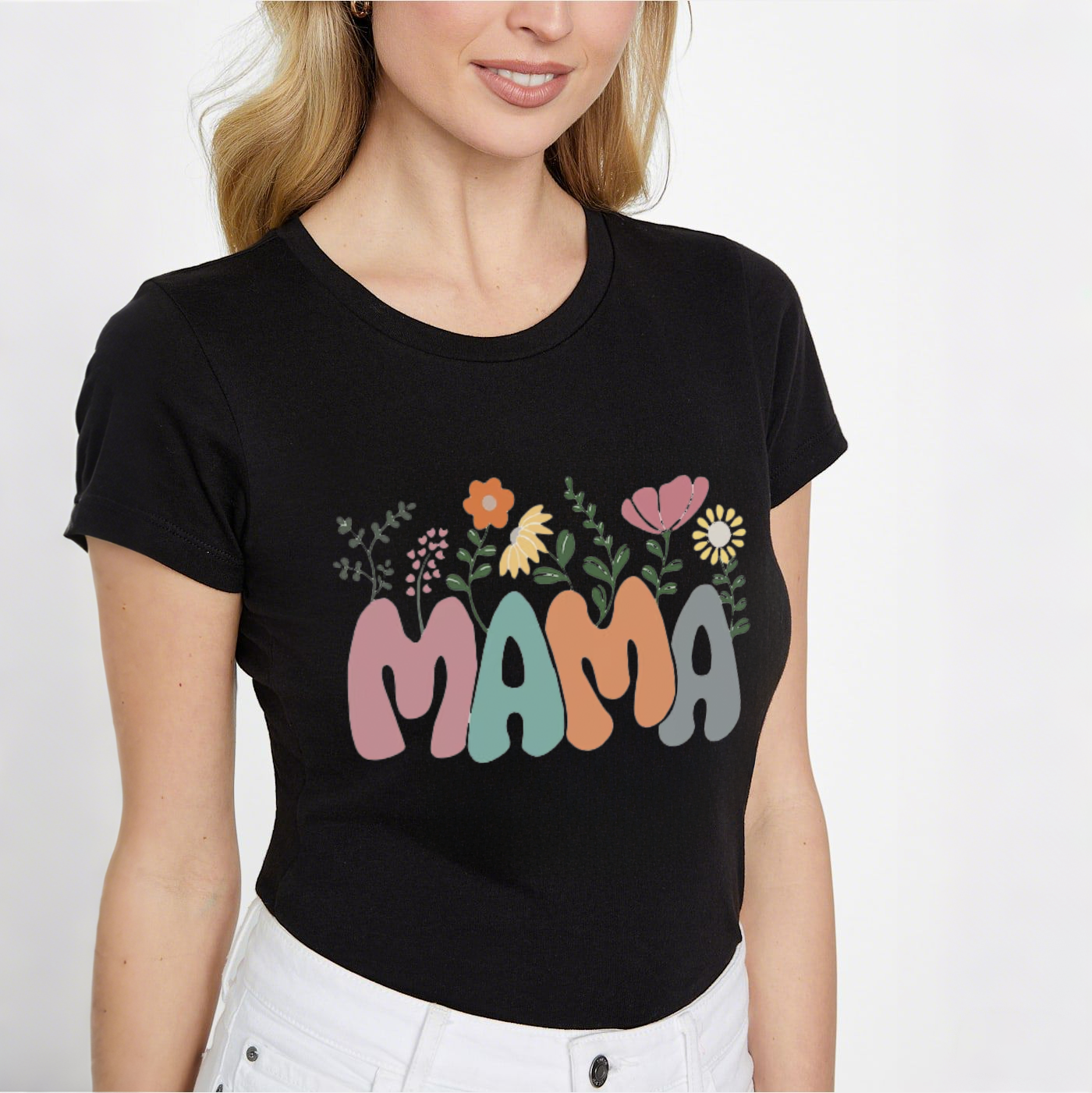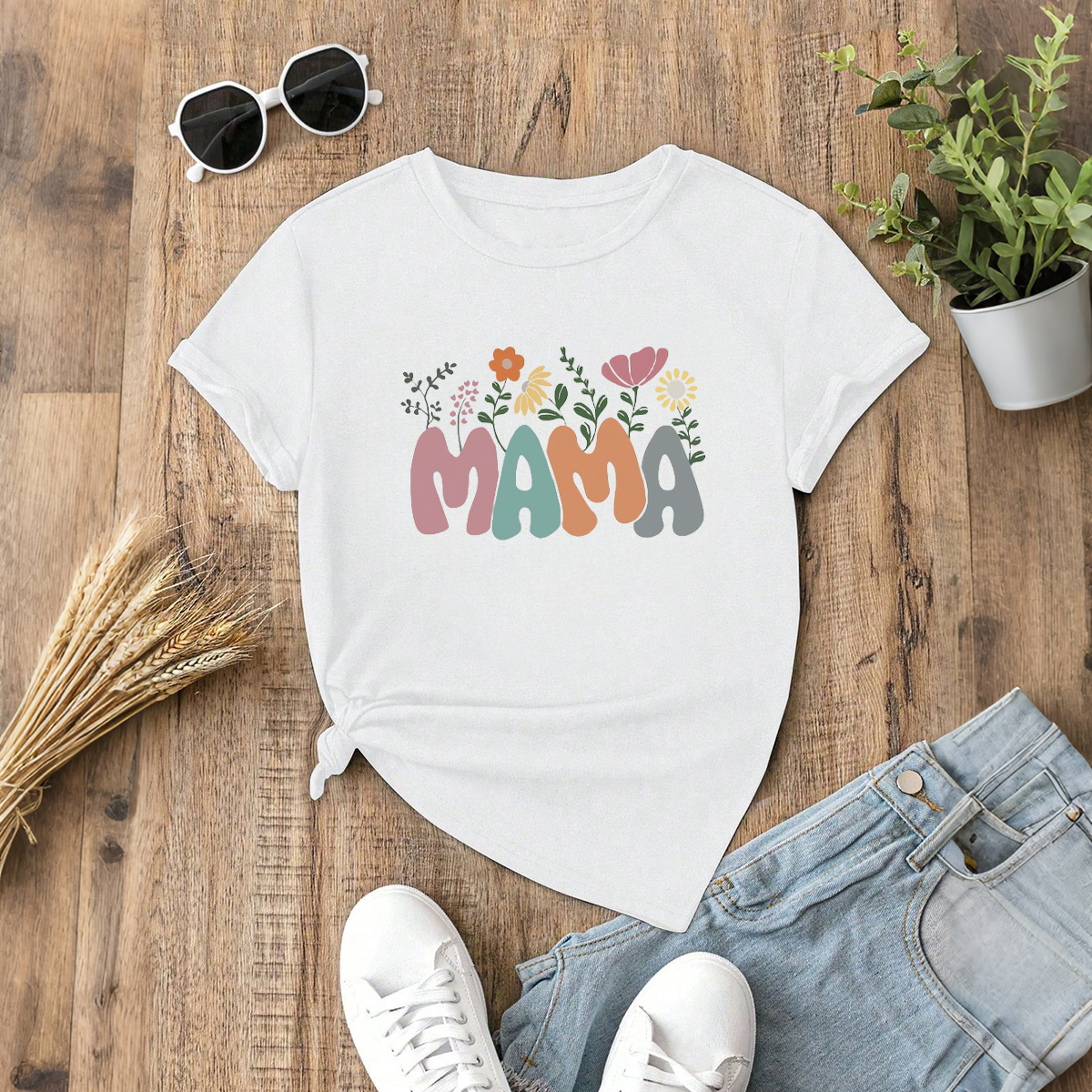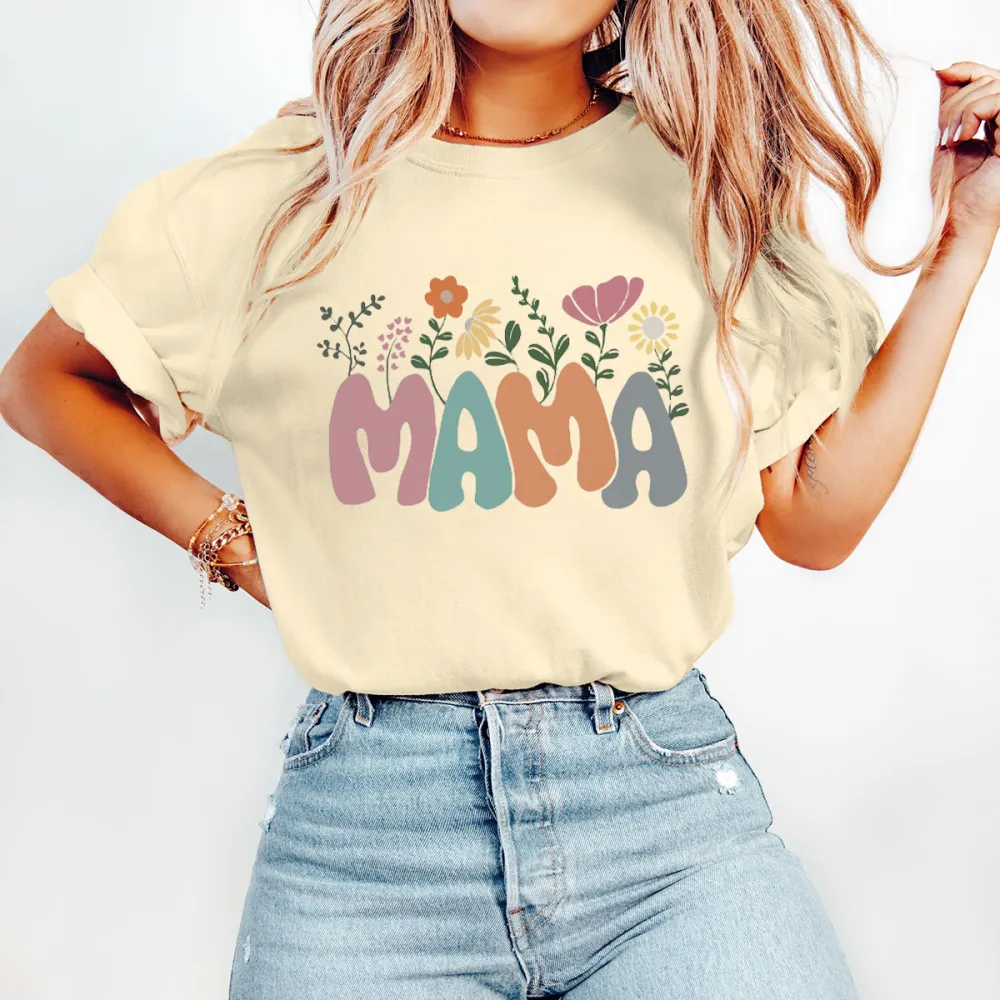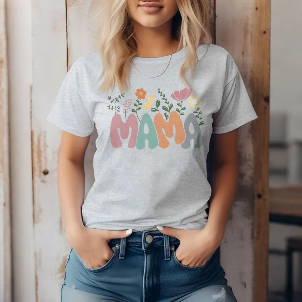 "MAMA", composed of pink, turquoise and gray, with flowers, branches and leaves and other decorative patterns around the slogan, the overall style is fresh and cute, casual T-shirt.