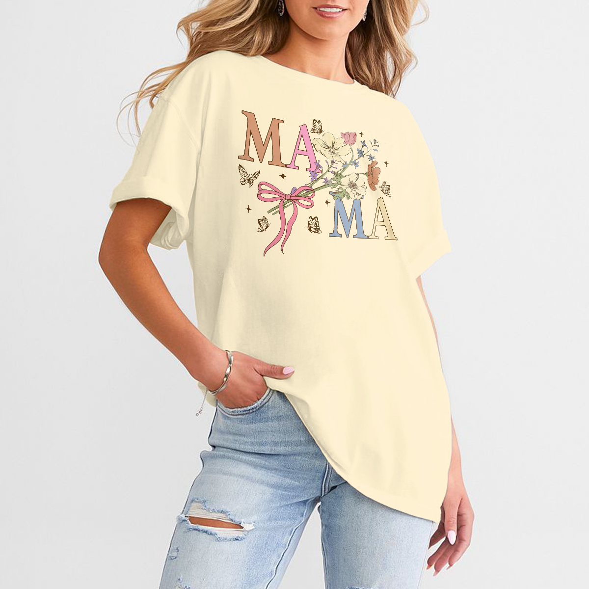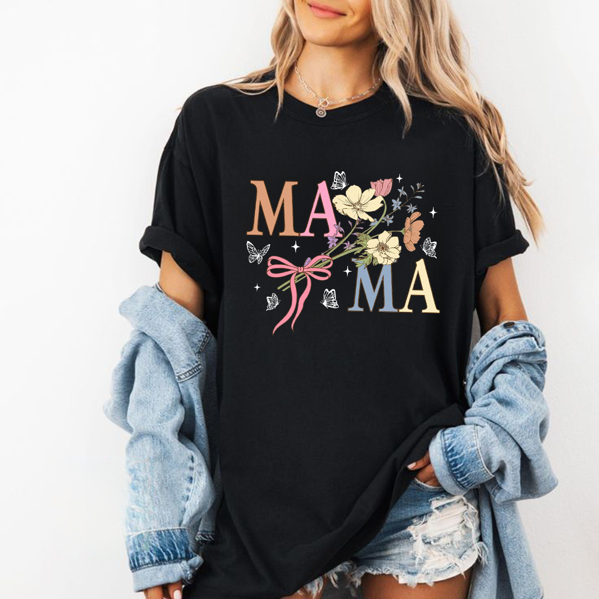 "Mama", Letters In Various Colors, A Bouquet Of Flowers Tied With A Pink Ribbon And Decorated With Butterflies And Small Stars, A Casual T-Shirt.