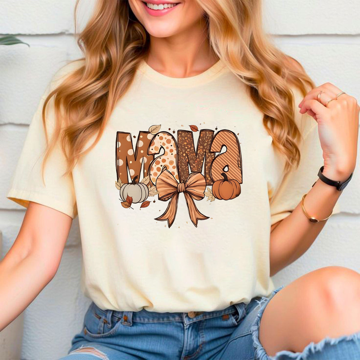 "Mama", Slogan Designed With Different Textures, Surrounded By A Combination Of Pumpkins, Autumn Leaves And An Orange Bow, Casual T-Shirt, Mommy T-Shirt.