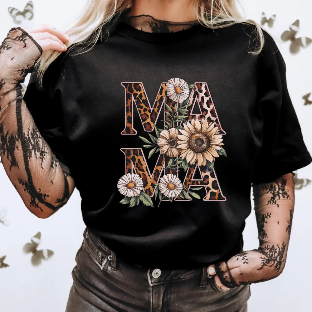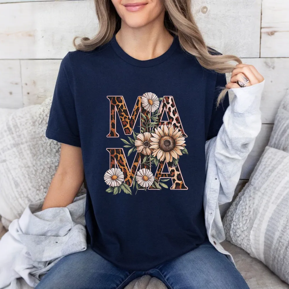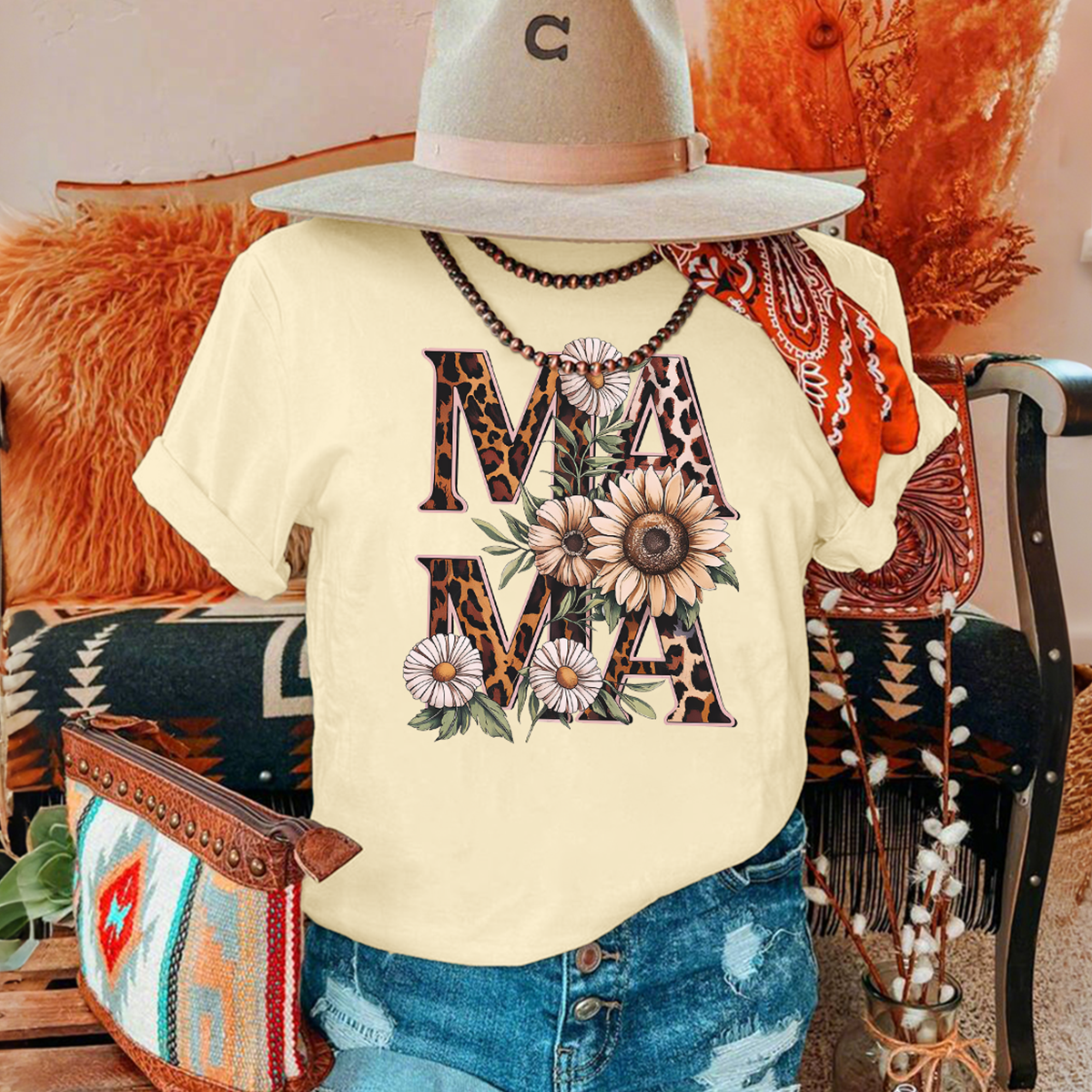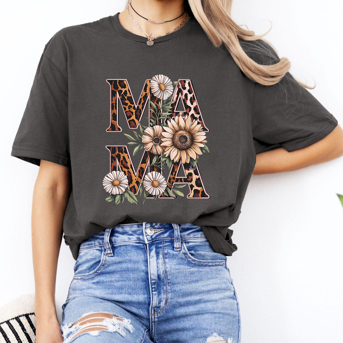 "Mama", The Letters Are In Leopard Print, With Daisies And Sunflowers Dotted Between The Letters, As Well As Green Branches And Leaves, Casual T-Shirt.