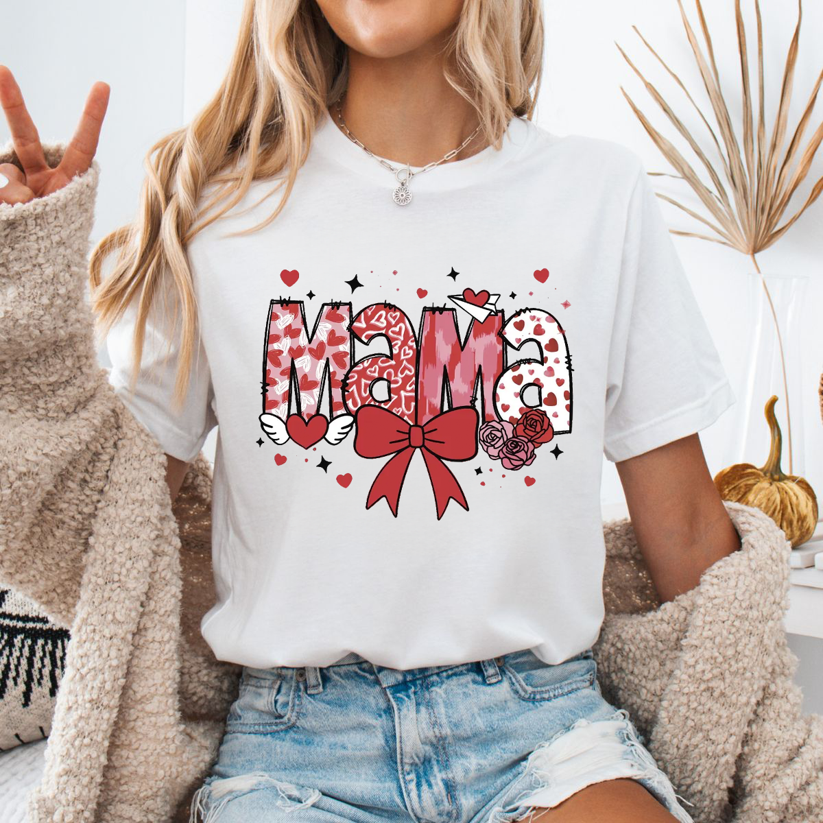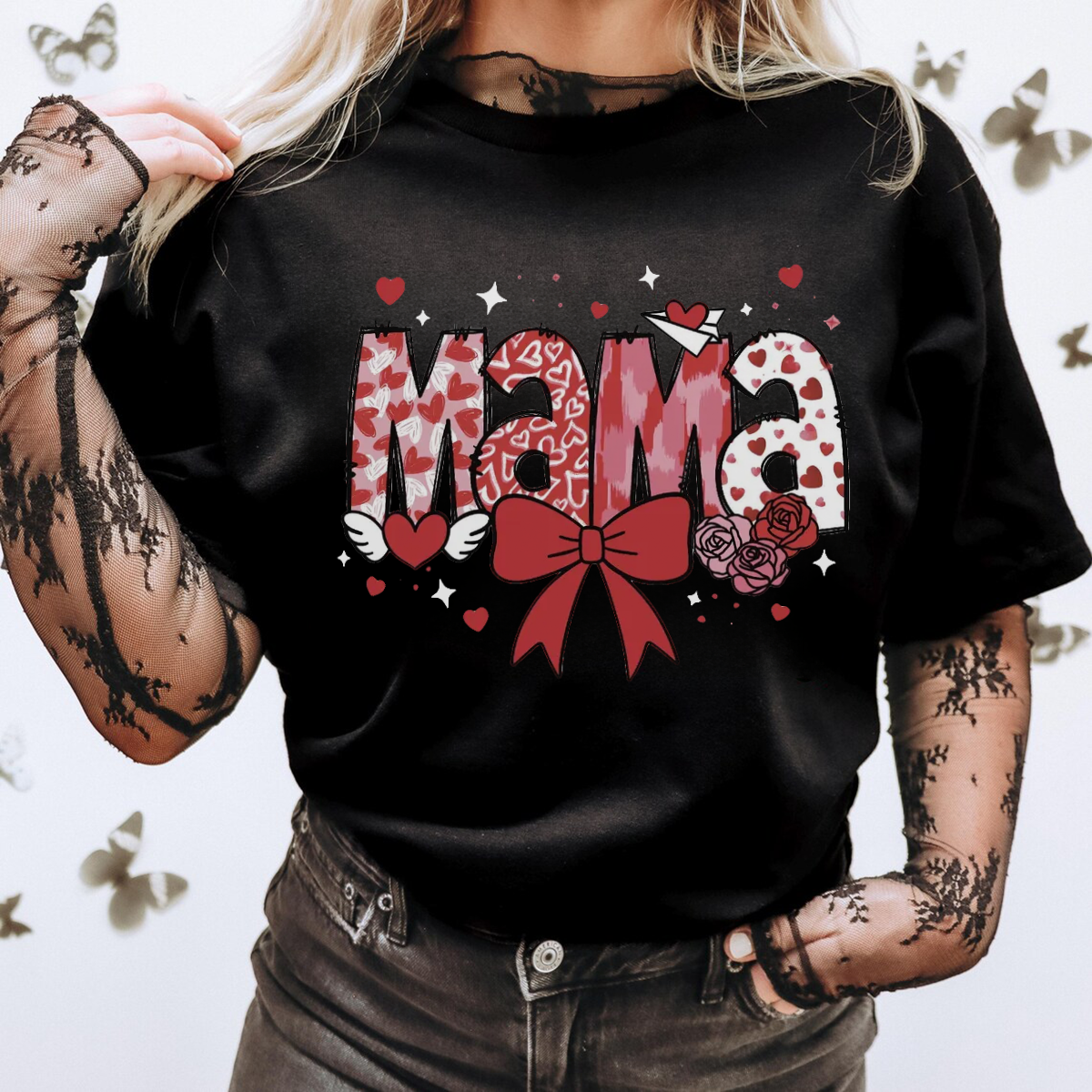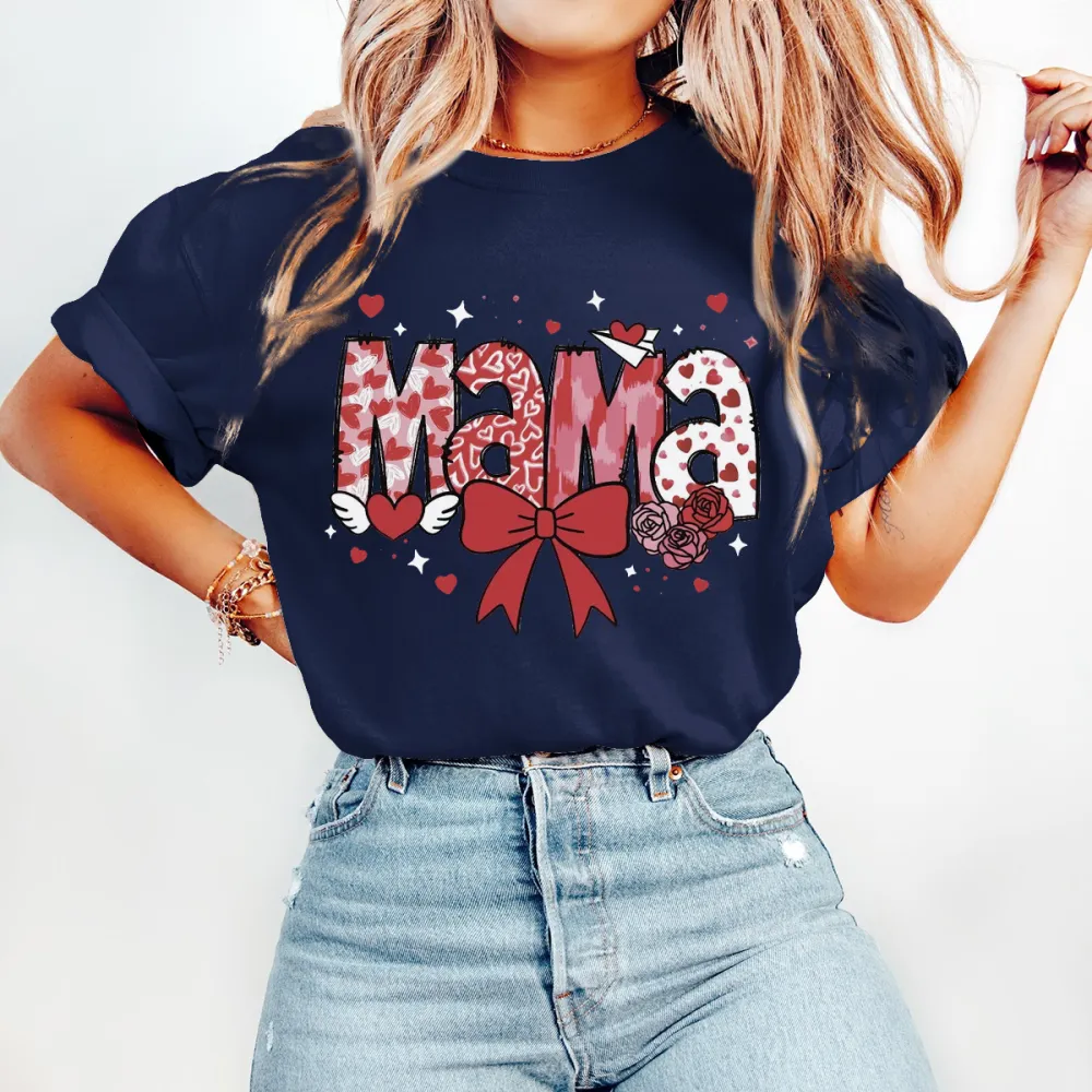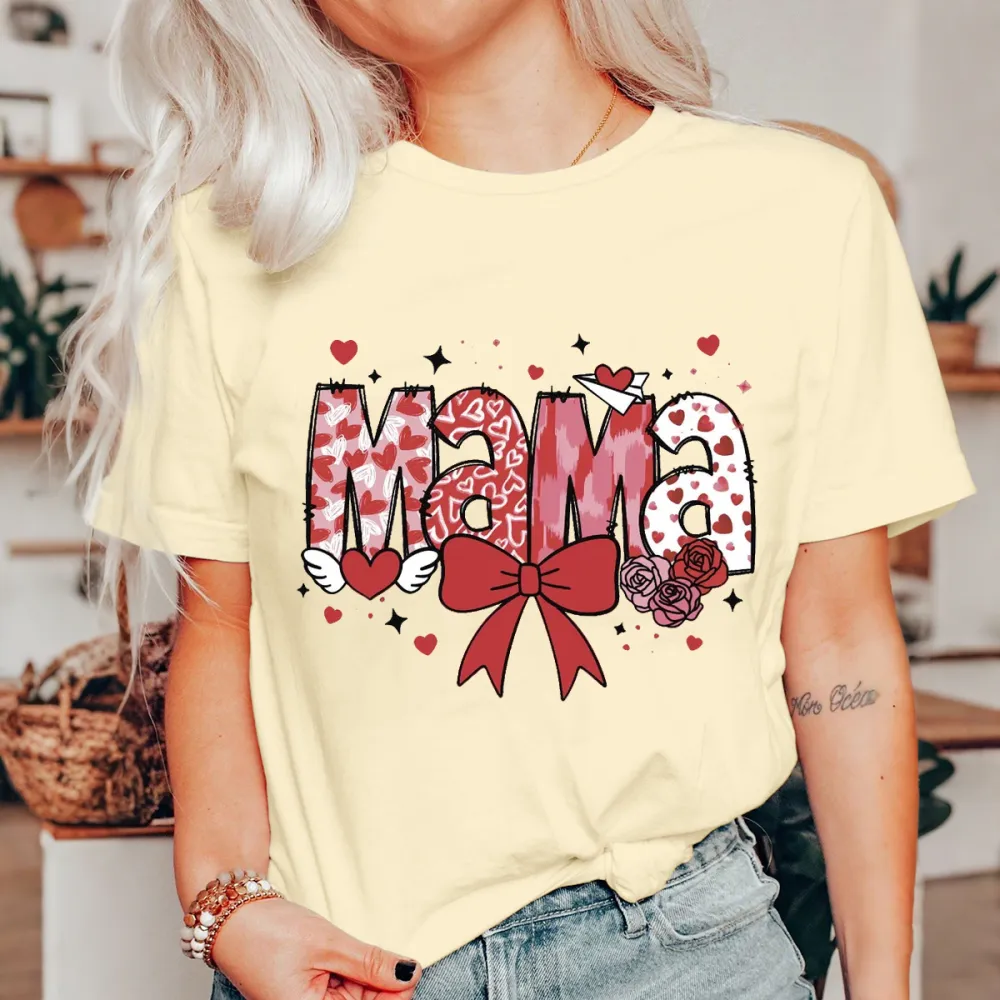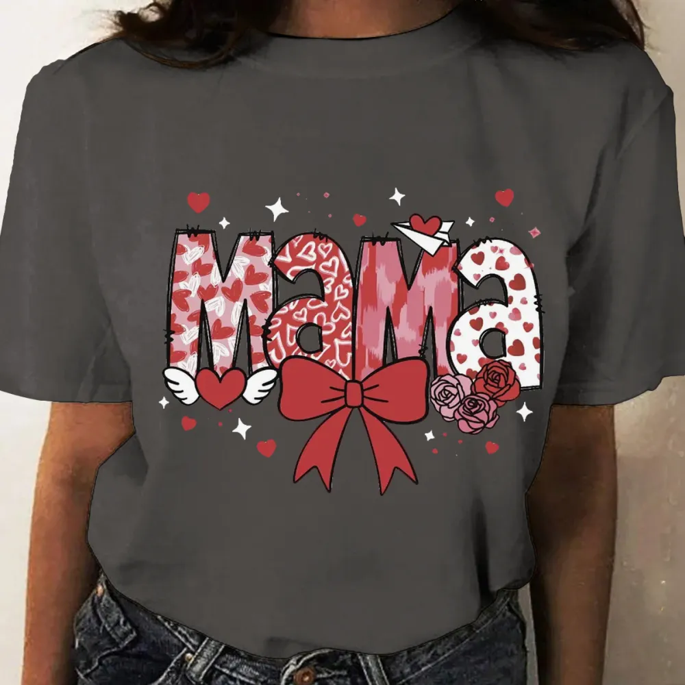 "Mama", The Letters Are Made Up Of Different Heart-Shaped Patterns, The Color Is Mainly Red And Red Bows, Rose Bouquets, Small Hearts, Hearts With Wings And Paper Airplanes, Casual T-Shirts