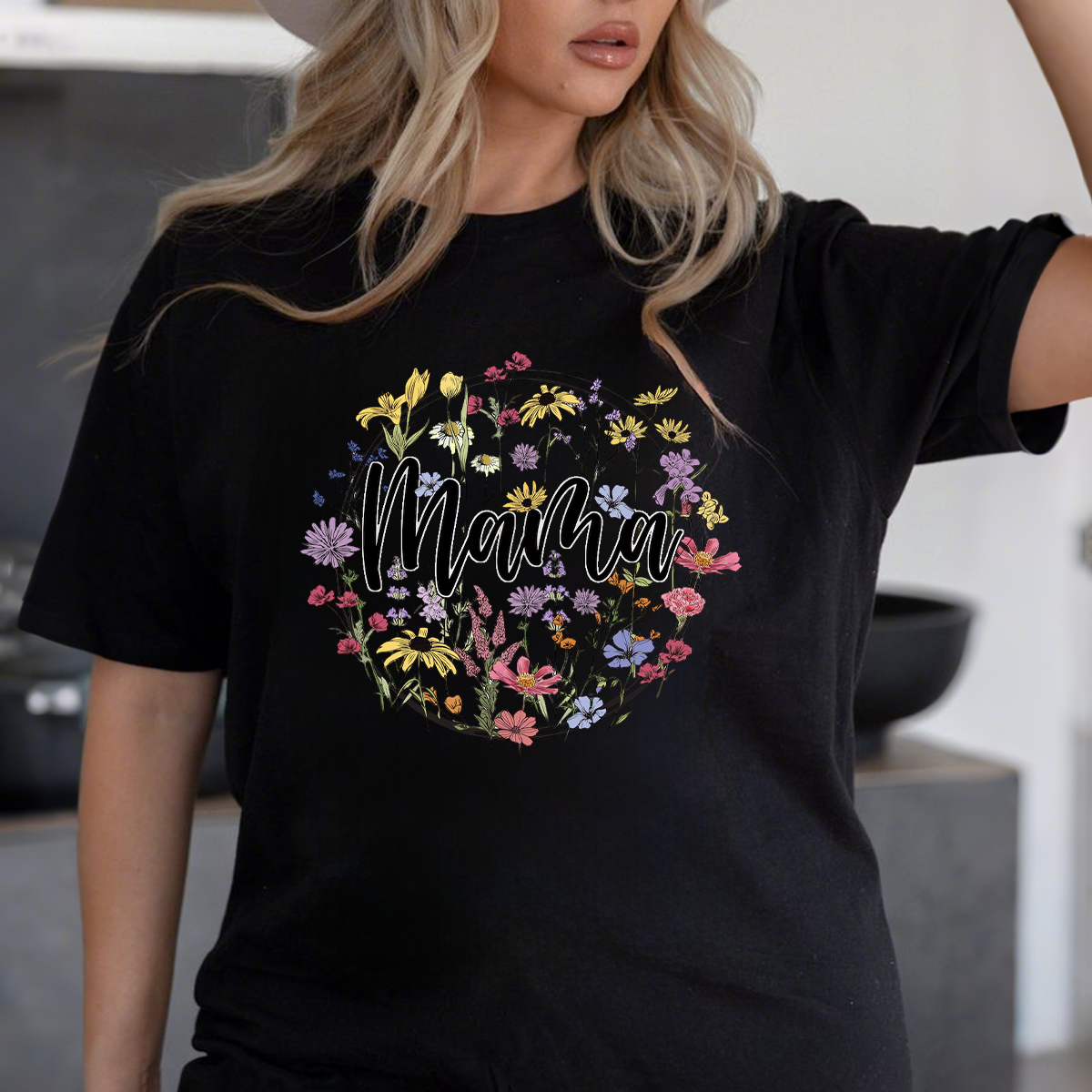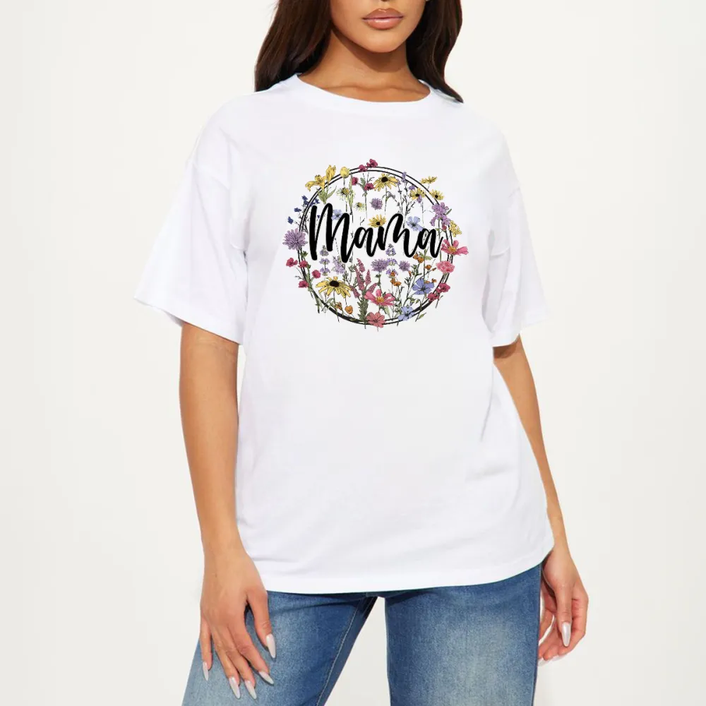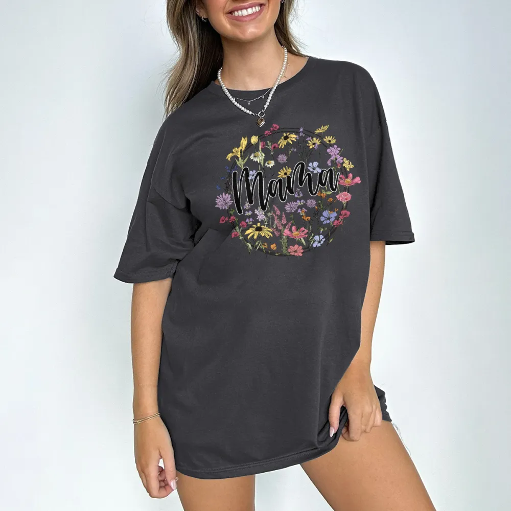 "Mama", The Letters Are Surrounded By A Circle Of Colorful Wild Flowers, With Combinations Of Yellow, Purple, Pink, Etc., Casual T-Shirts, Mother'S Wear.