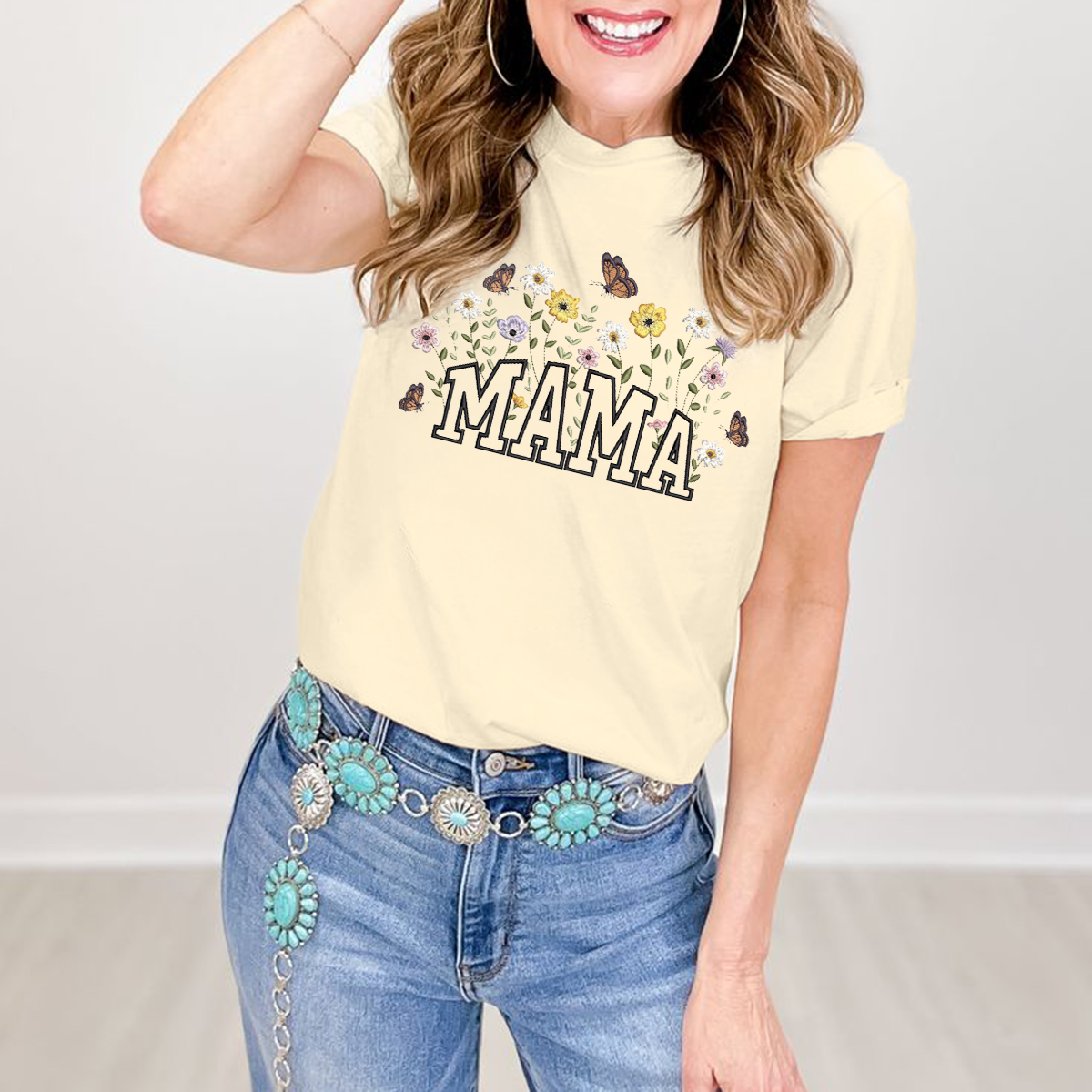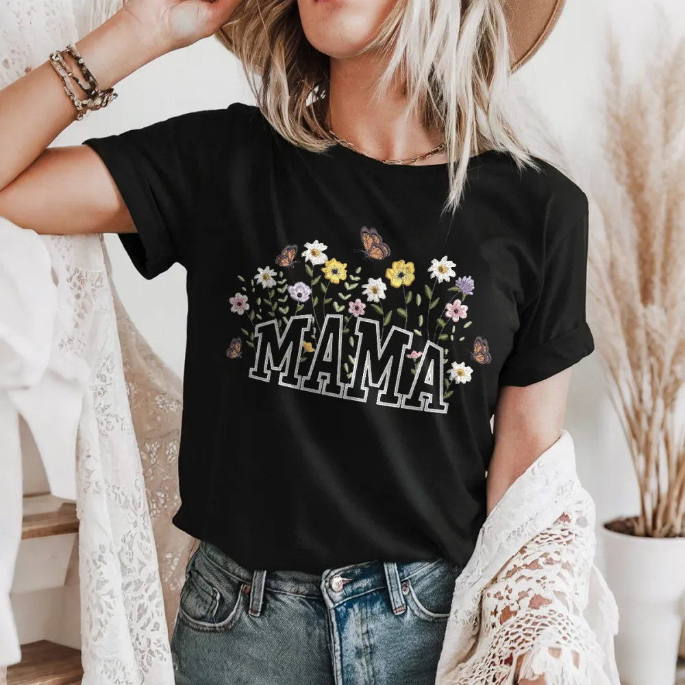 "Mama", The Slogan, Is Surrounded By Patterns Of Flowers And Butterflies In Various Colors, A Simple, Casual T-Shirt.