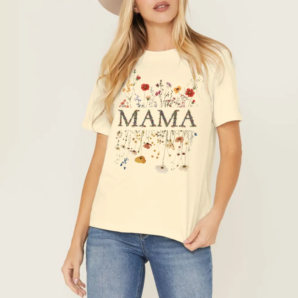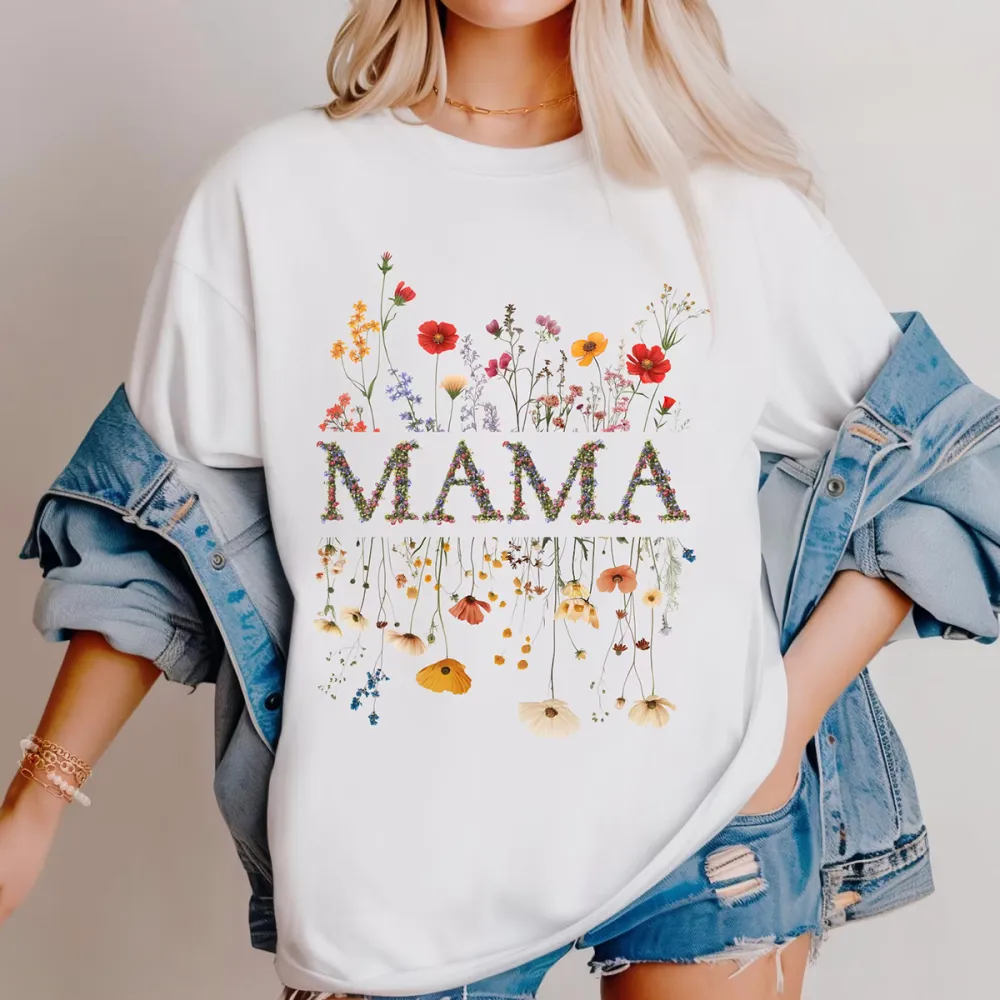 "Mama", The Slogan Is Composed Of Multiple Colorful Flower Patterns, And Various Bright Flowers, Including Red, Orange, Yellow, Purple And Other Flower Patterns, Casual T-Shirts, Mother'S Wear.