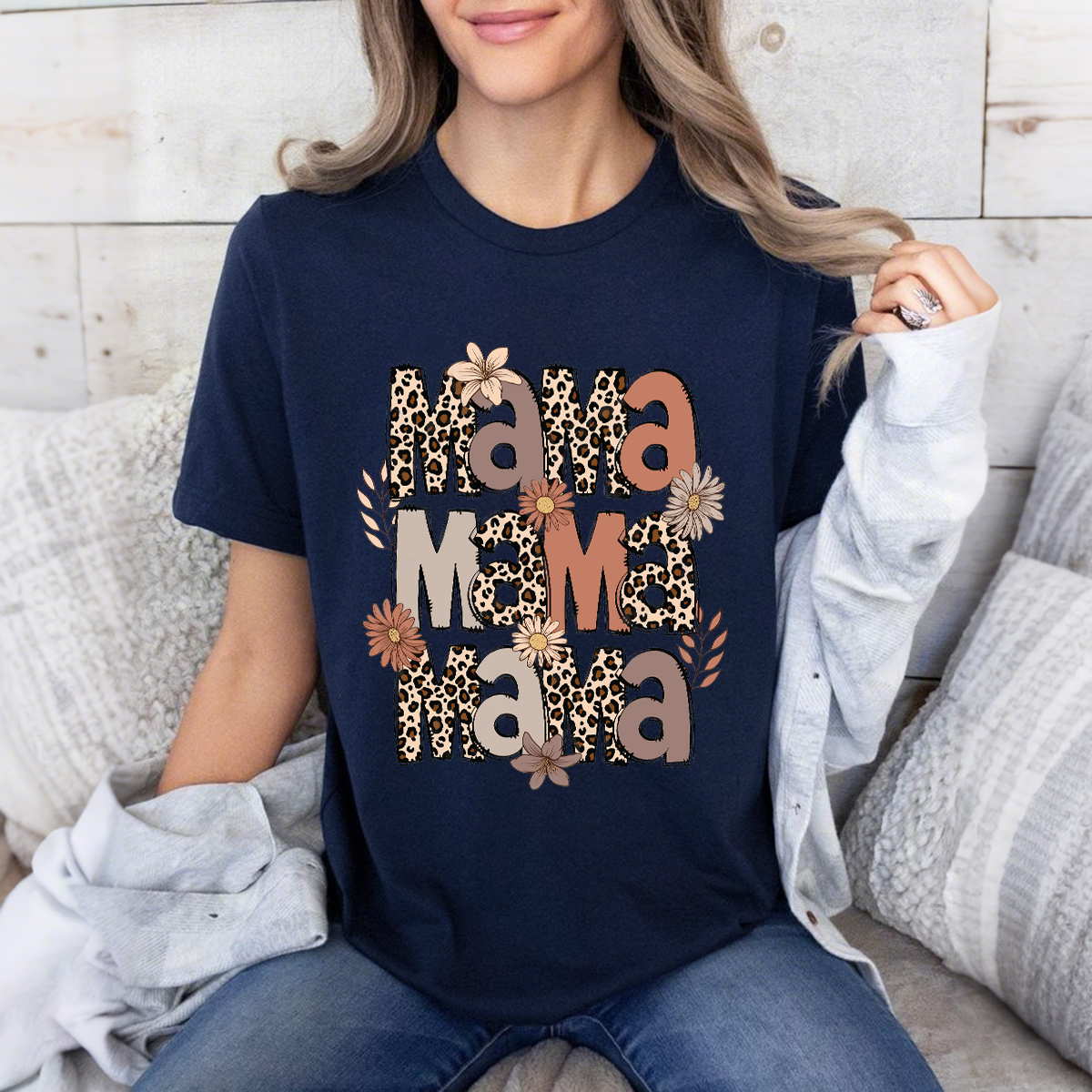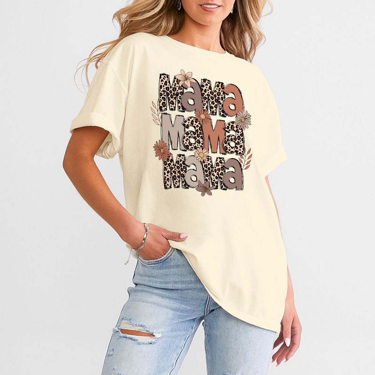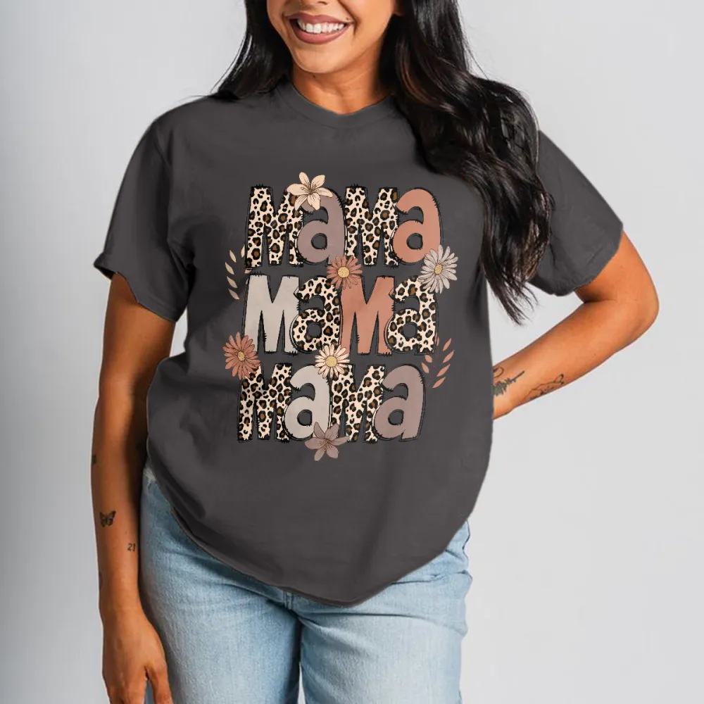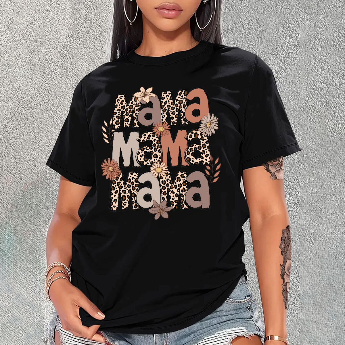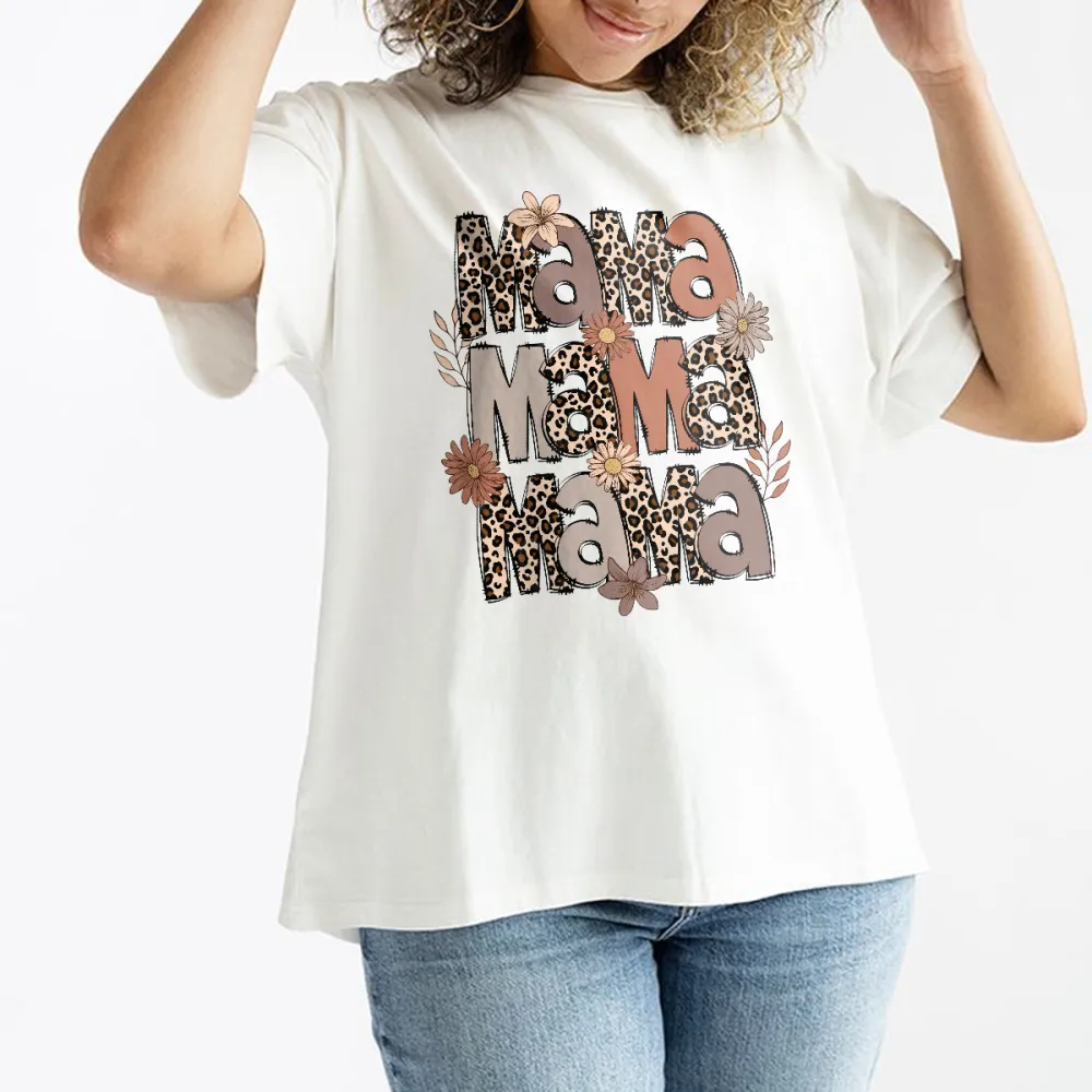 "Mama", The Slogan Is Repeated Three Times, The Letters Have A Leopard Texture, The Colors Are Brown, Beige And Surrounded By Flowers And Leaves, Casual T-Shirts.