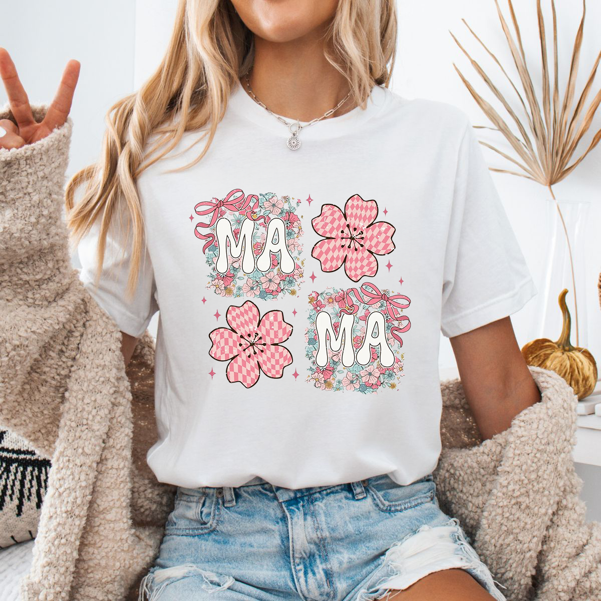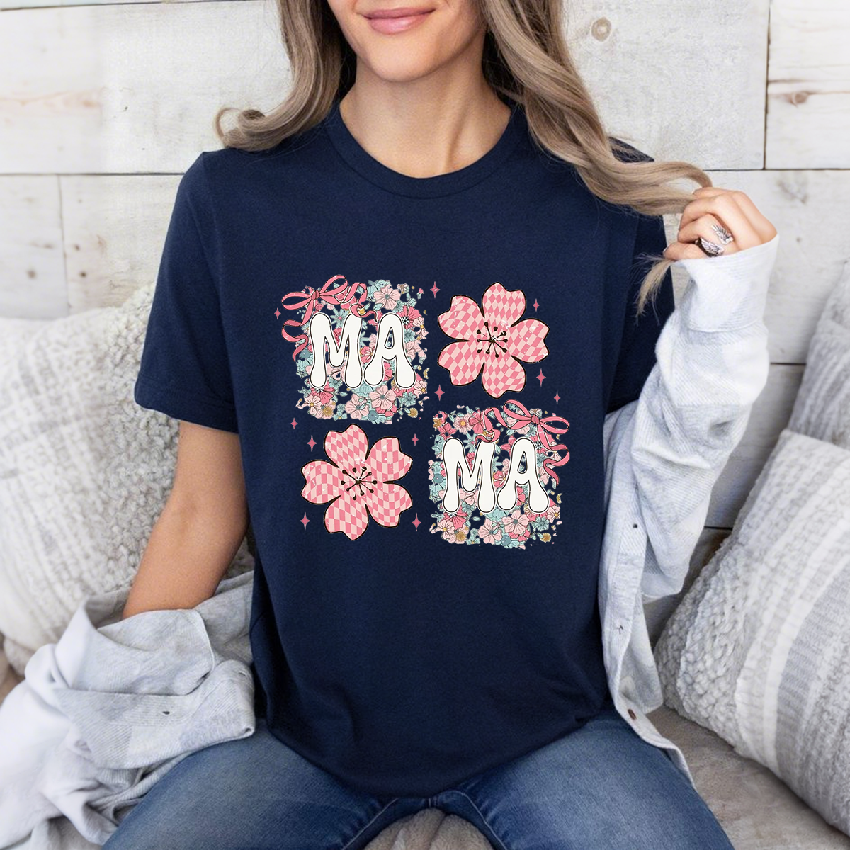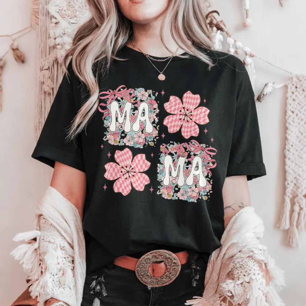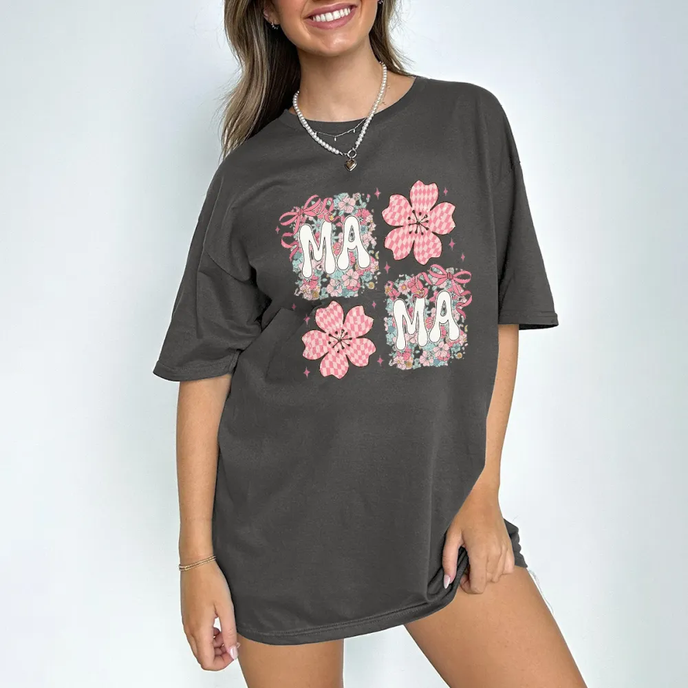 "Mama" Is A Set Of Pattern Designs, Including Flowers, Bows, Plaid Elements In Pink, With A Sweet And Cute Style, And A Casual T-Shirt.