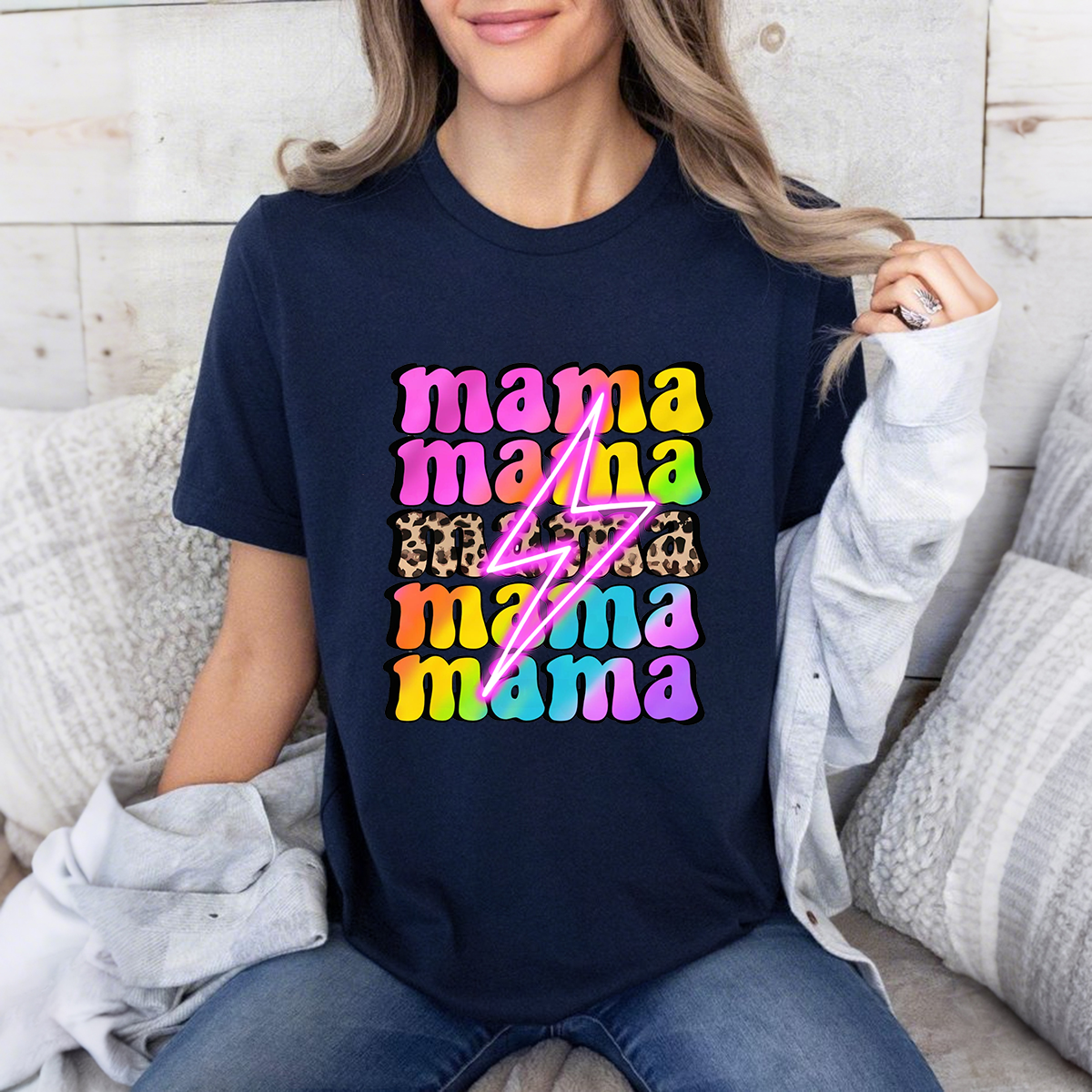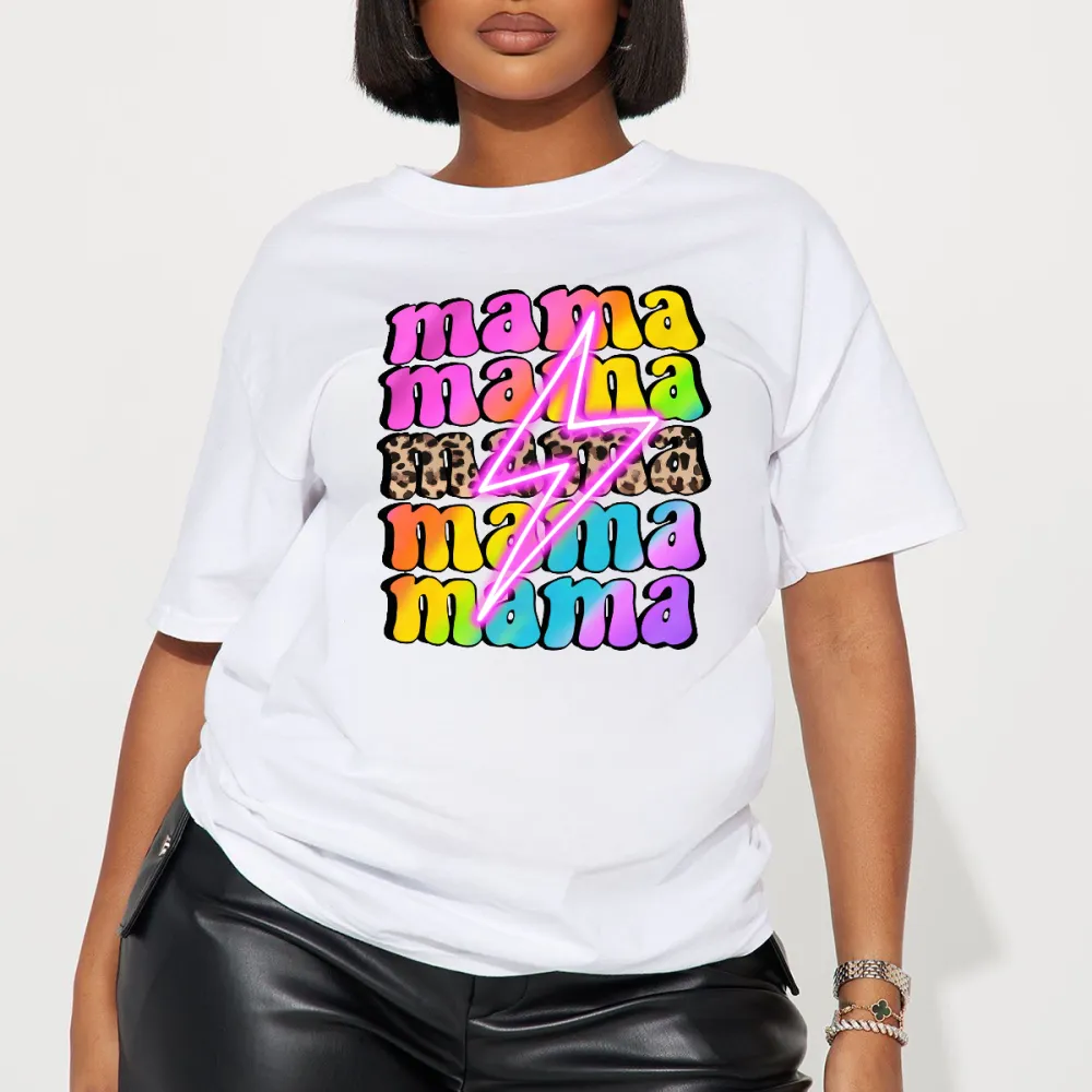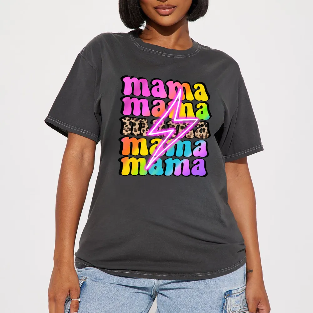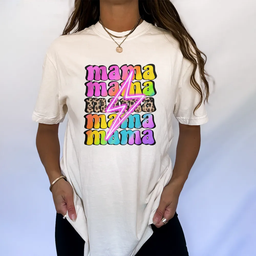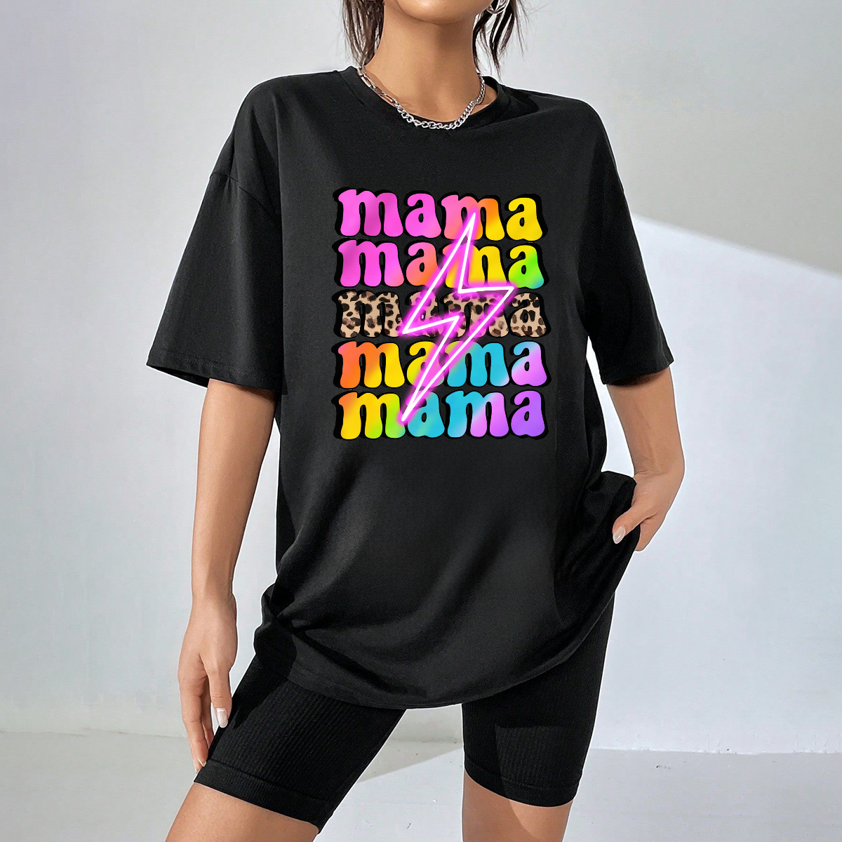 "Mama" Is Presented In A Variety Of Bright Colors, With Some Letters Featuring Leopard Print Texture And A Bright Pink Lightning Pattern, Which Is Trendy And Energetic, And A Casual T-Shirt.