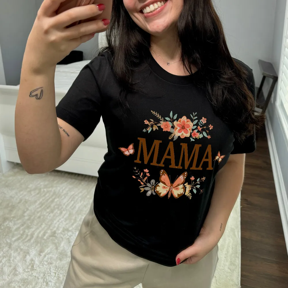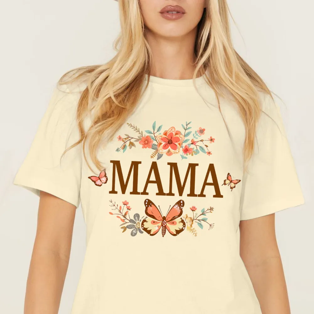 "Mama" Is Presented In Brown, With Floral Branches And A Butterfly Combination Pattern, Casual T-Shirt.