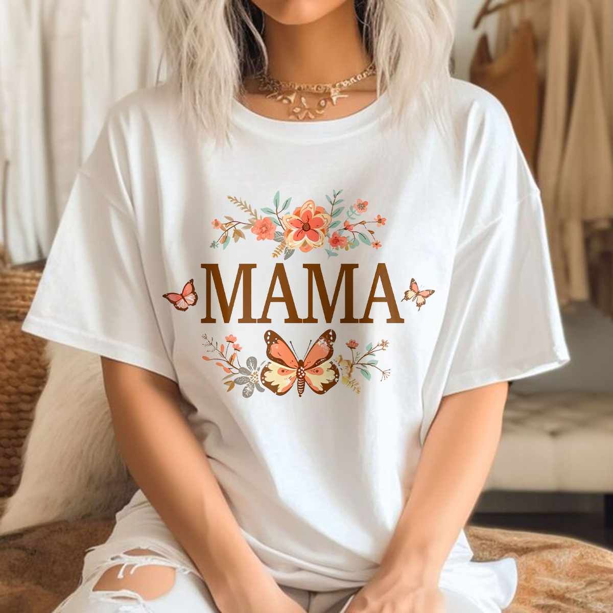 "Mama" Is Presented In Brown, With Floral Branches And A Butterfly Combination Pattern, Casual T-Shirt. 9518064