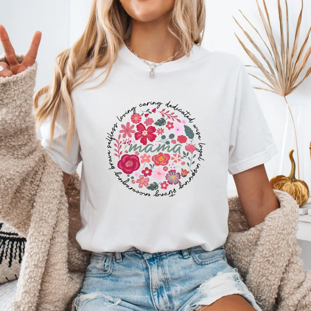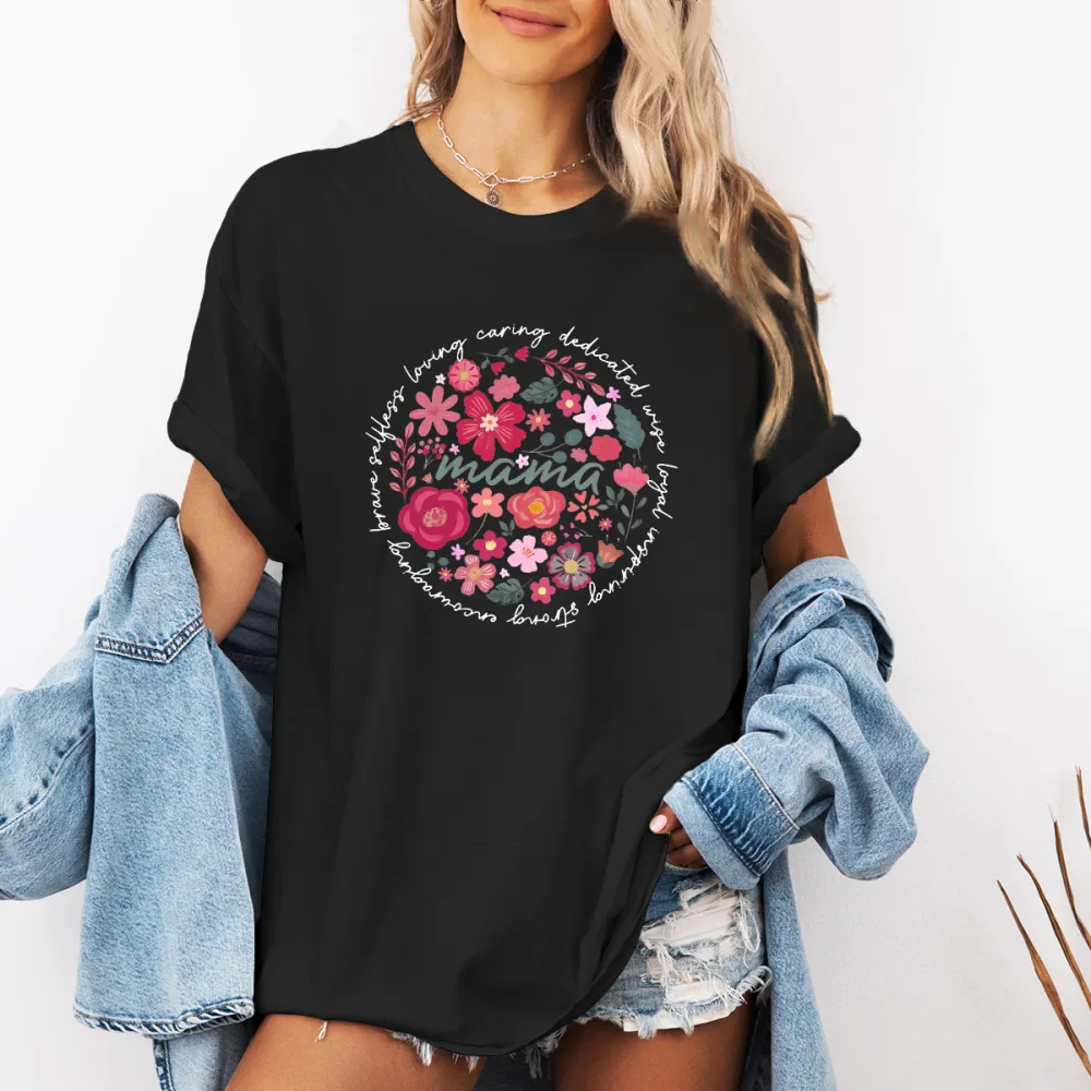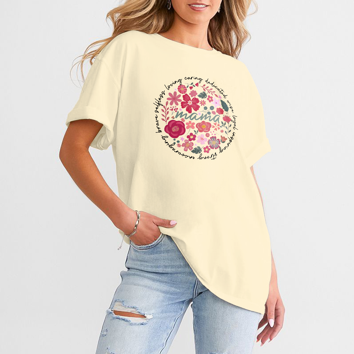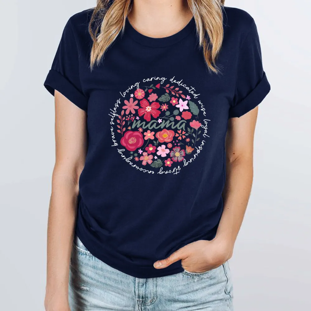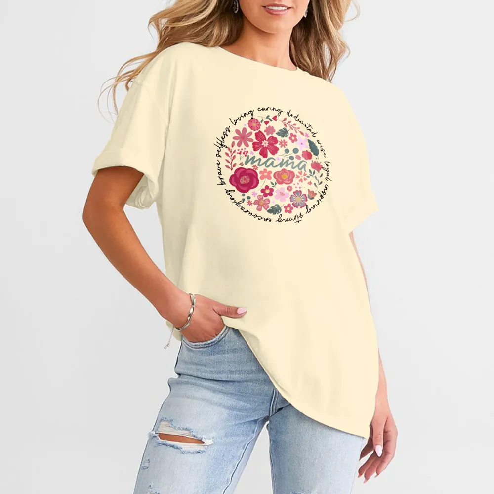 "Mama" Is Surrounded By Floral Patterns Of Various Colors, And There Are Some English Words Around The Outer Circle Of "Mama", A Casual T-Shirt.