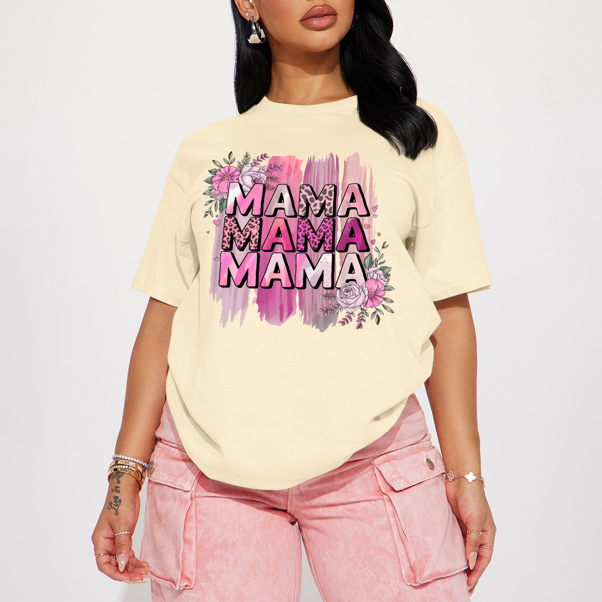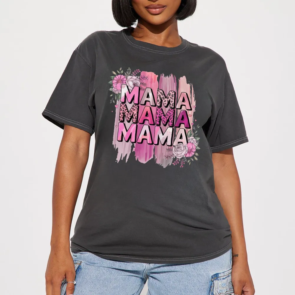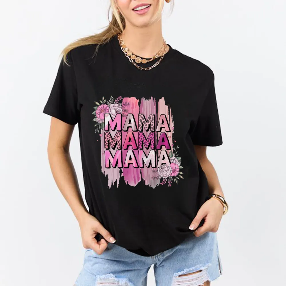 "Mama" Is Written Three Times Repeatedly, With A Pink Watercolor Brushstroke Effect And Dotted With Flower Patterns. The Overall Style Is Warm And Cute, And It Is A Casual T-Shirt. 9517566