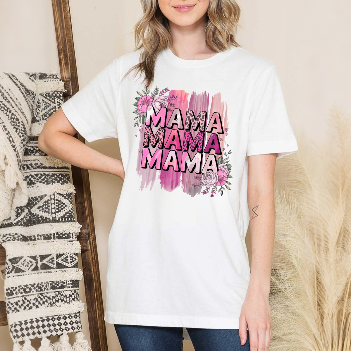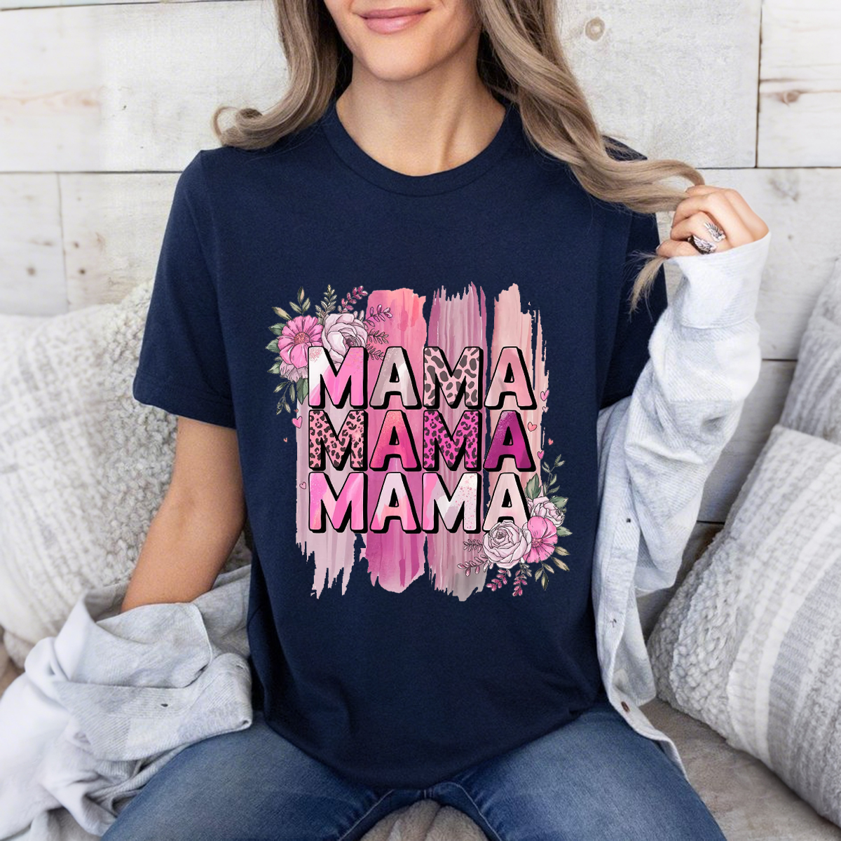 "Mama" Is Written Three Times Repeatedly, With A Pink Watercolor Brushstroke Effect And Dotted With Flower Patterns. The Overall Style Is Warm And Cute, And It Is A Casual T-Shirt.