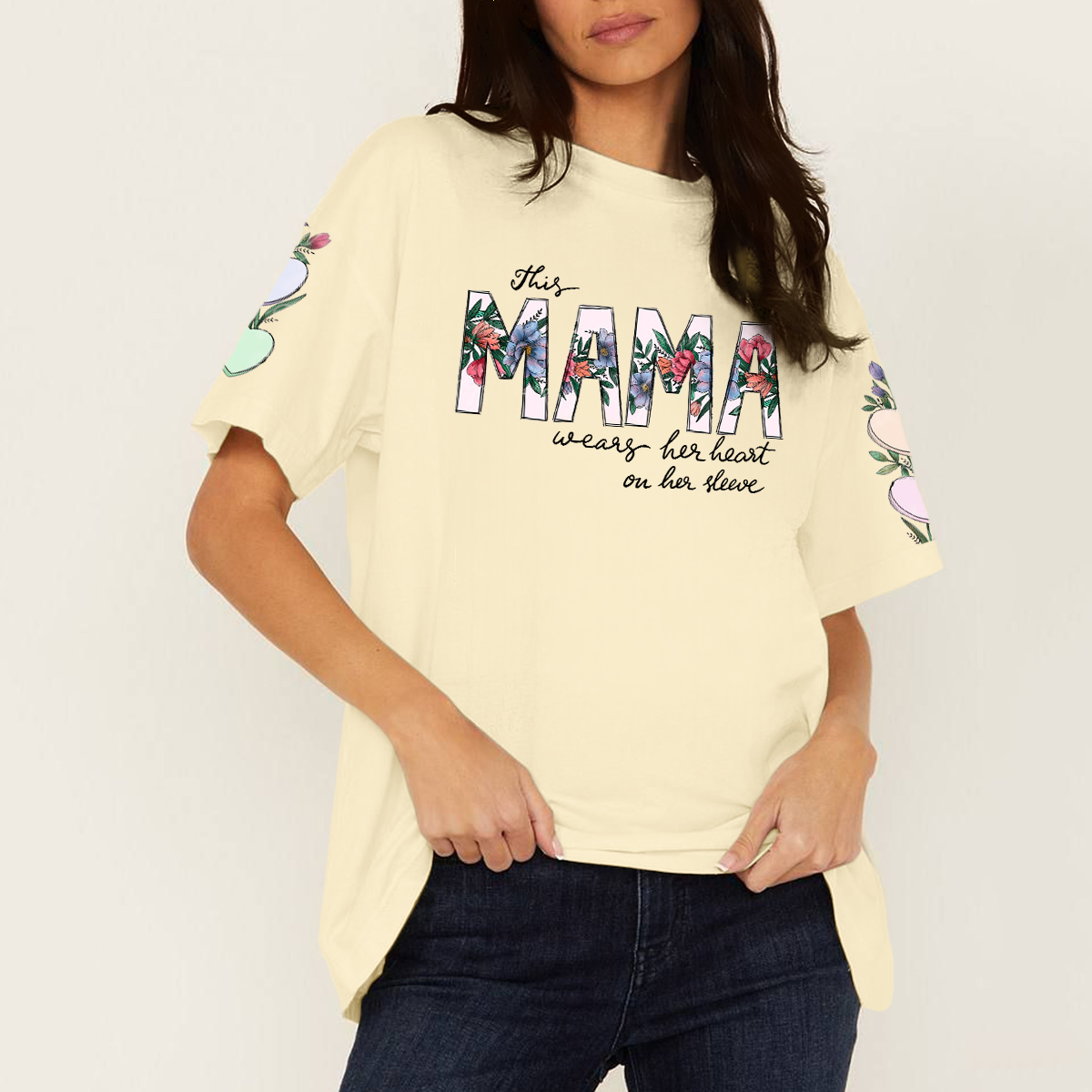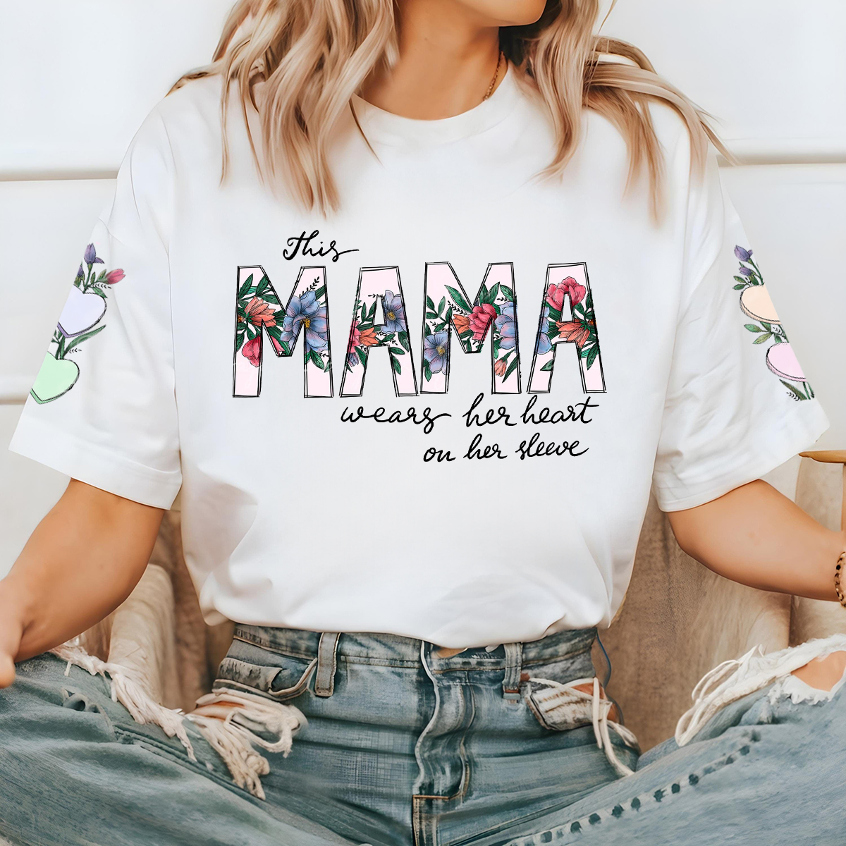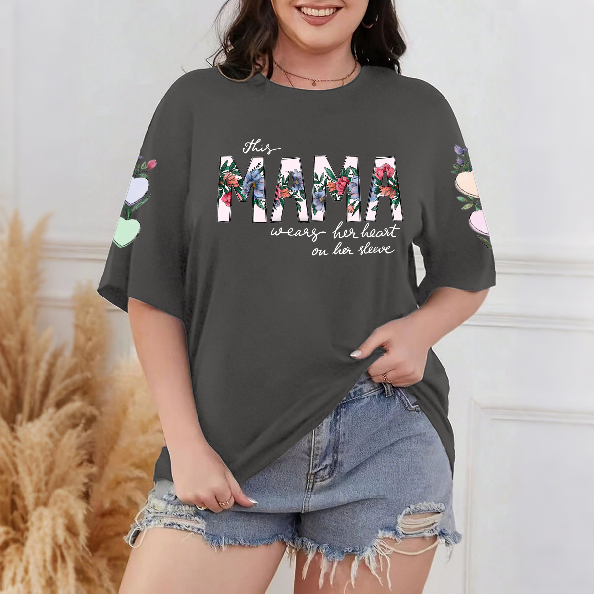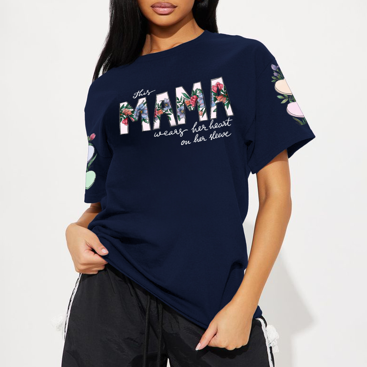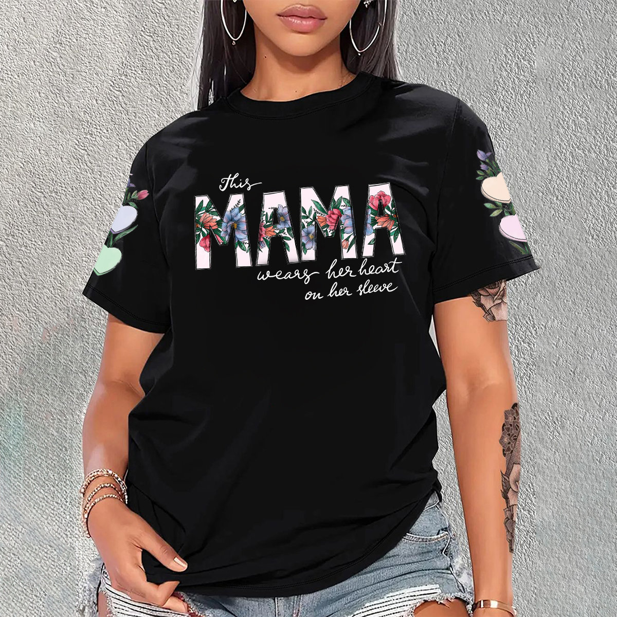 "Mama" Letters Are Decorated With Floral Patterns, "This Mama Wears Her Heart On Her Sleeve", Casual T-Shirt.