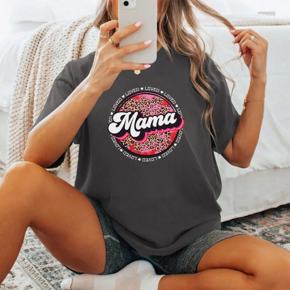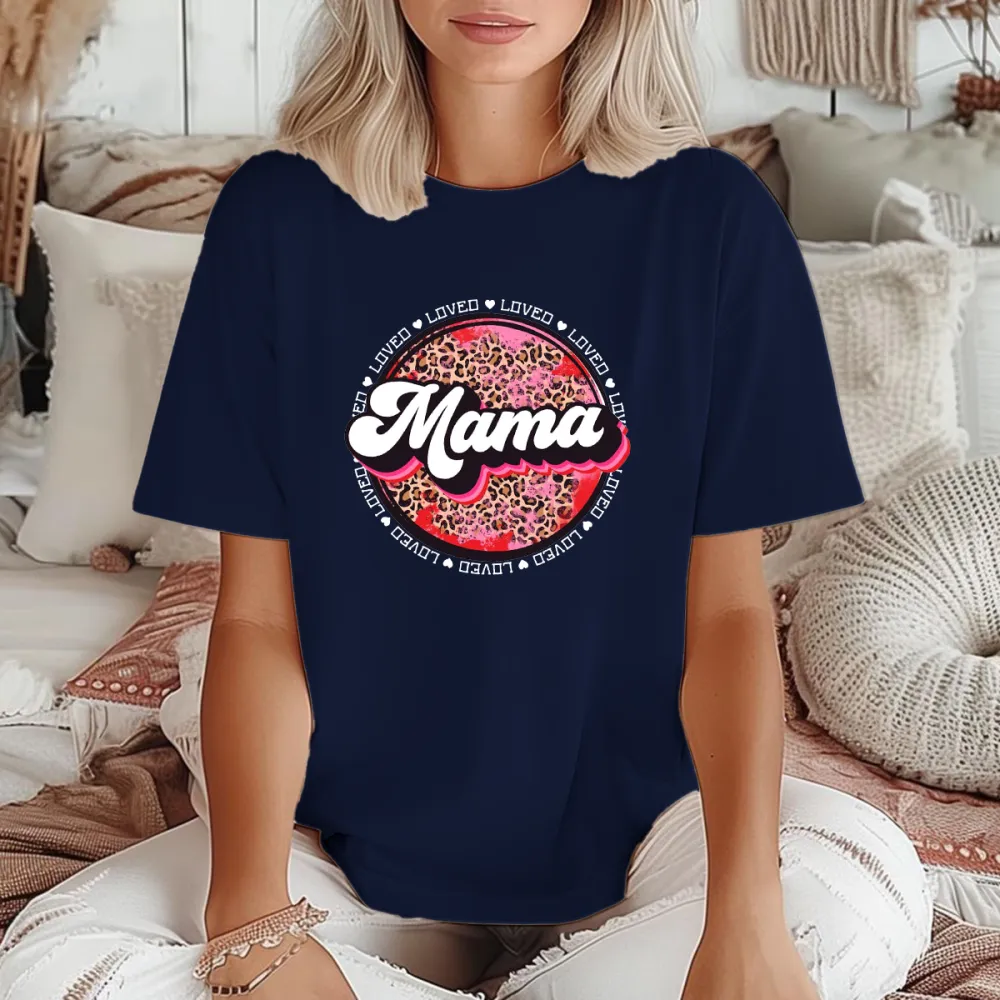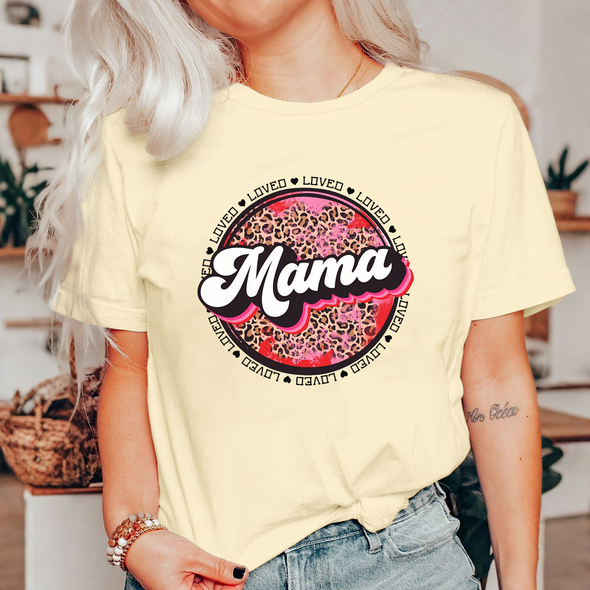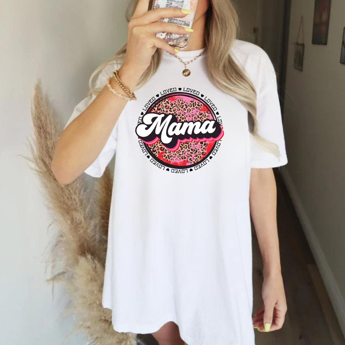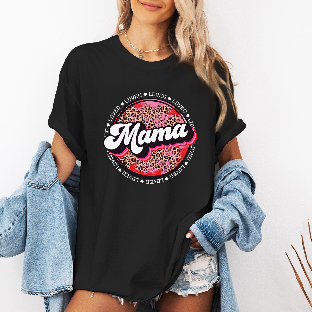 "Mama" With Pink Outlines On The Edges, A Red Background With Leopard Print, And The Word "Loved" Repeated Around The Outer Circle, A Casual T-Shirt.