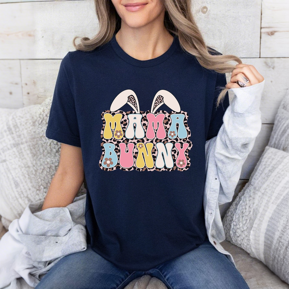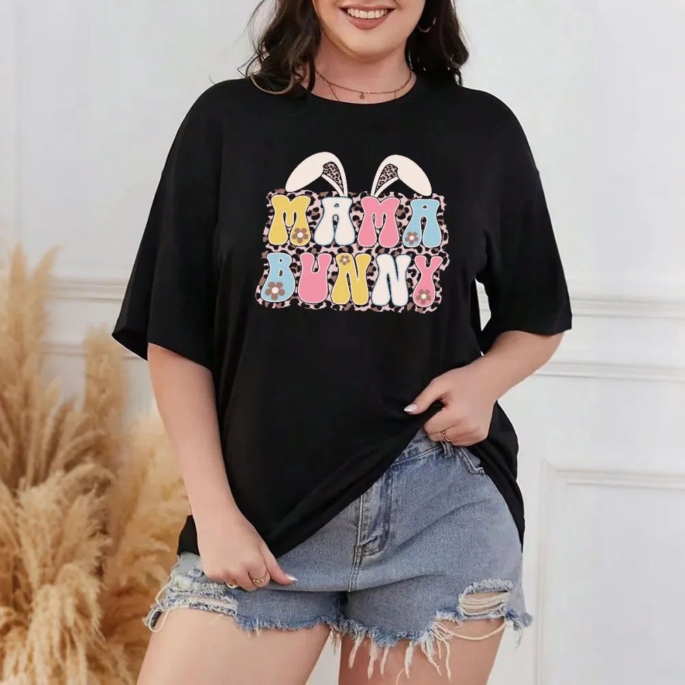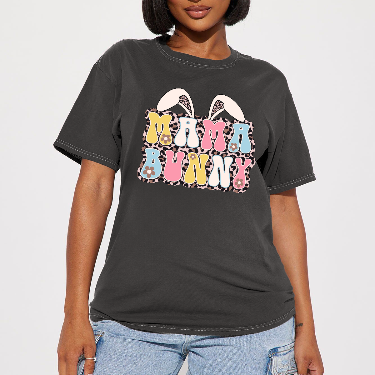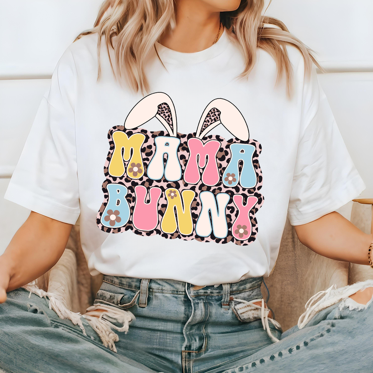 "Mama Bunny", With Letters In Various Colors, Flower Decorations And A Pair Of Bunny Ears, Leopard Print On The Inside Of The Ears, And A Casual T-Shirt.