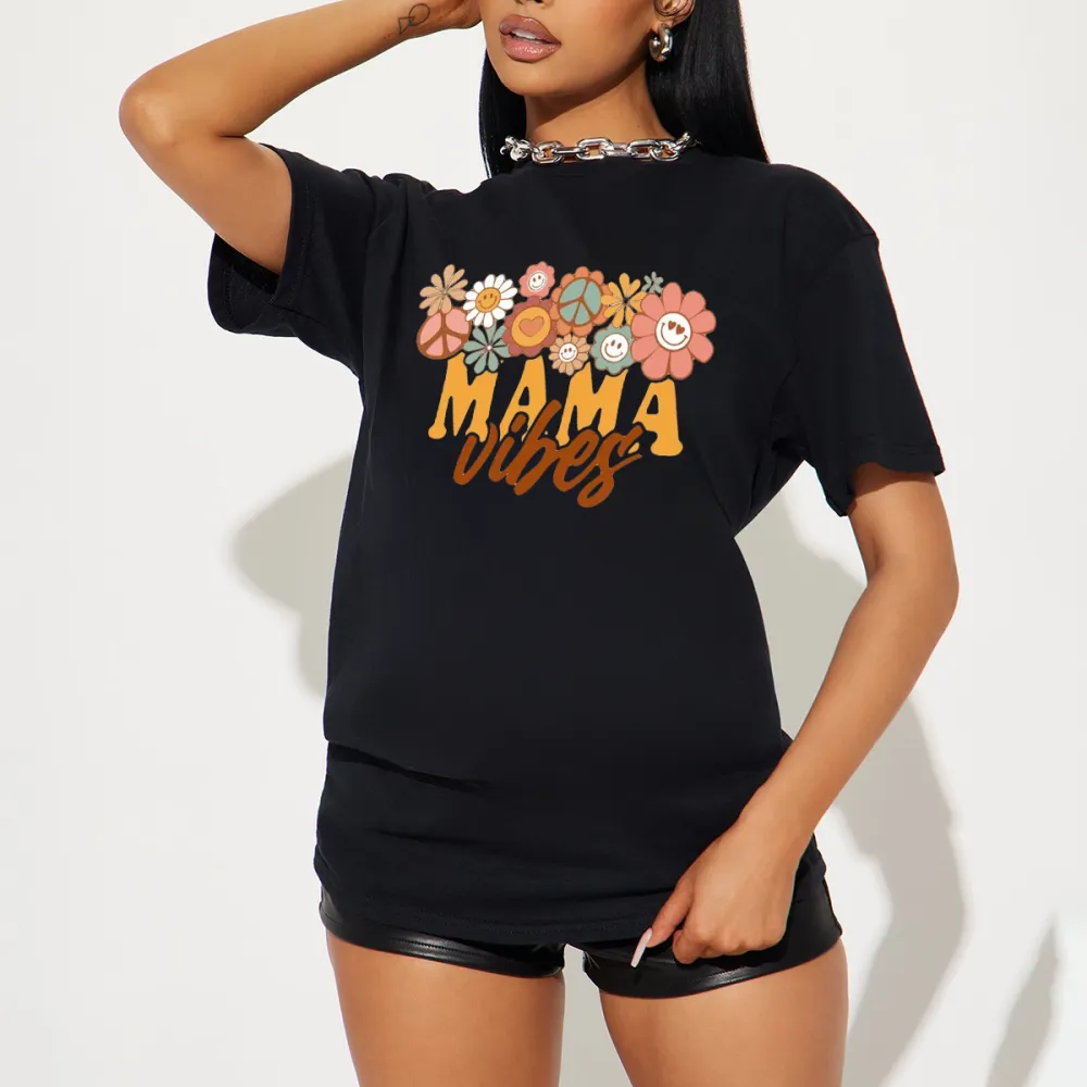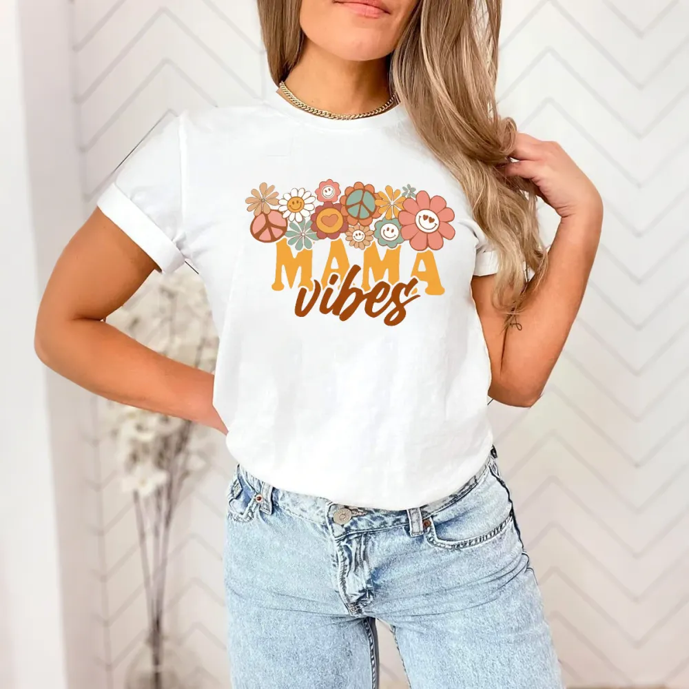 "Mama Vibes", A Combination Of Flowers And Peace Signs In Various Colors, A Casual T-Shirt.