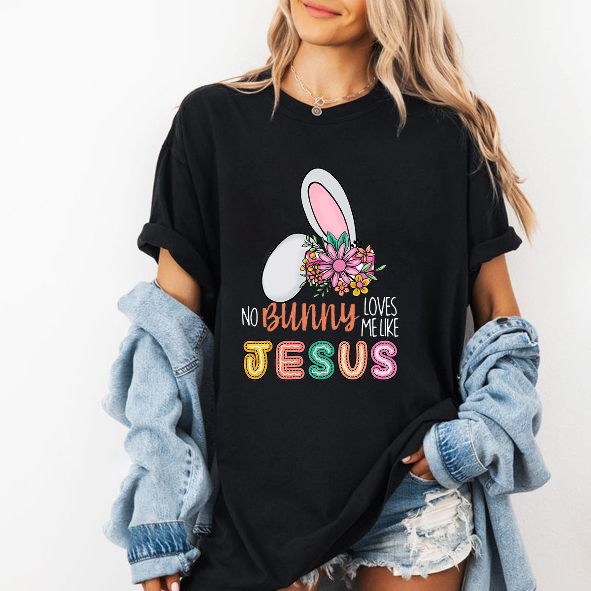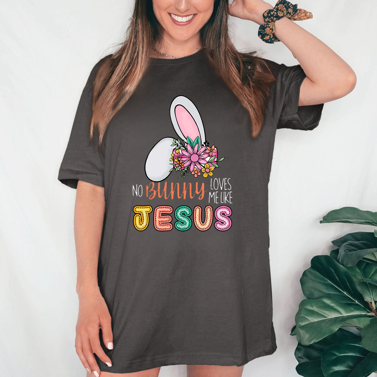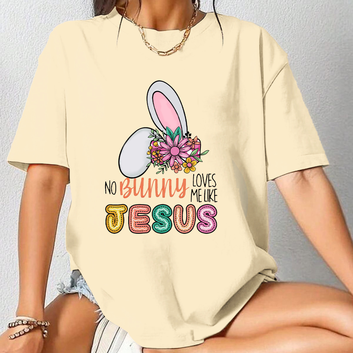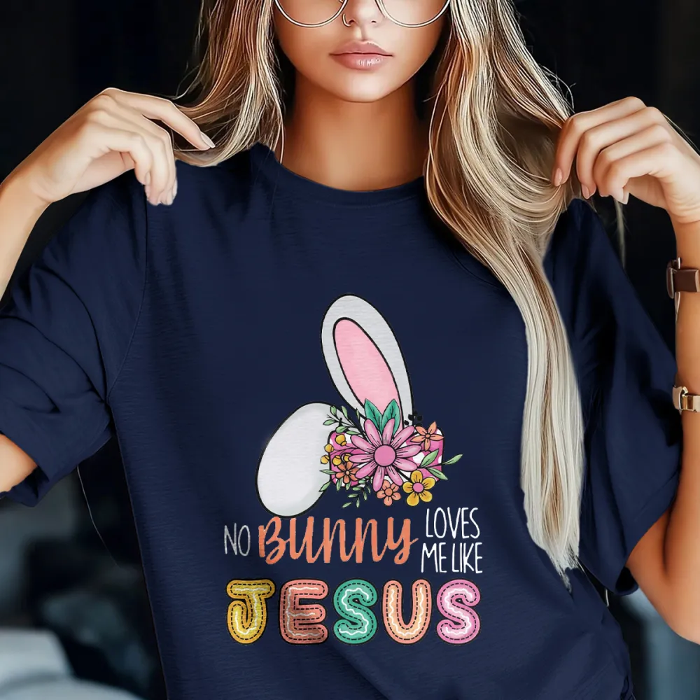 "No Bunny Loves Me Like Jesus", Slogan And Bunny Ears Pattern, Decorated With Flowers Next To It, Casual T-Shirt.