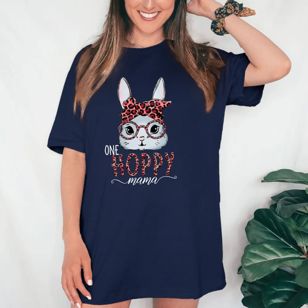 "One Hoppy Mama", The Slogan And A Cartoon Bunny Pattern, The Bunny Wearing A Leopard Print Headscarf And Glasses, Looks Very Playful, Casual T-Shirt.