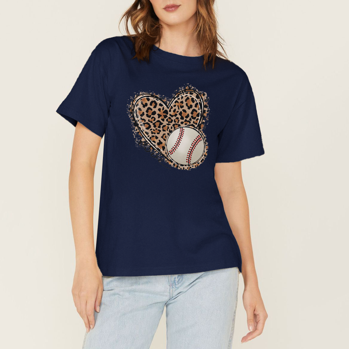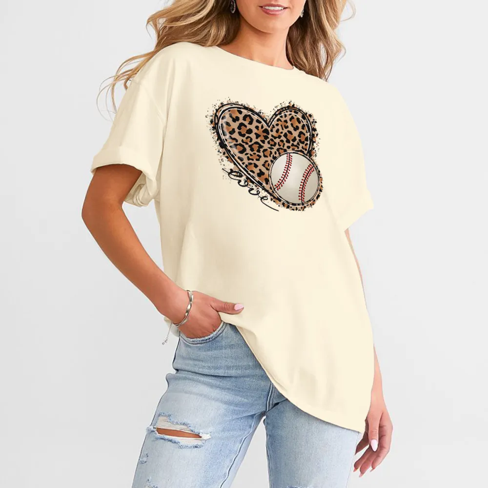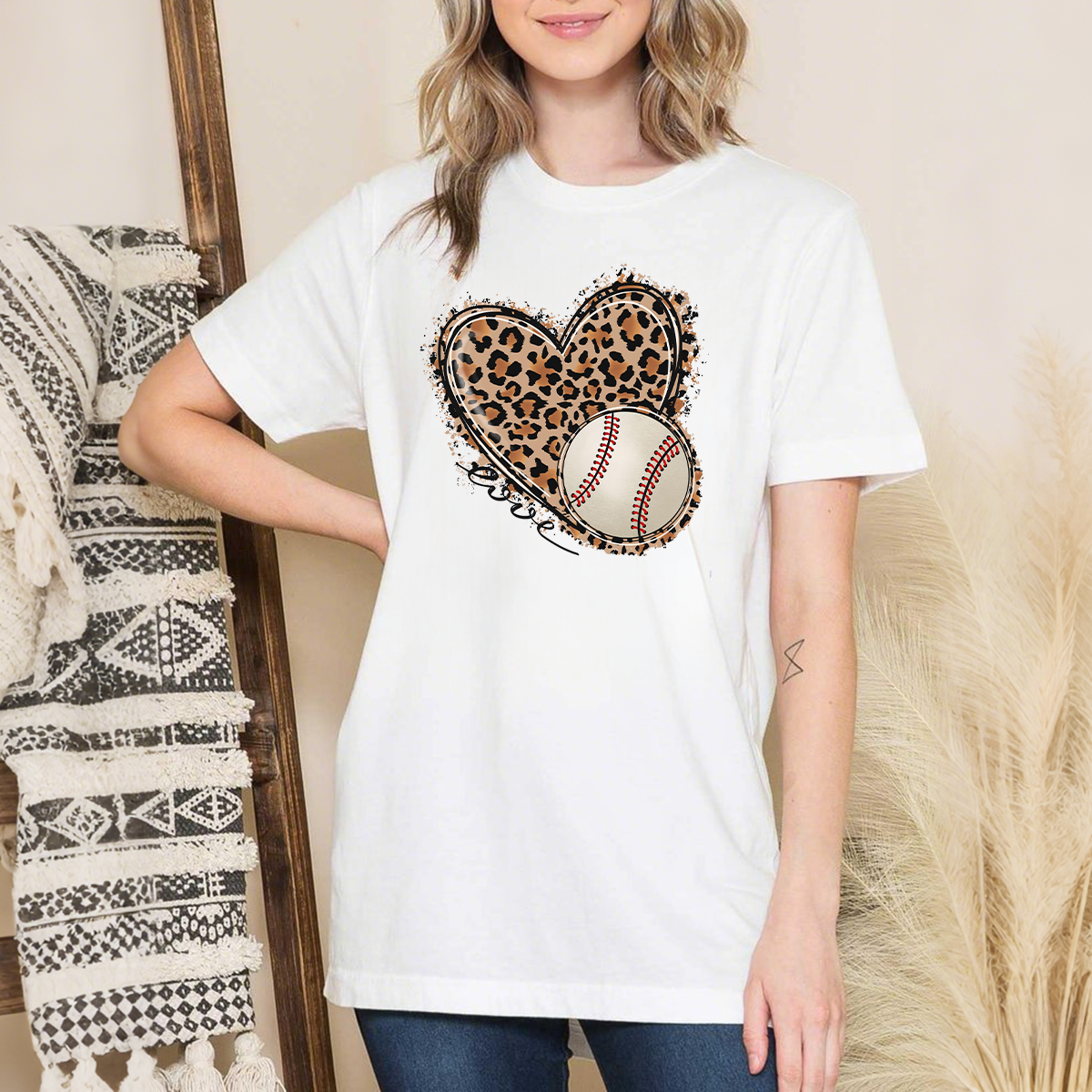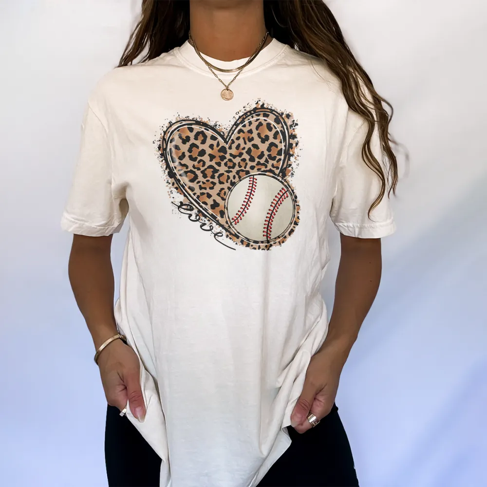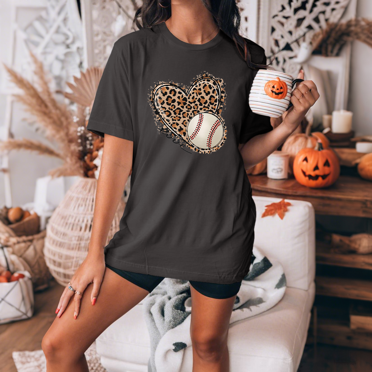 "Softball", Slogan, A Leopard Print Heart And A Baseball Monogram, Casual T-Shirt.