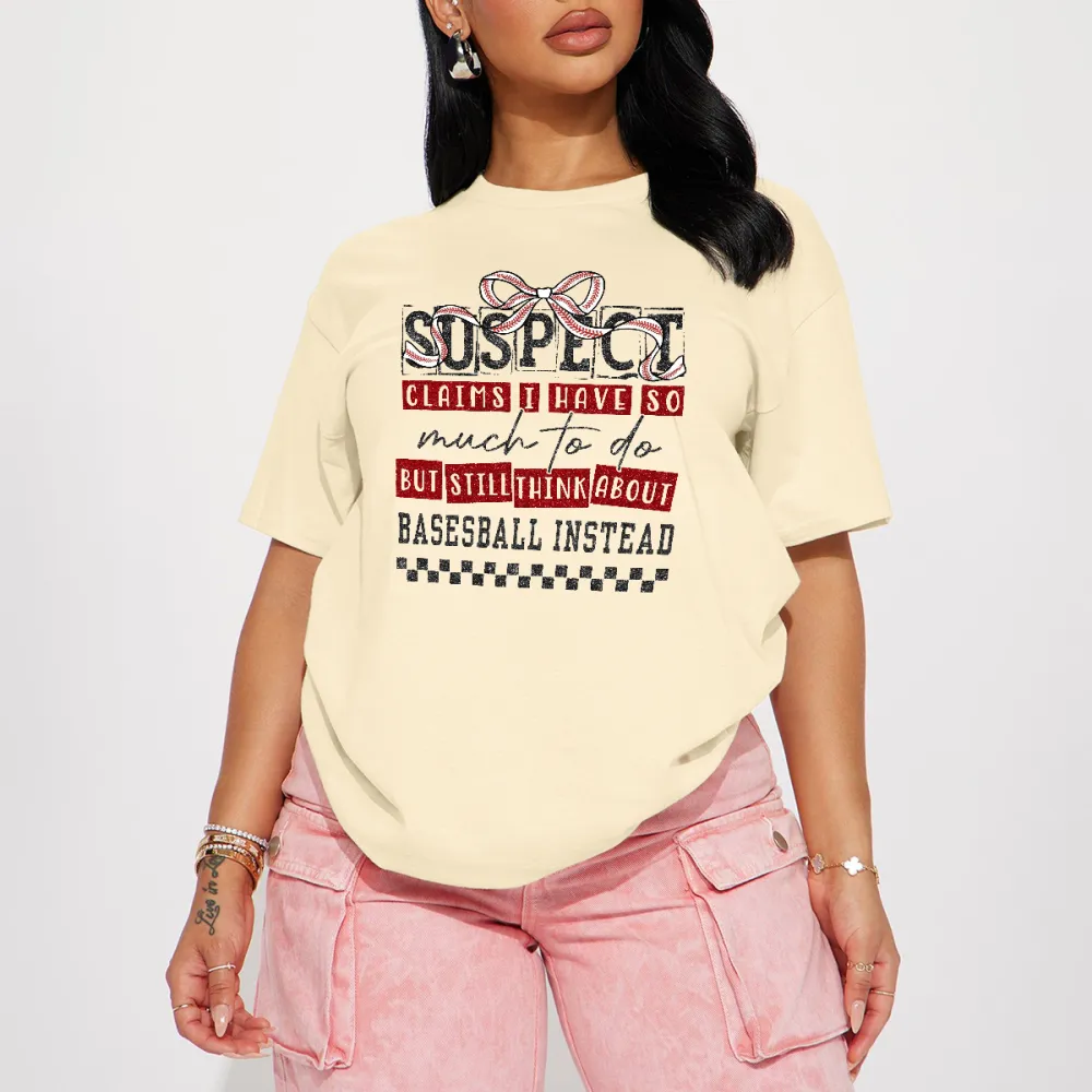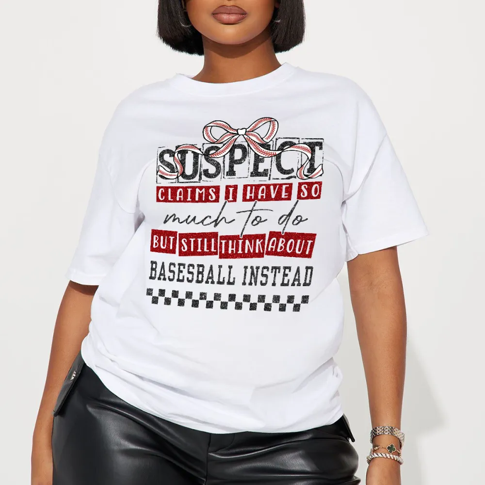 "Sos Pitch", "Clairs I Have So Much To Do But Still Think About Baseball Instead", Slogan And A Bow Graphic, Casual T-Shirt. 9519813