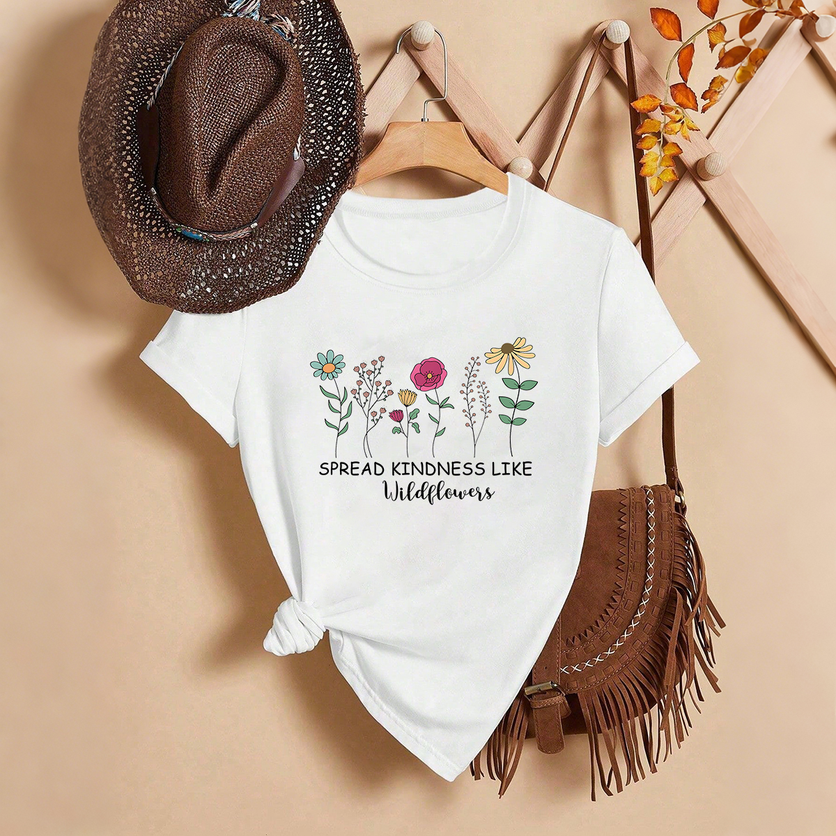 "Spread Kindness Like Wildflowers" Slogan And Simple Drawings Of Different Kinds Of Flowers, Including Blue Flowers, Pink Roses, And Yellow Daisy Patterns, Casual T-Shirts.