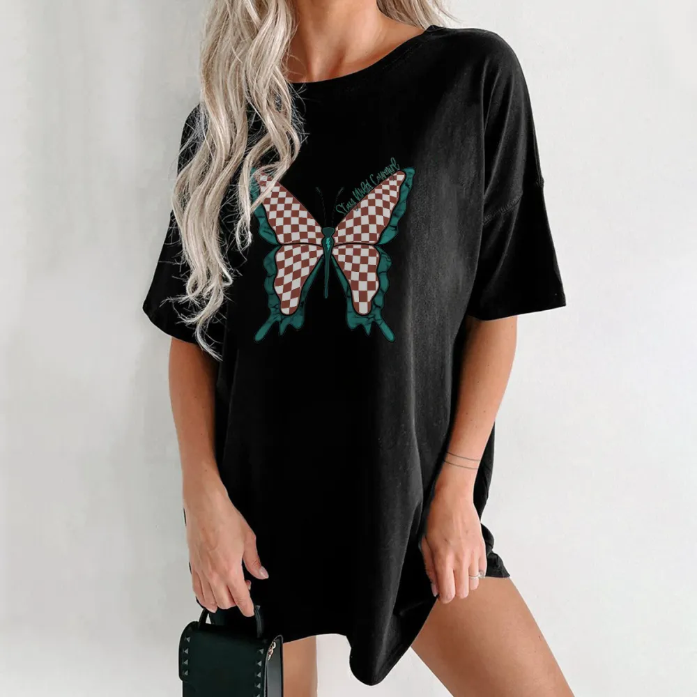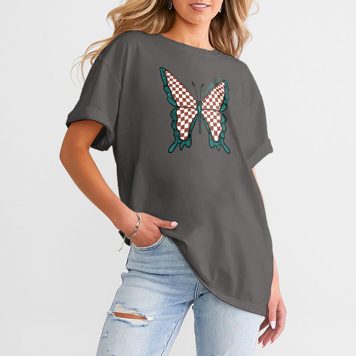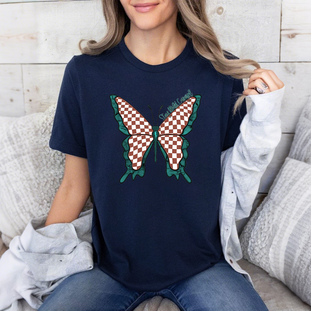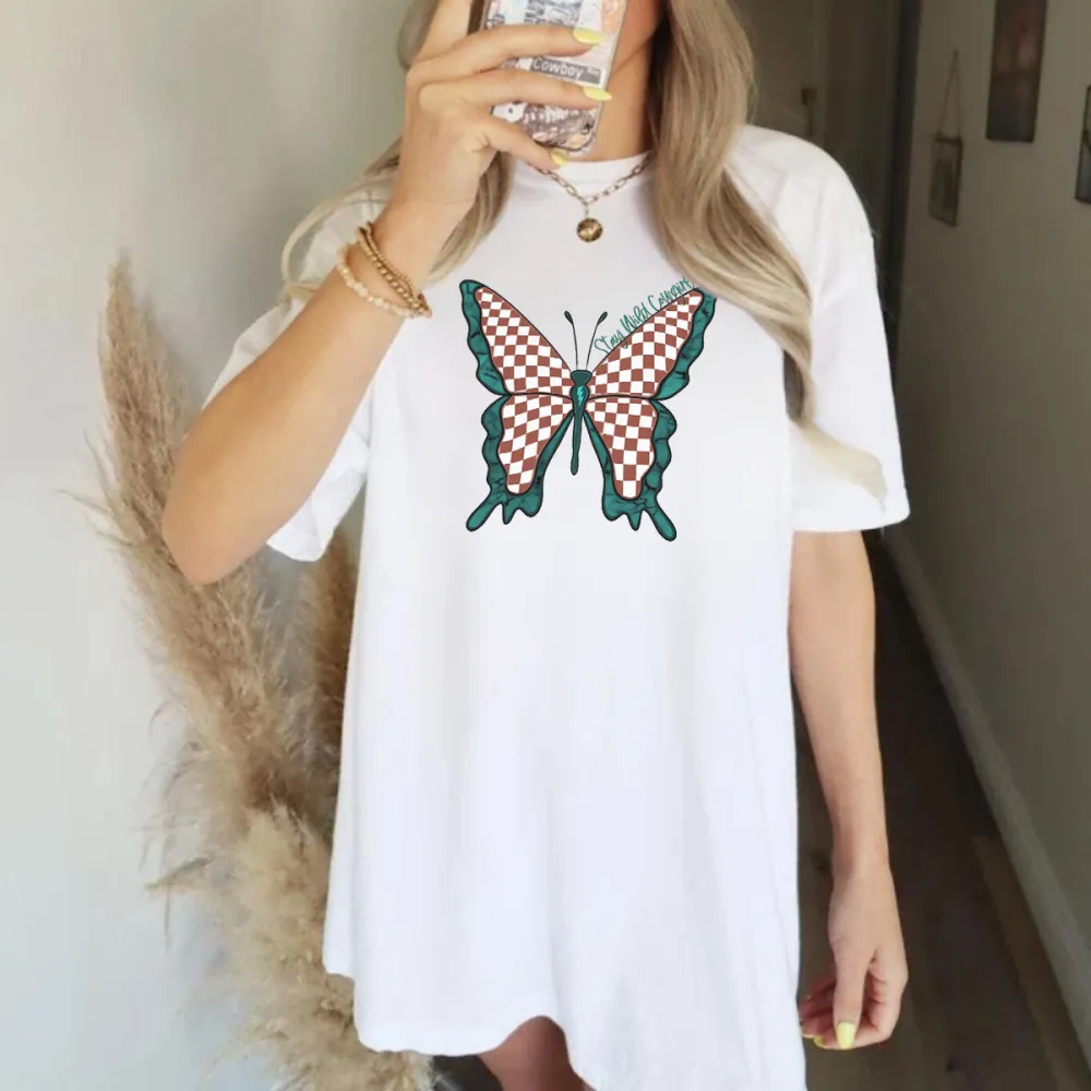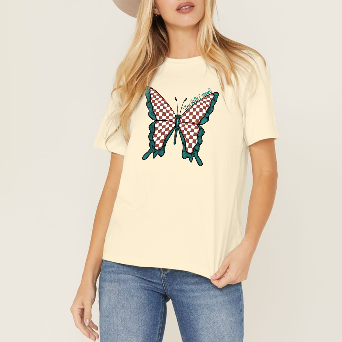 "Stay Wild Cowgirl", Slogan And Butterfly Pattern, Wings Are Red And White Checkerboard, Casual T-Shirt.