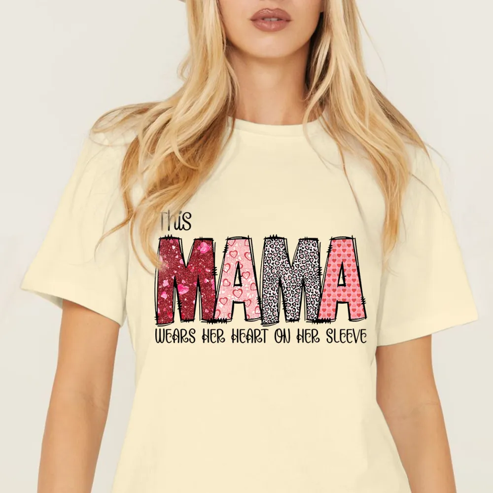"This Mama Wears Her Heart On Her Sleeve", In Which "Mama" Uses Pink Heart Shape, Red Glitter Effect, Black And White Leopard Print Pattern, Etc., Casual T-Shirt, Mother'S Wear.