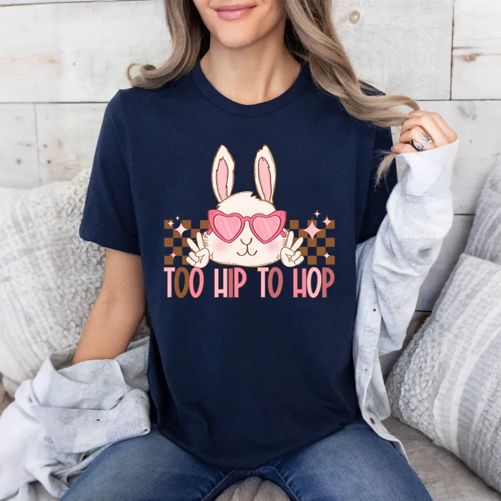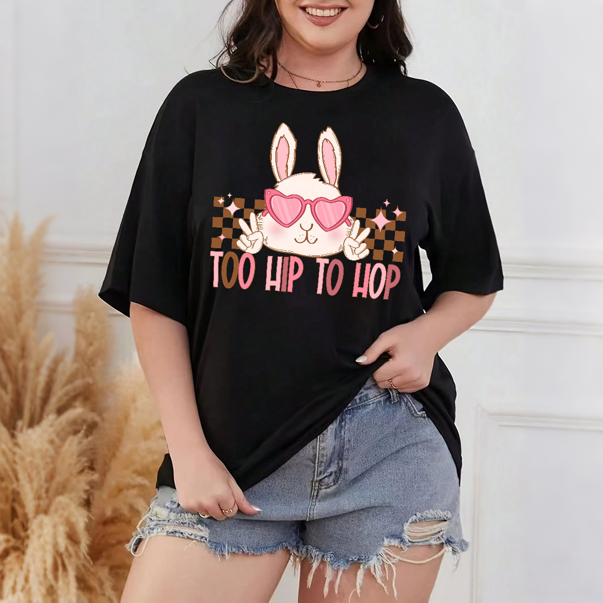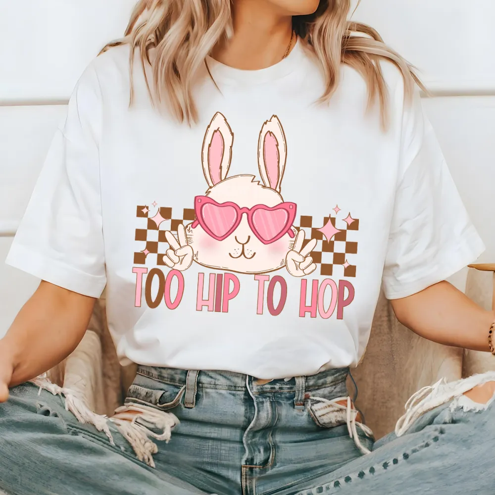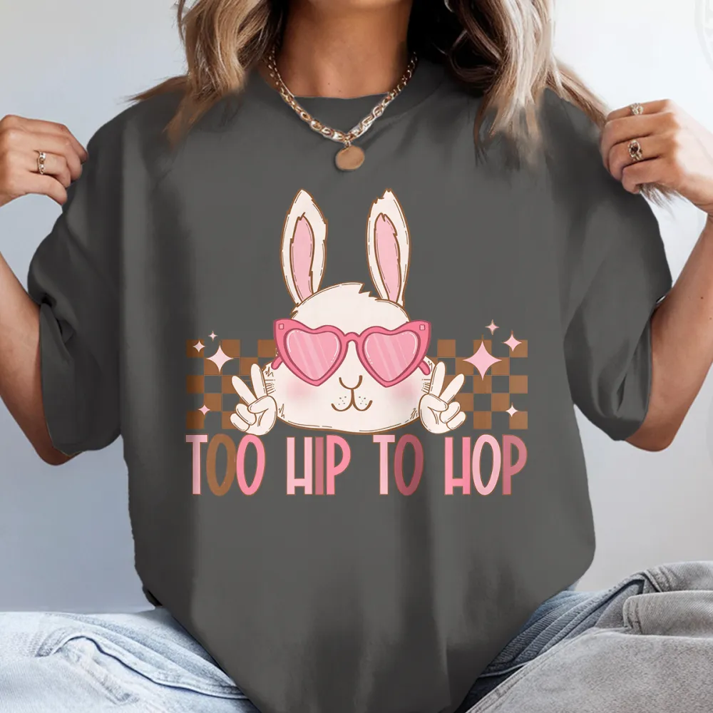 "Too Hip To Hop", Slogan And A Rabbit Wearing Pink Heart-Shaped Glasses Raising His Hands And Making A "V" Sign, Brown Checkerboard Decorative Background, Trendy And Cute, Casual T-Shirt.