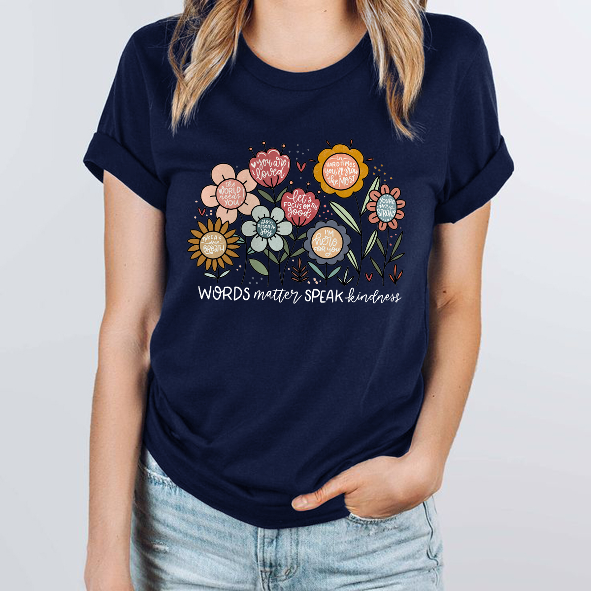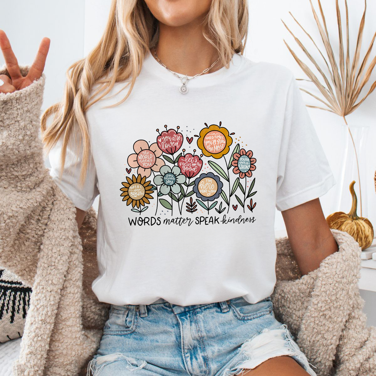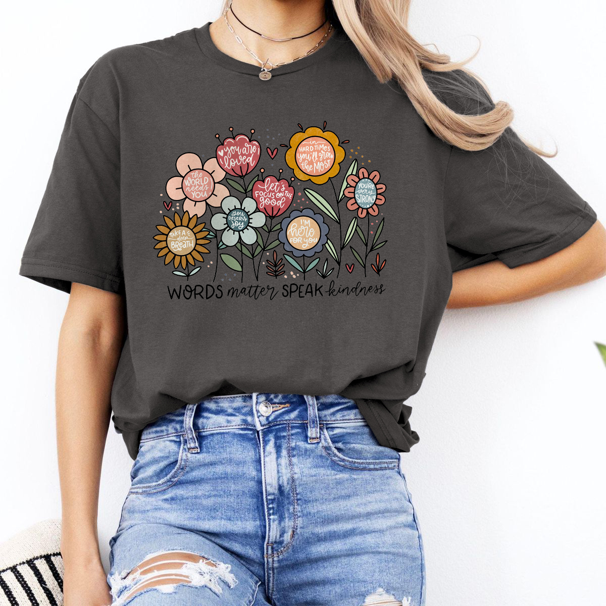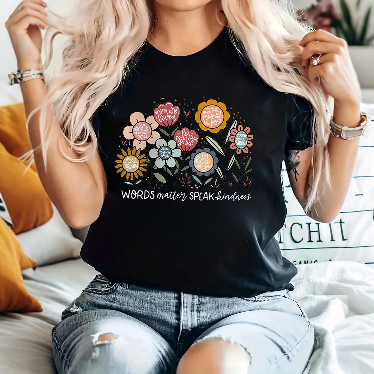 "Words Matter Speak Kindness", Slogan And Floral Pattern In Different Colors, Casual T-Shirt. 9521333