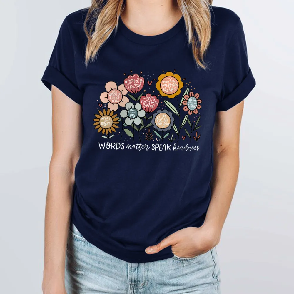 "Words Matter Speak Kindness", Slogan And Floral Pattern In Different Colors, Casual T-Shirt.