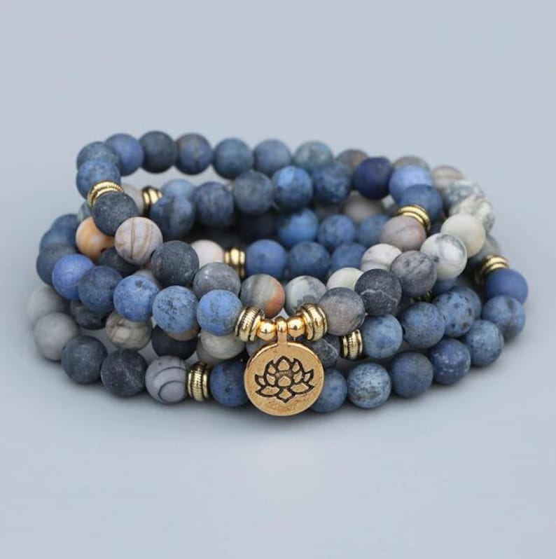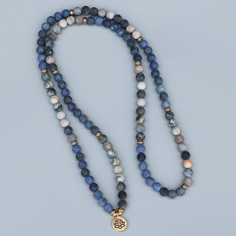This splendid Mala bracelet is carefully handmade with 108 natural genuine Picasso Jasper and Blue Stone beads. It can be worn as a bracelet, necklace or used for meditation. Length is about 23.6 inches (60 cm), elastic.