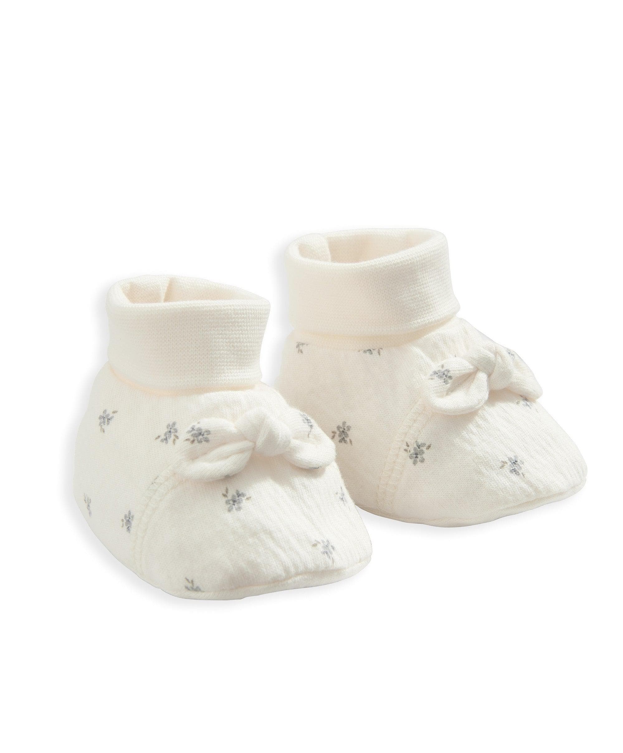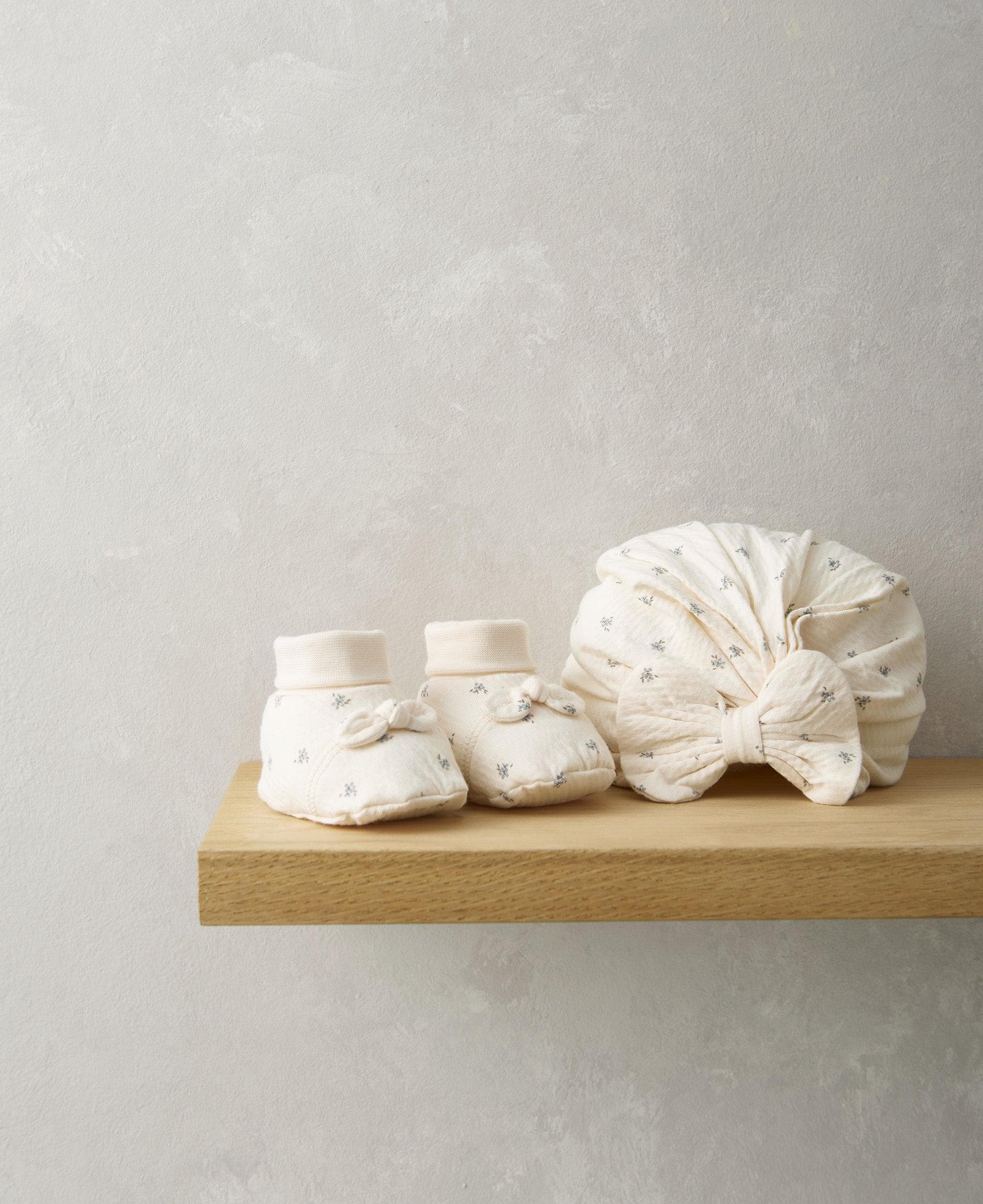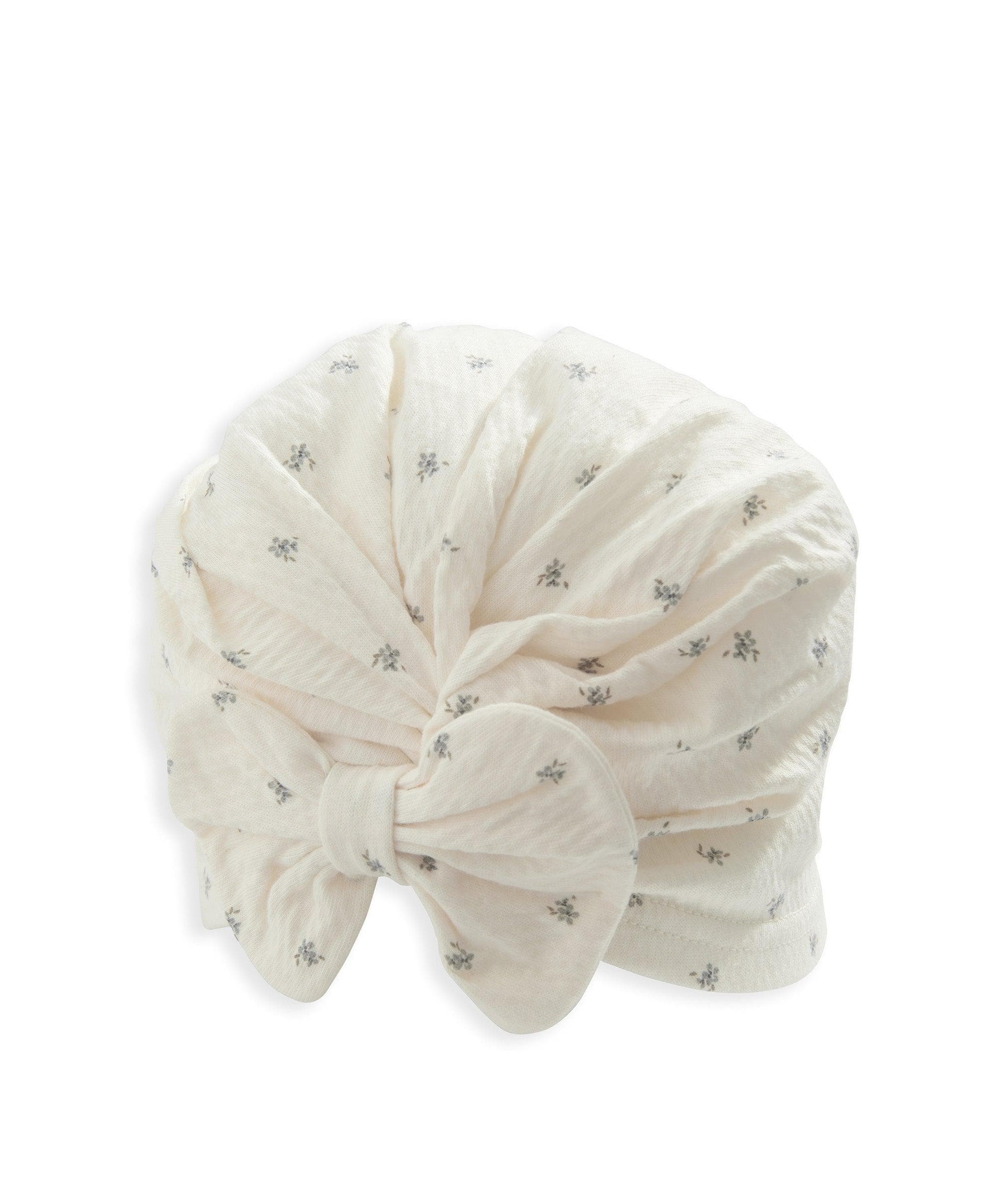 2-piece set of turban hat and booties, in matching textured crinkle jersey fabric and delicate blue ditsy floral print. Hat features knot detail and booties feature bow.