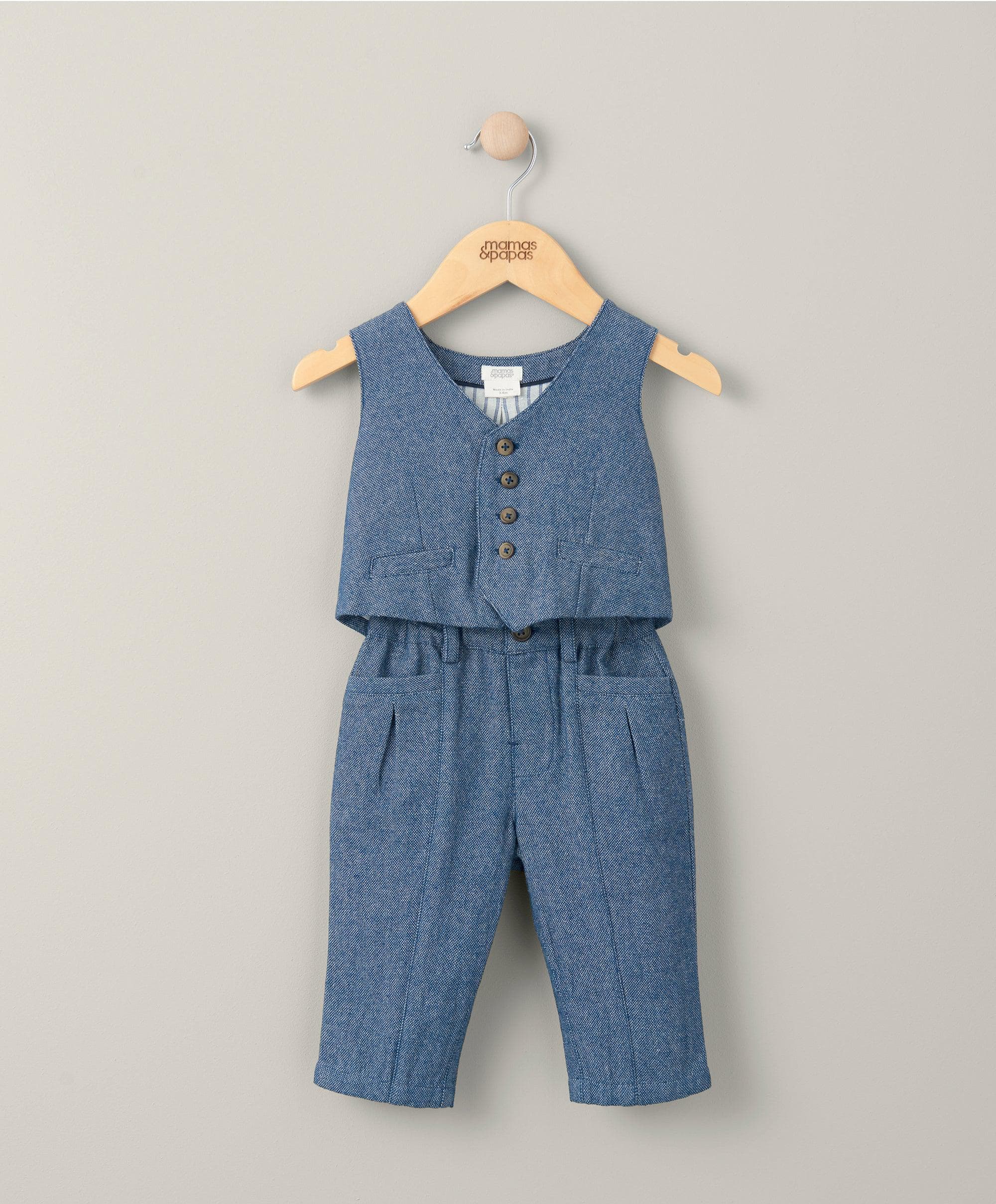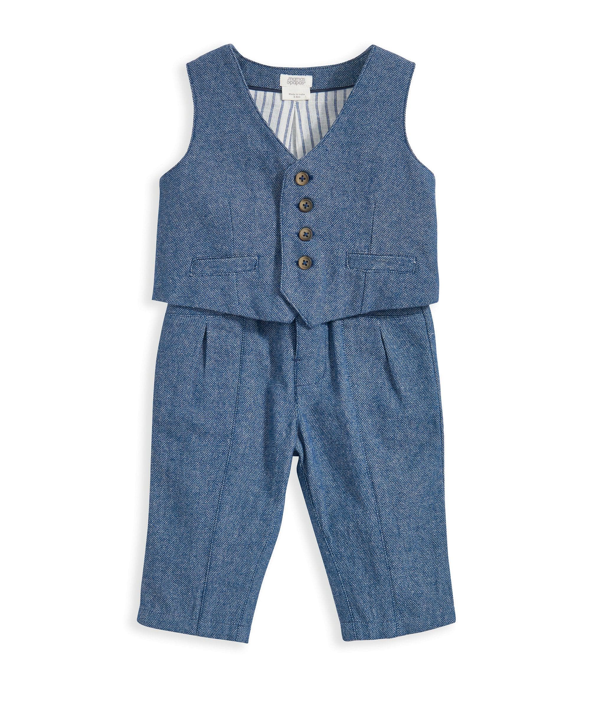 Two-piece set, includes waistcoat and trouser suit in matching blue brushed woven fabric. Trousers have easy elasticated waistband, with belt loops and button opening; functioning pockets in the front and mock pockets on the back. Waistcoat has gorgeous striped lining, button opening and mock pockets. Finish with matching flat cap in same fabric and lining.