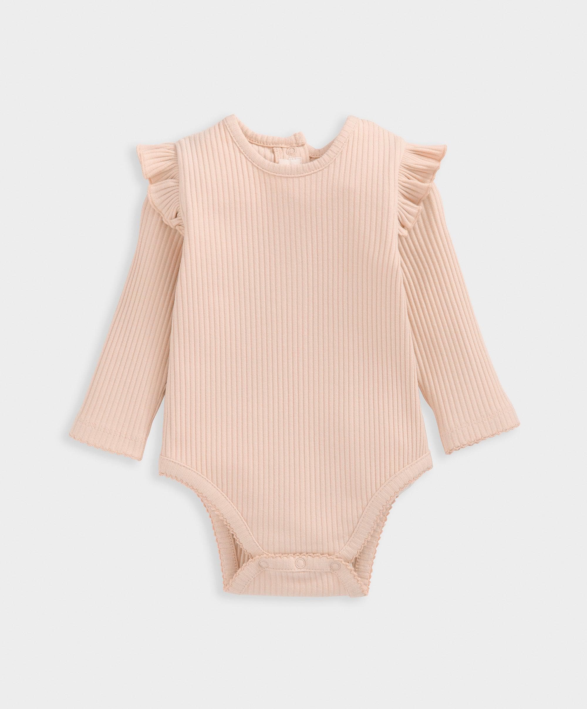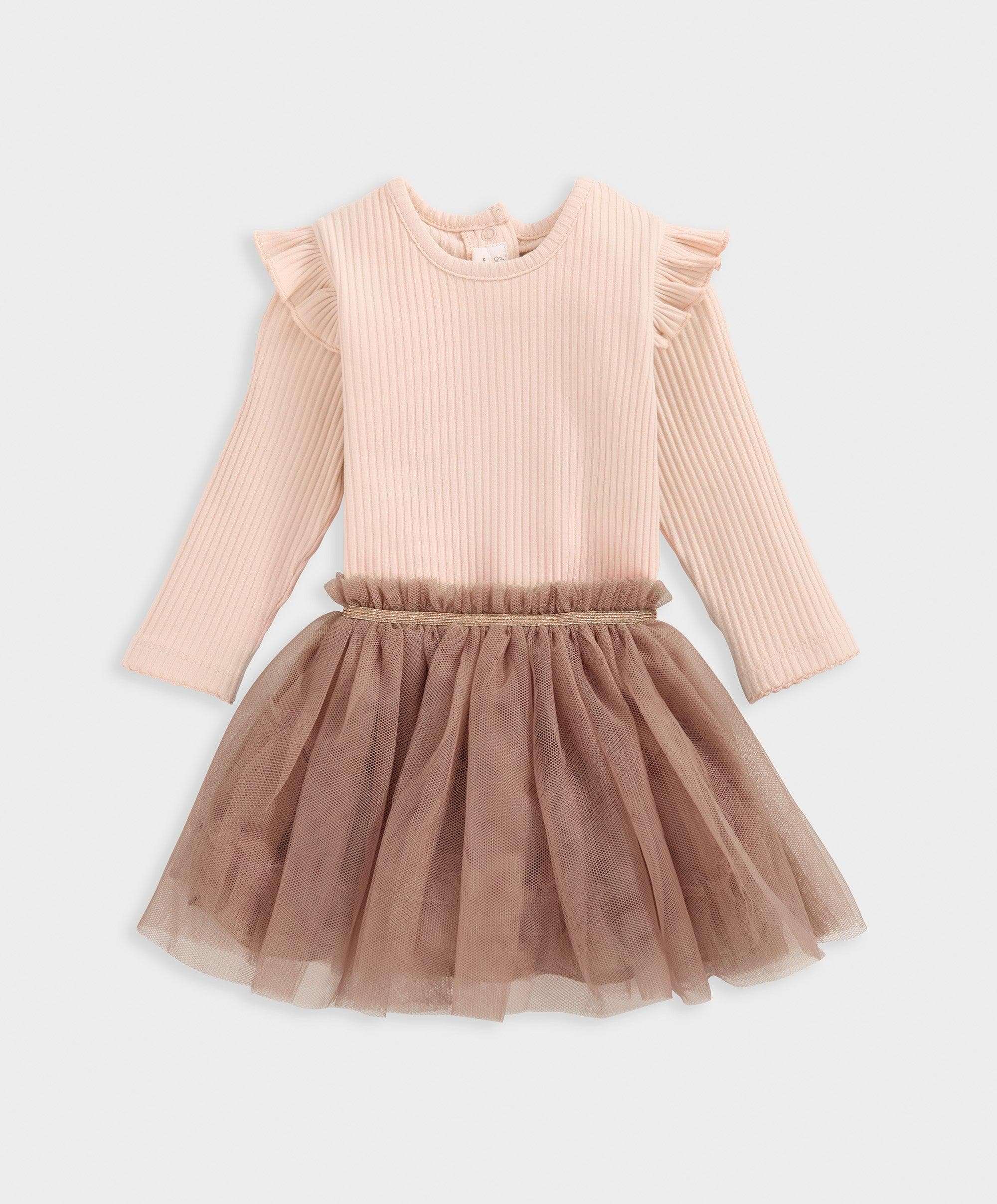 2-piece bodysuit and tutu set. Includes long-sleeved jersey ribbed bodysuit with frill detail and paper-bag style tulle mesh tutu with elasticated waistband