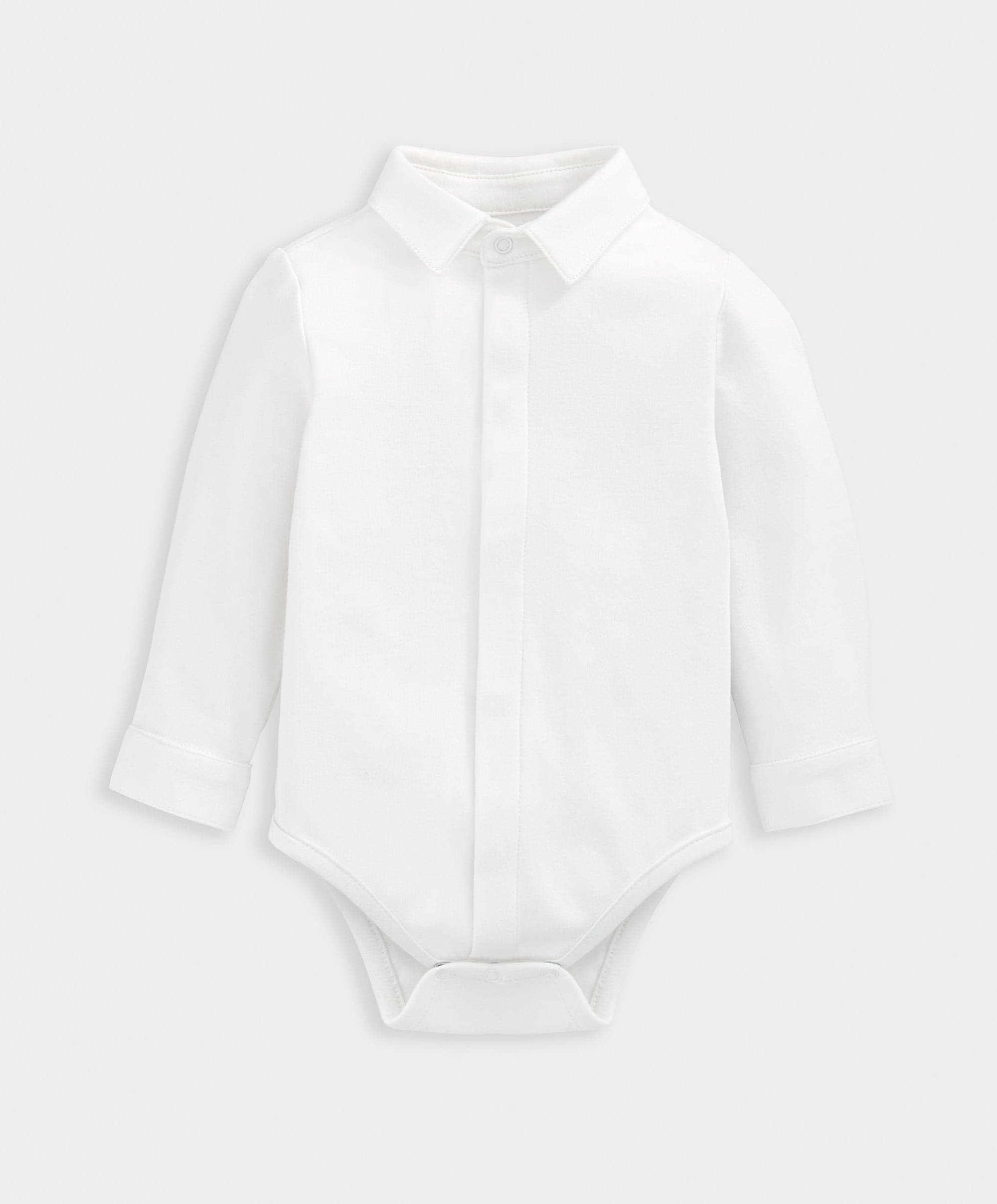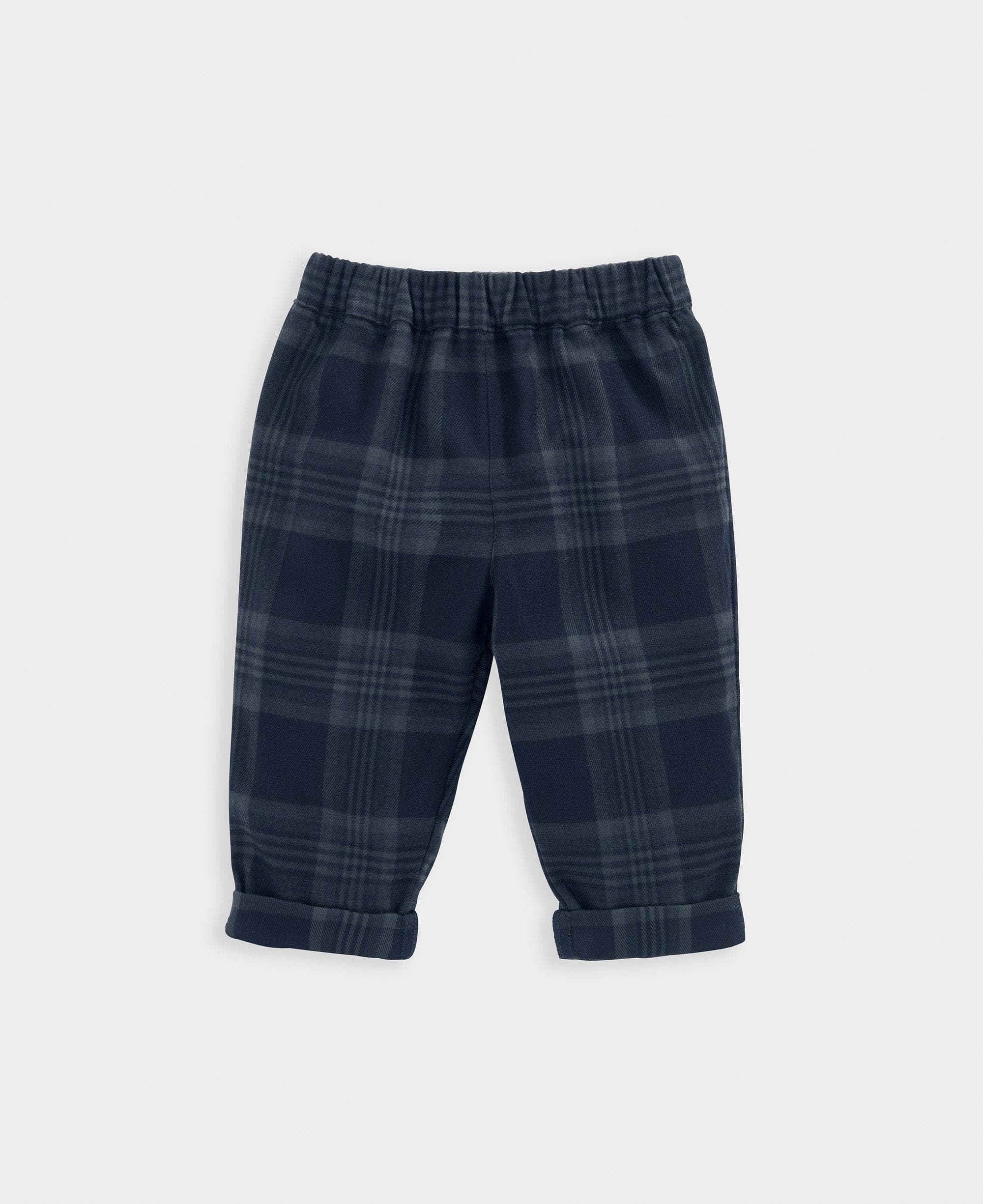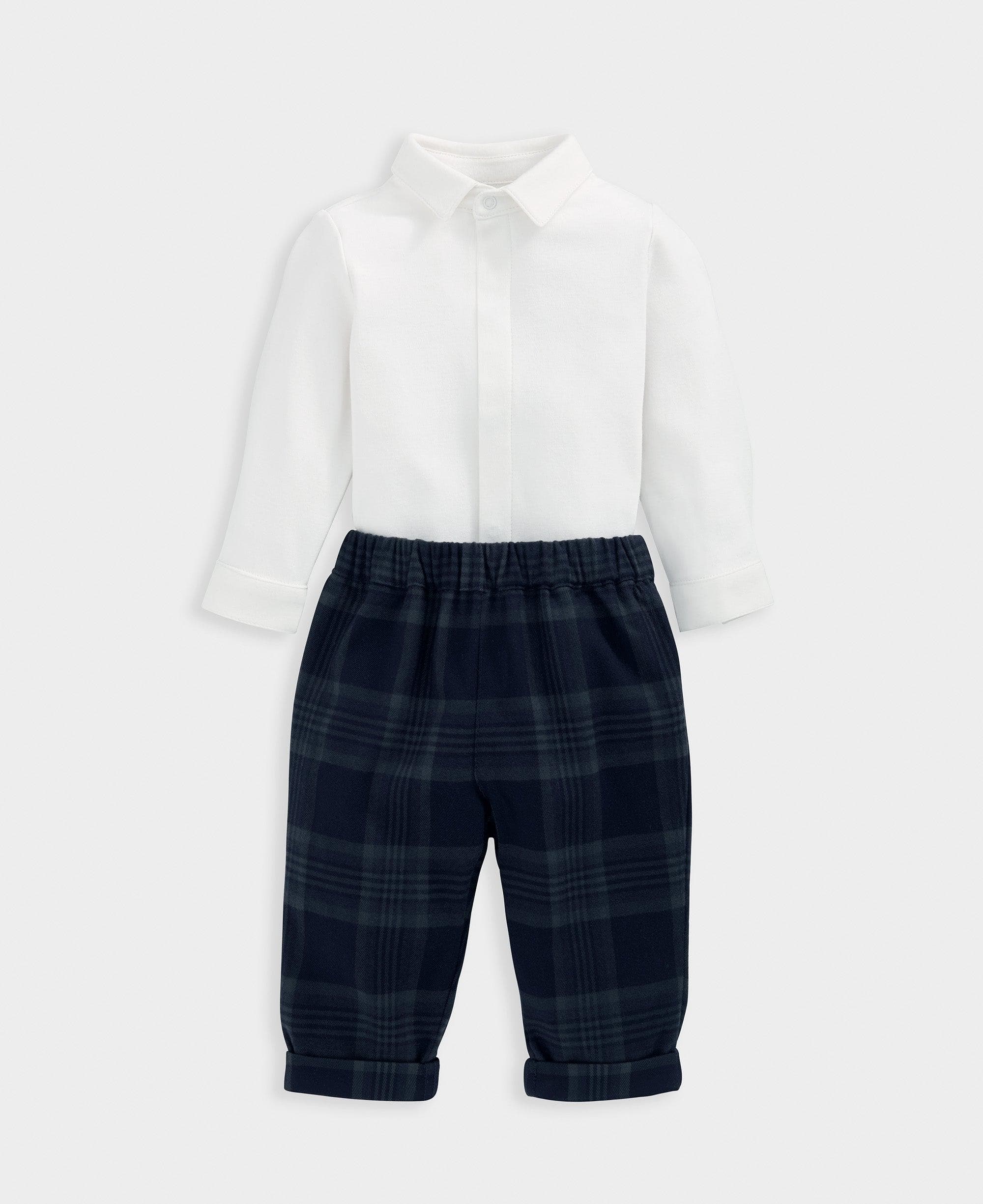 2-piece bodysuit and trouser set. Long-sleeved bodysuit with woven shirt collar detail and concealed fastening. Popper gusset fastening. Woven check trousers with front and back elasticated waistband.