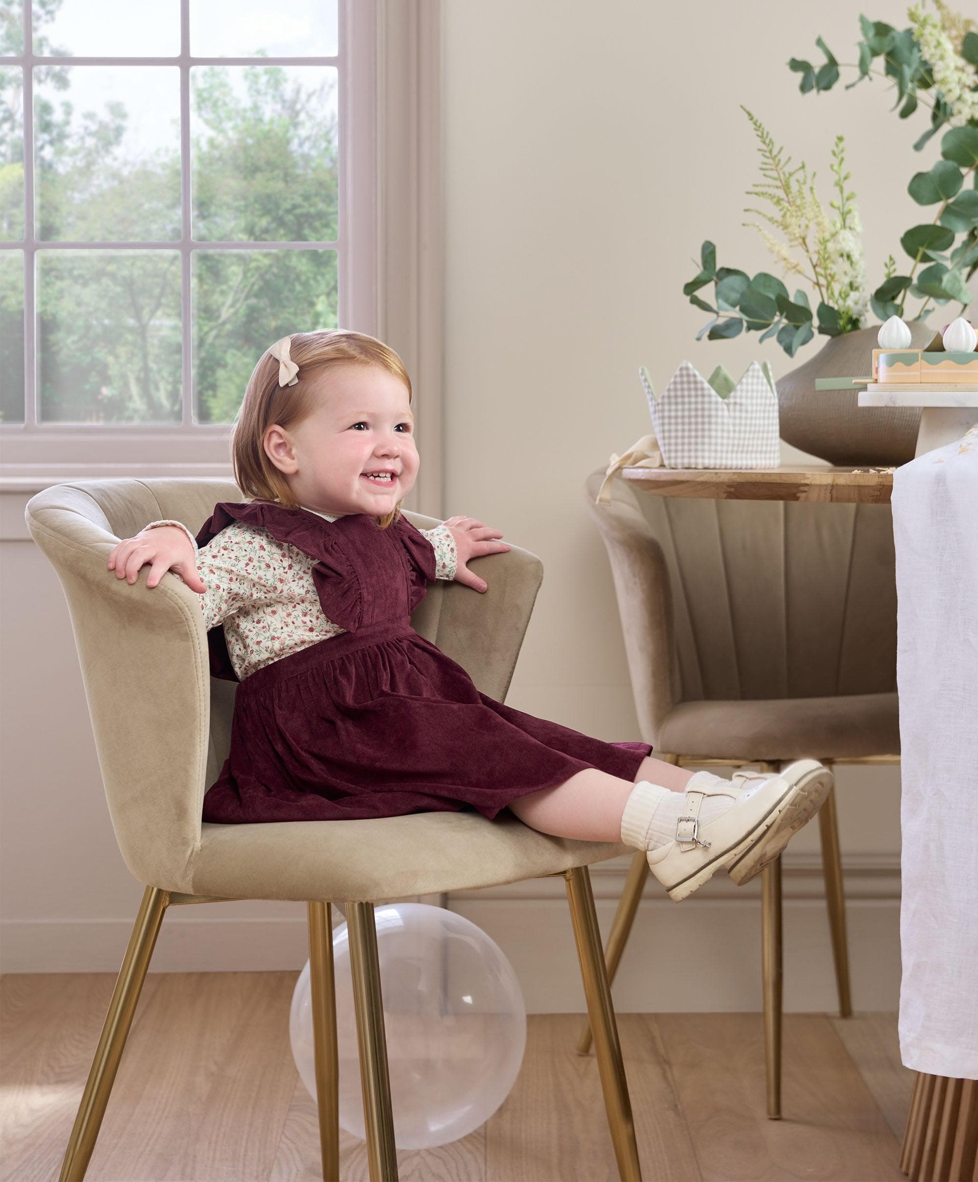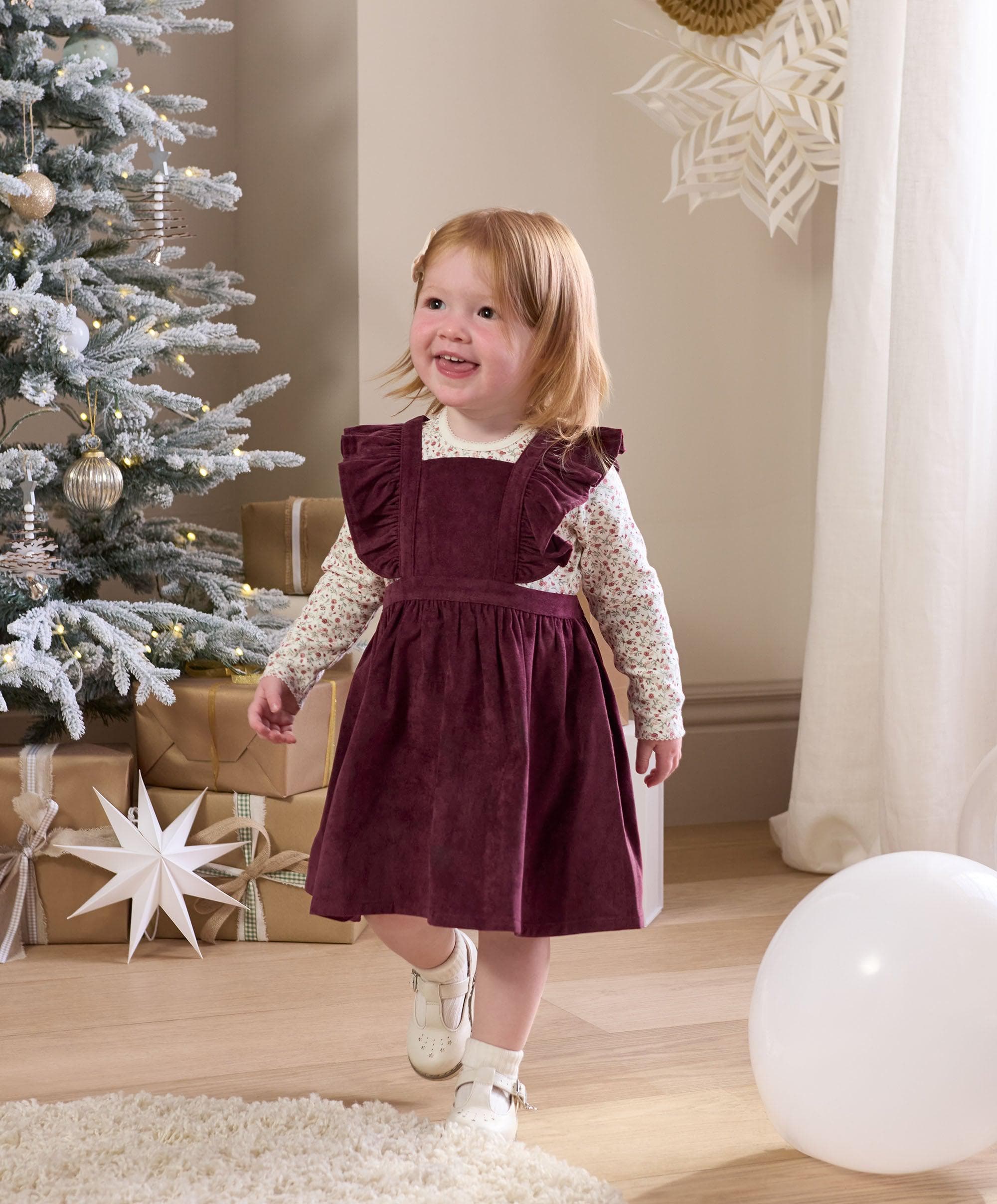 The perfect set to dress them up. 2 Piece winter ditsy Floral bodysuit with picot trim detailing and velvet pinafore dress.