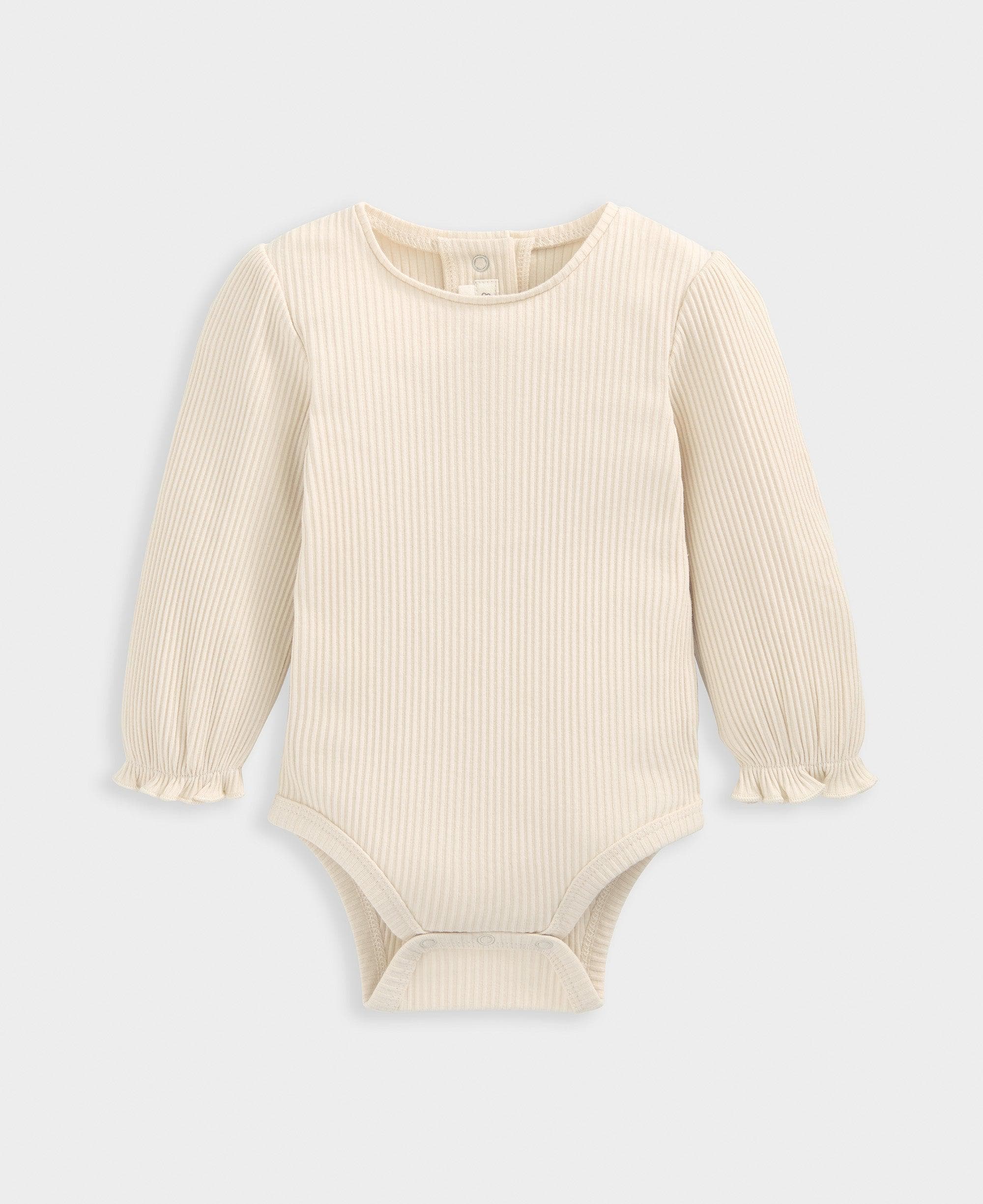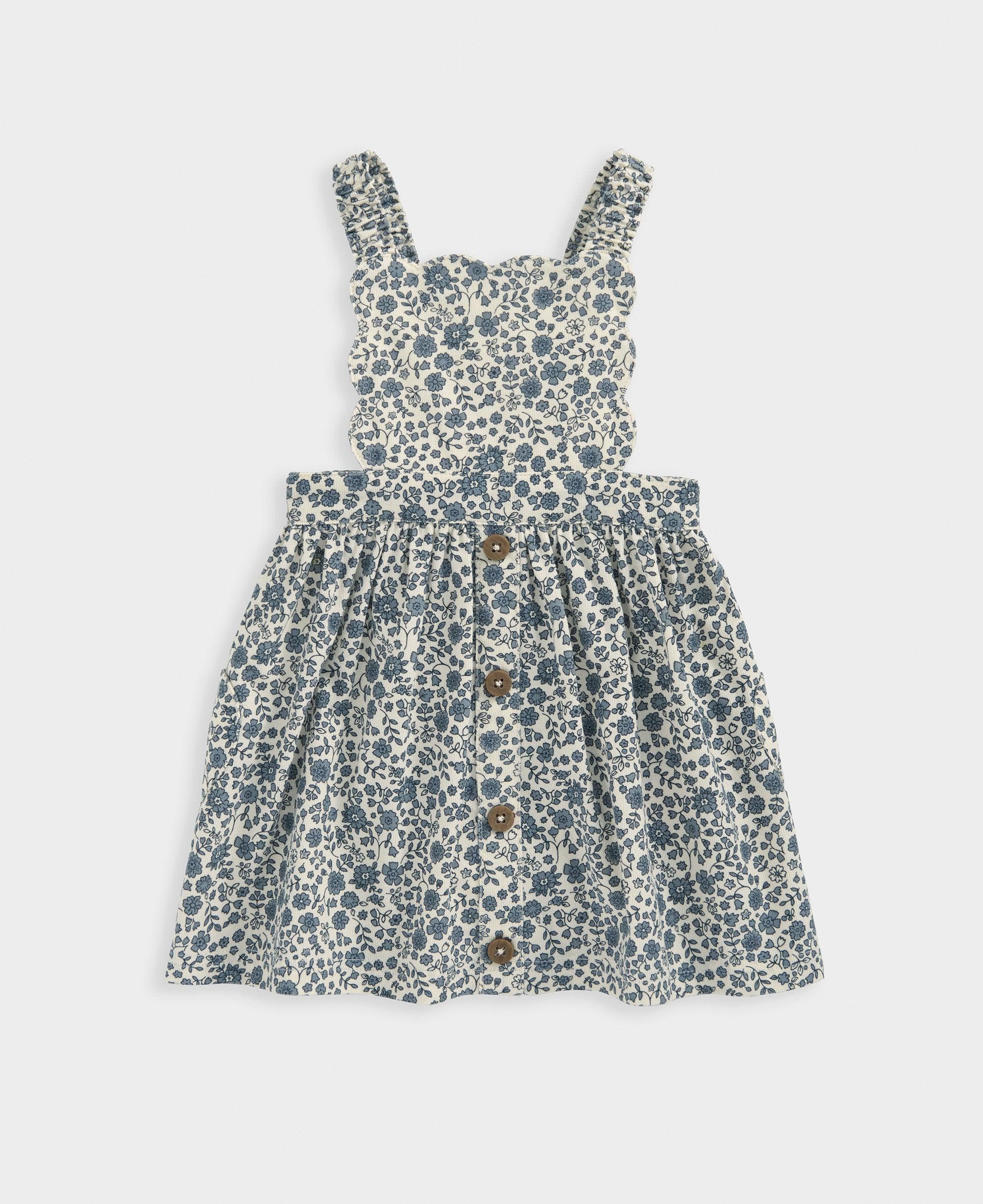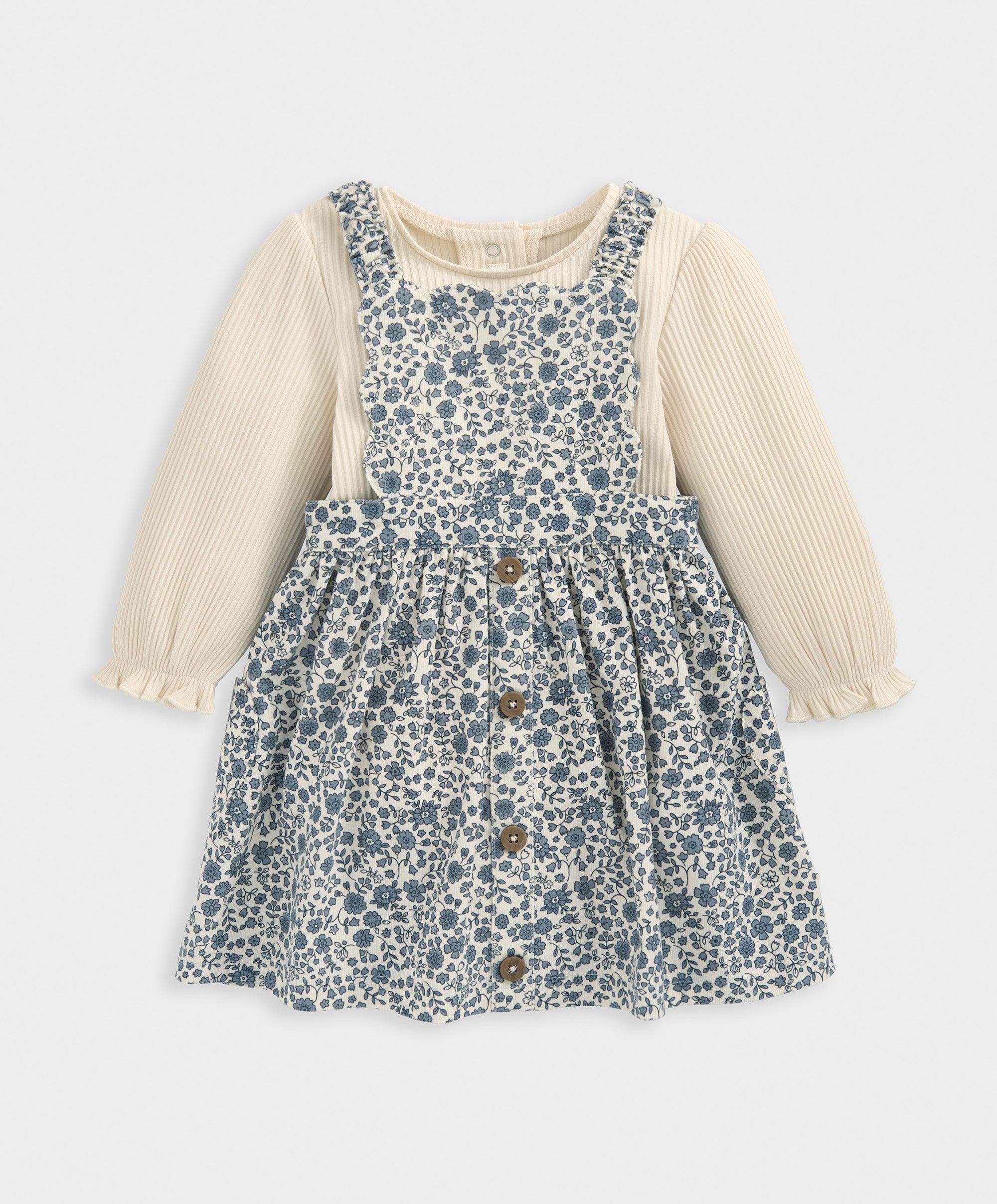 2-piece pinafore and ribbed bodysuit set. Baby cord pinafore with scallop bib, gathered waist, full skirt and heart-shaped patch pockets. Jersey ribbed bodysuit long-sleeved with elasticated frill cuffs. Popper fastening back and gusset.