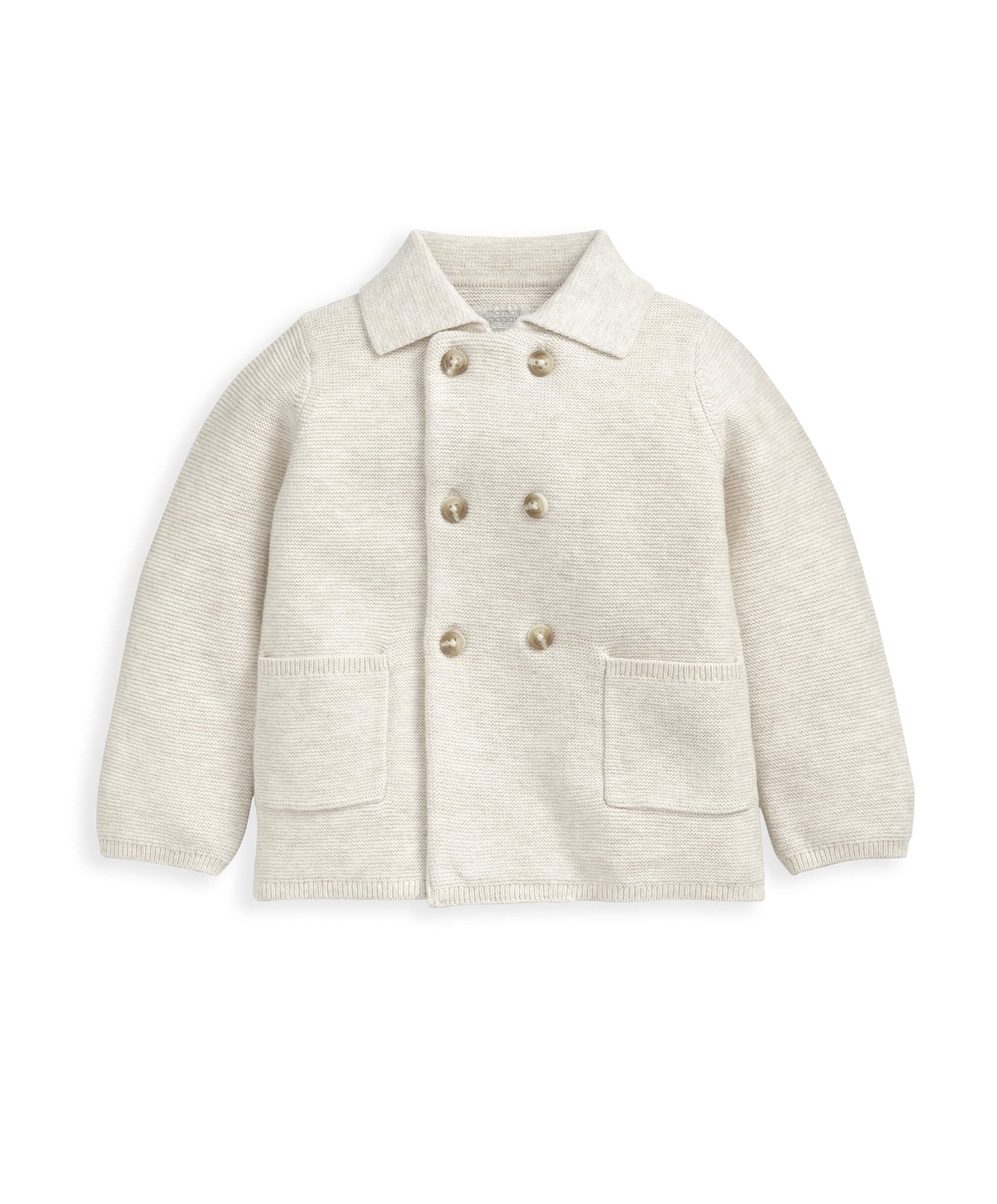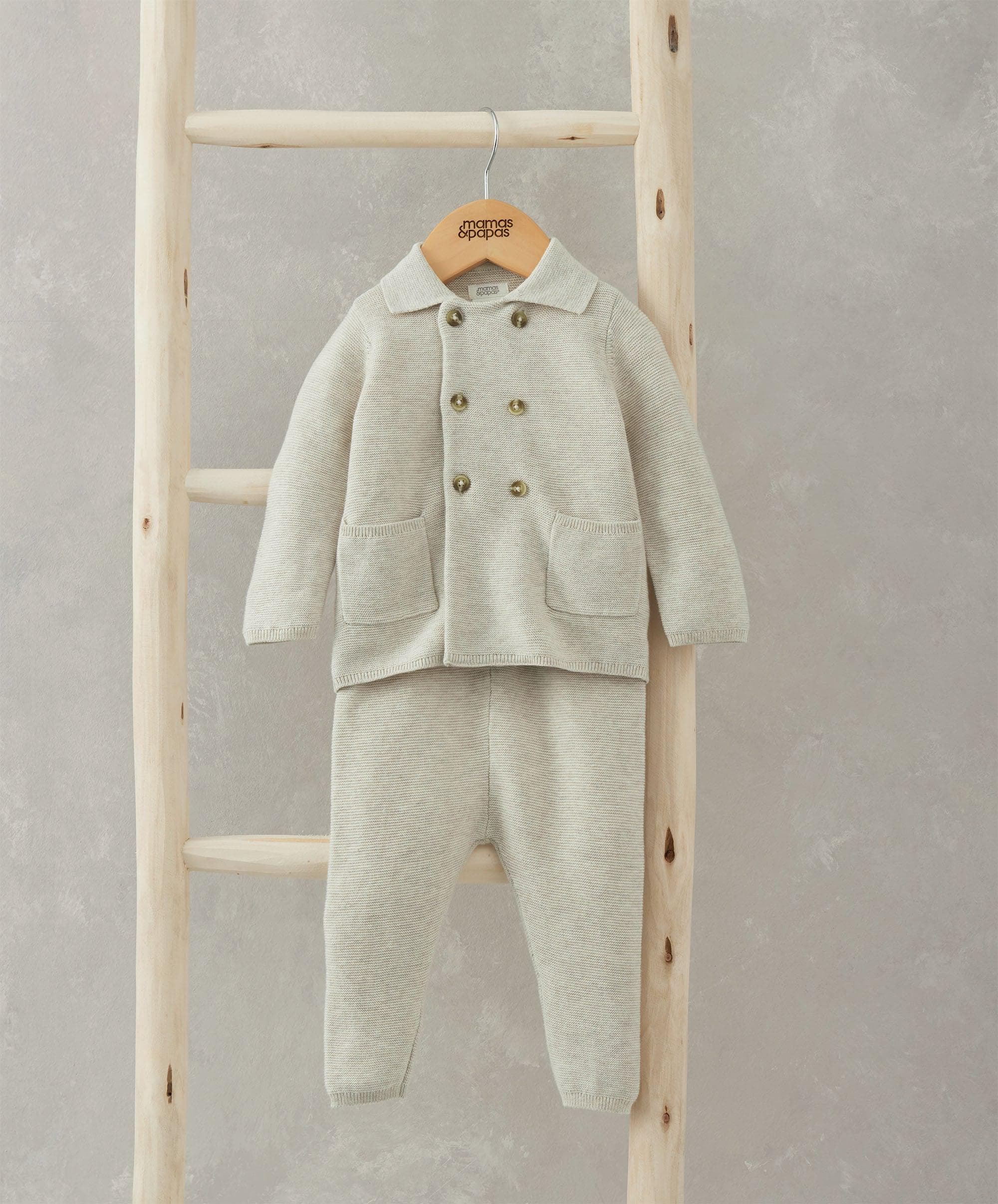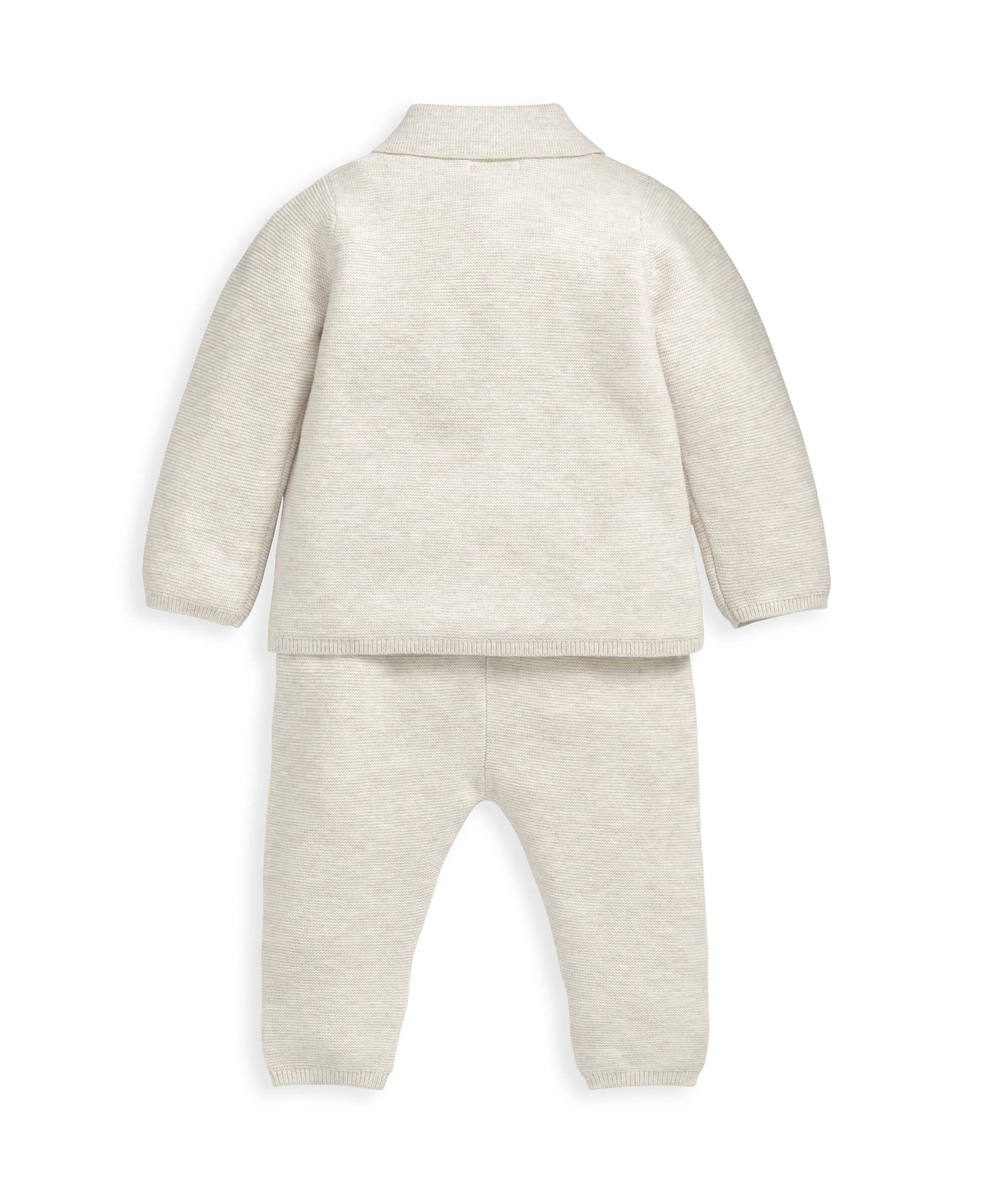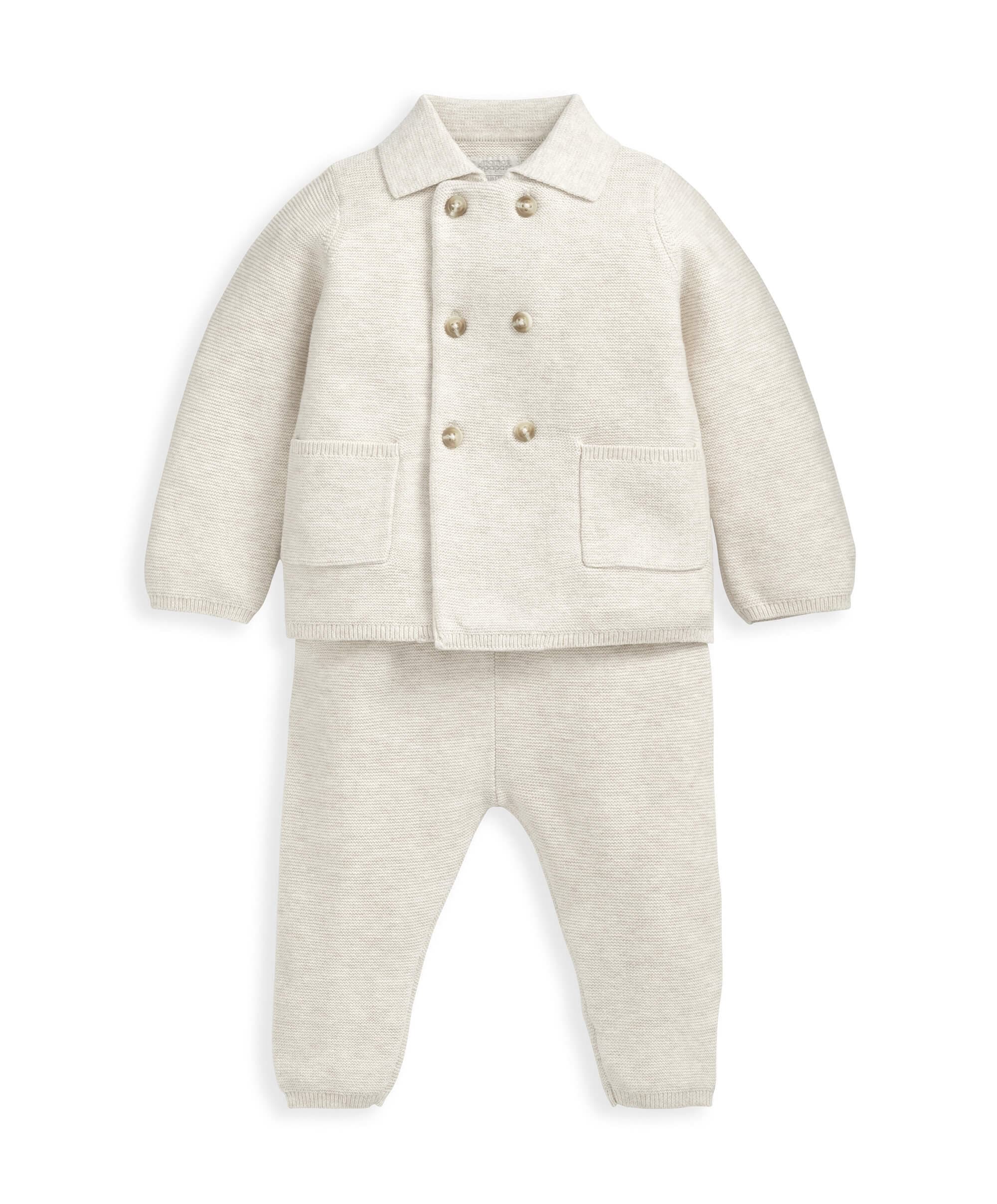 Adorable oatmeal 2-piece knit set. Cosy and comfy to wear, this smart outfit is made from ultra soft knitted 100% cotton fabric in a delicious shade of oatmeal.