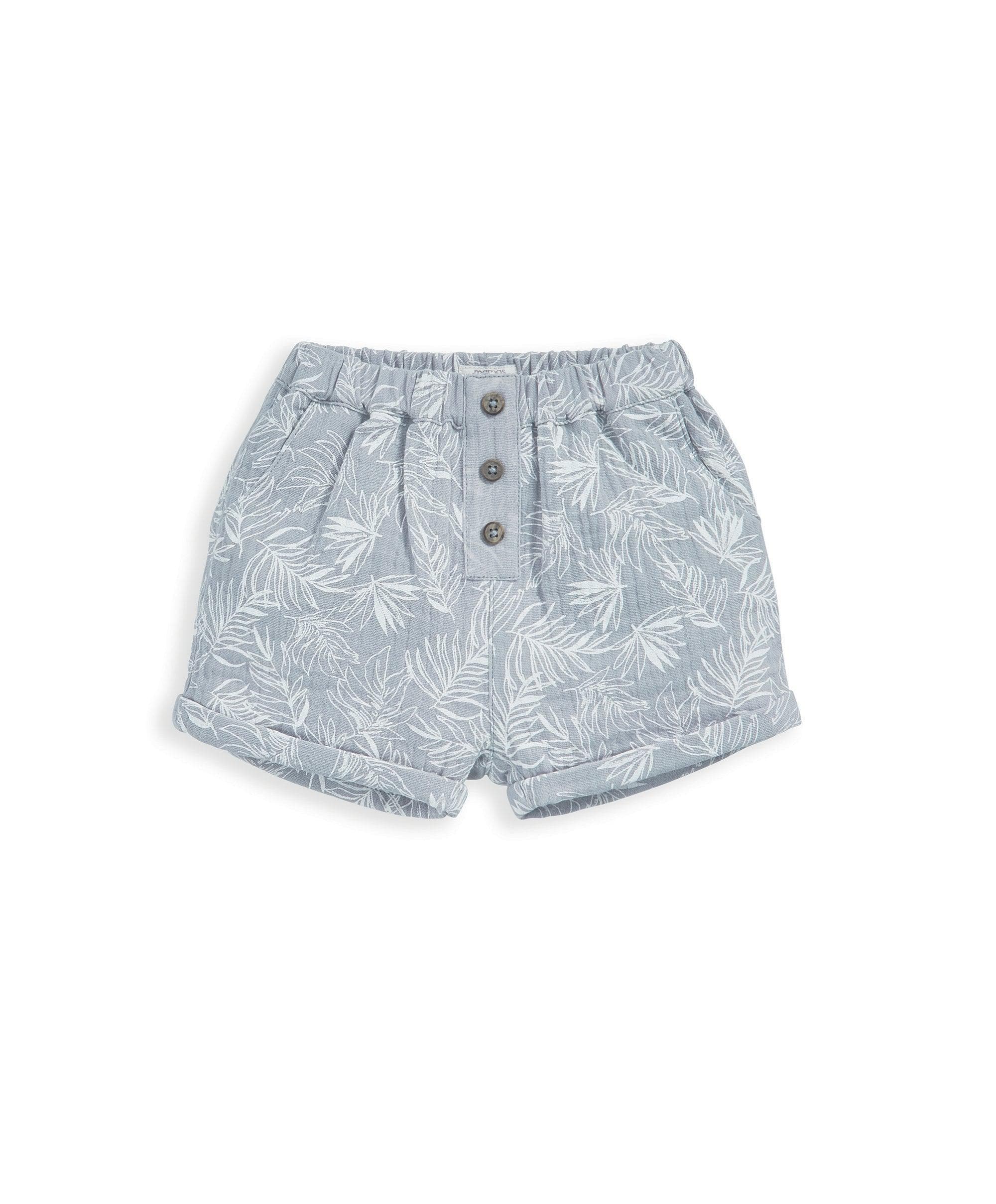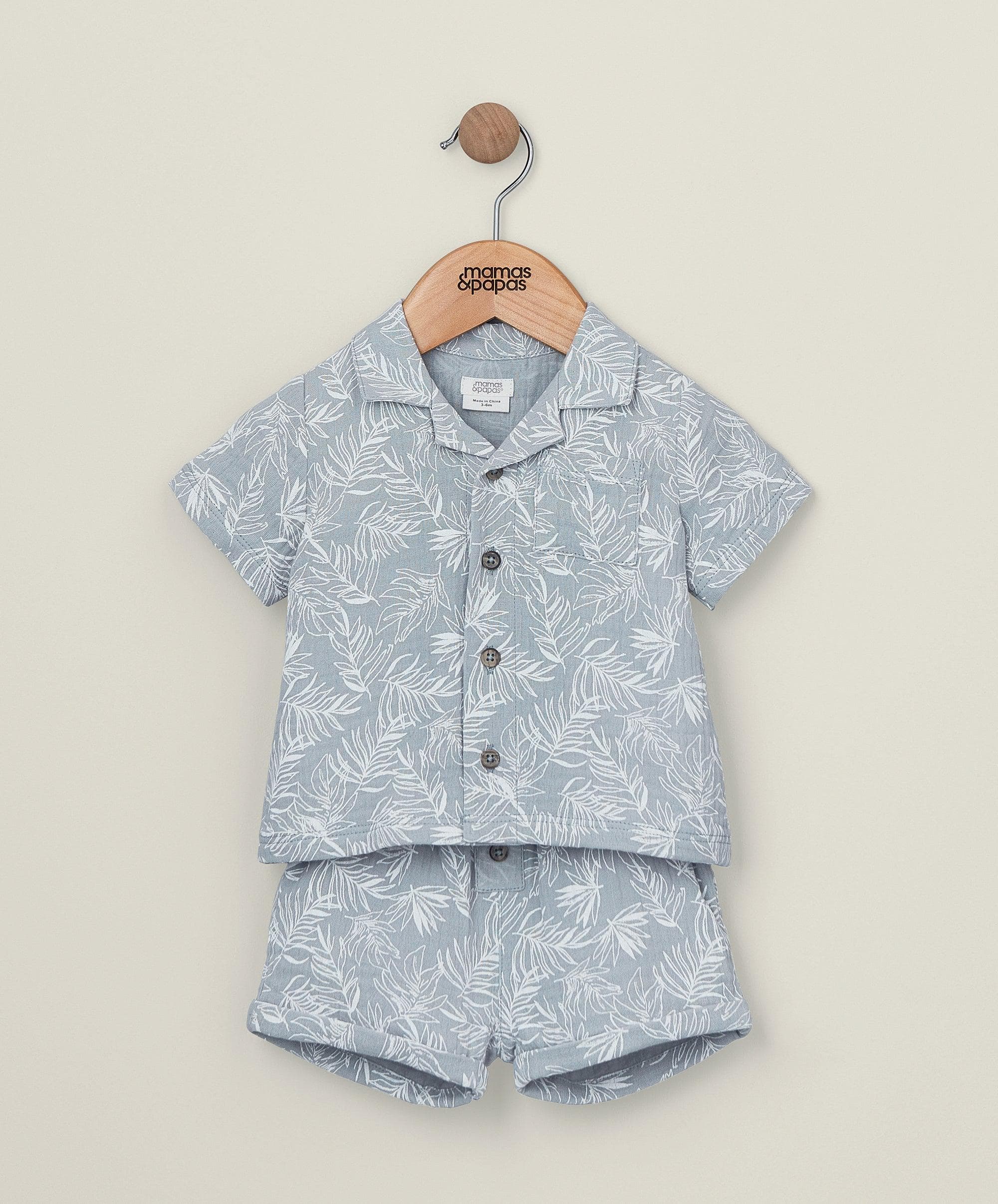 2-piece shirt and short set. Short-sleeved shirt in all-over Palm print. With front button opening, patch pocket and collar. Matching shorts in all-over Palm print, with non functional button detail, side pockets, patch back pocket and elasticated waistband.