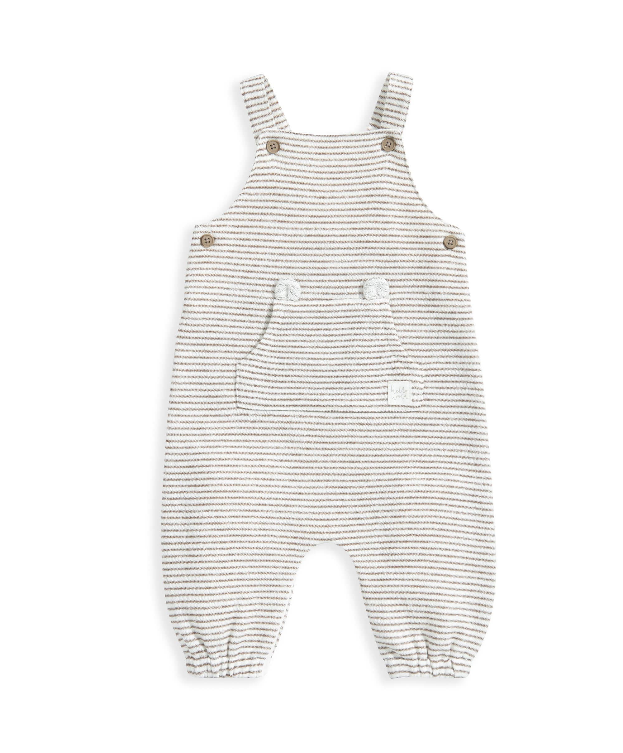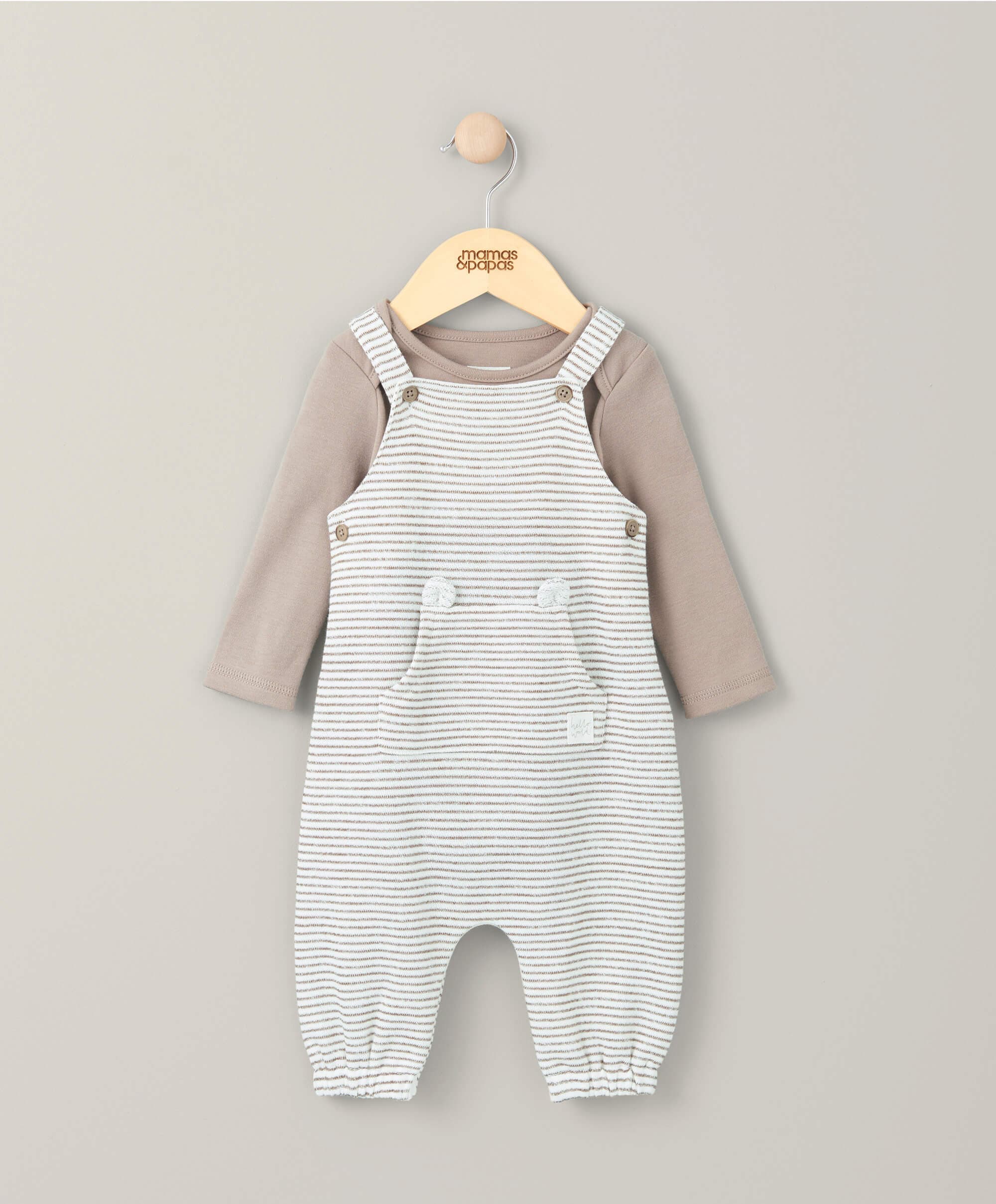 Unisex bodysuit and dungaree set. Includes soft mocha-coloured bodysuit, with comfy envelope neckline and popper crotch fastening for easy changing. Mocha and cream yarn-dyed striped dungarees with pocket and cute ear detail. Dungarees have button fastening on straps for easy adjusting and concealed poppers at crotch for easy changing. A beautiful easy-to-wear unisex set.